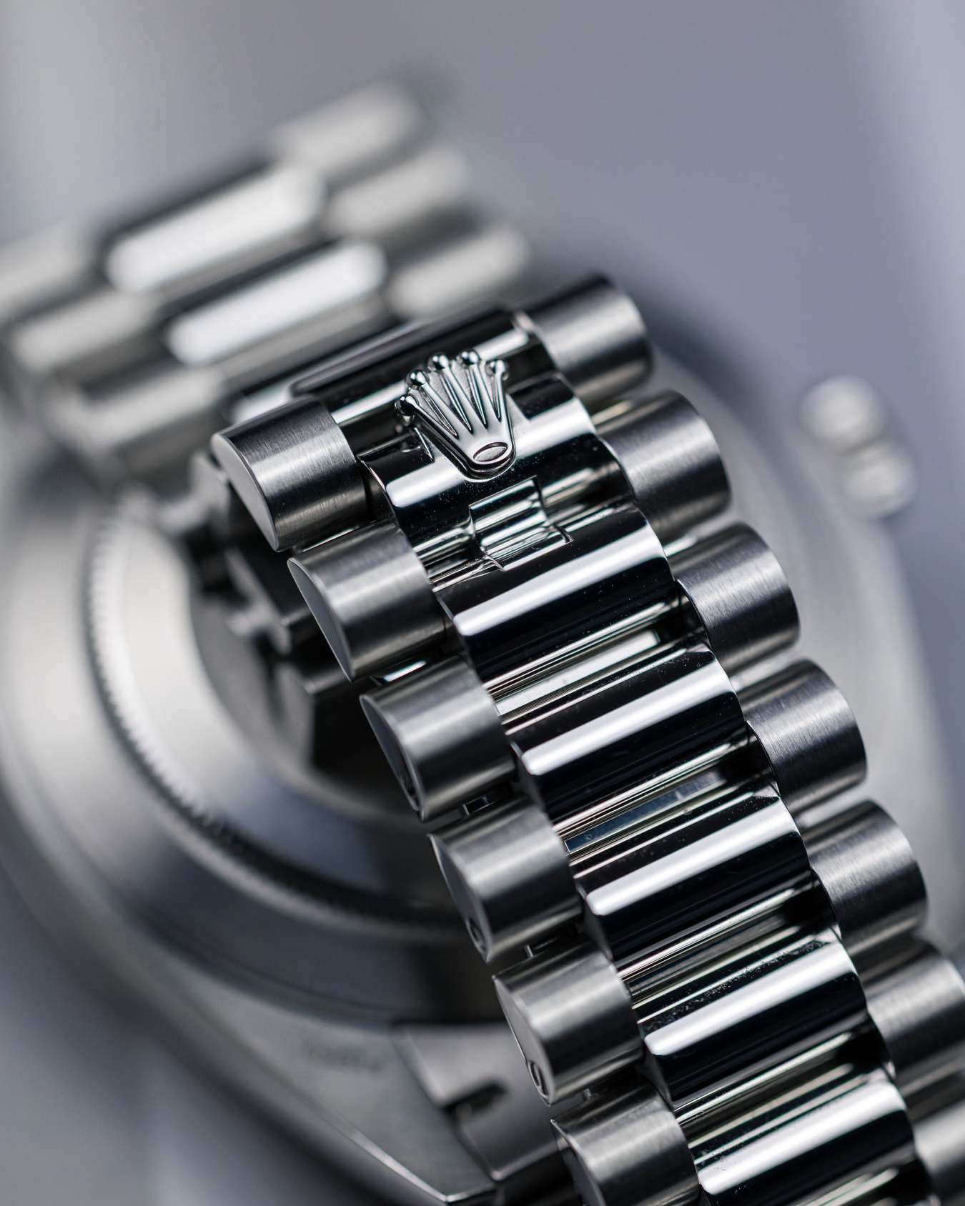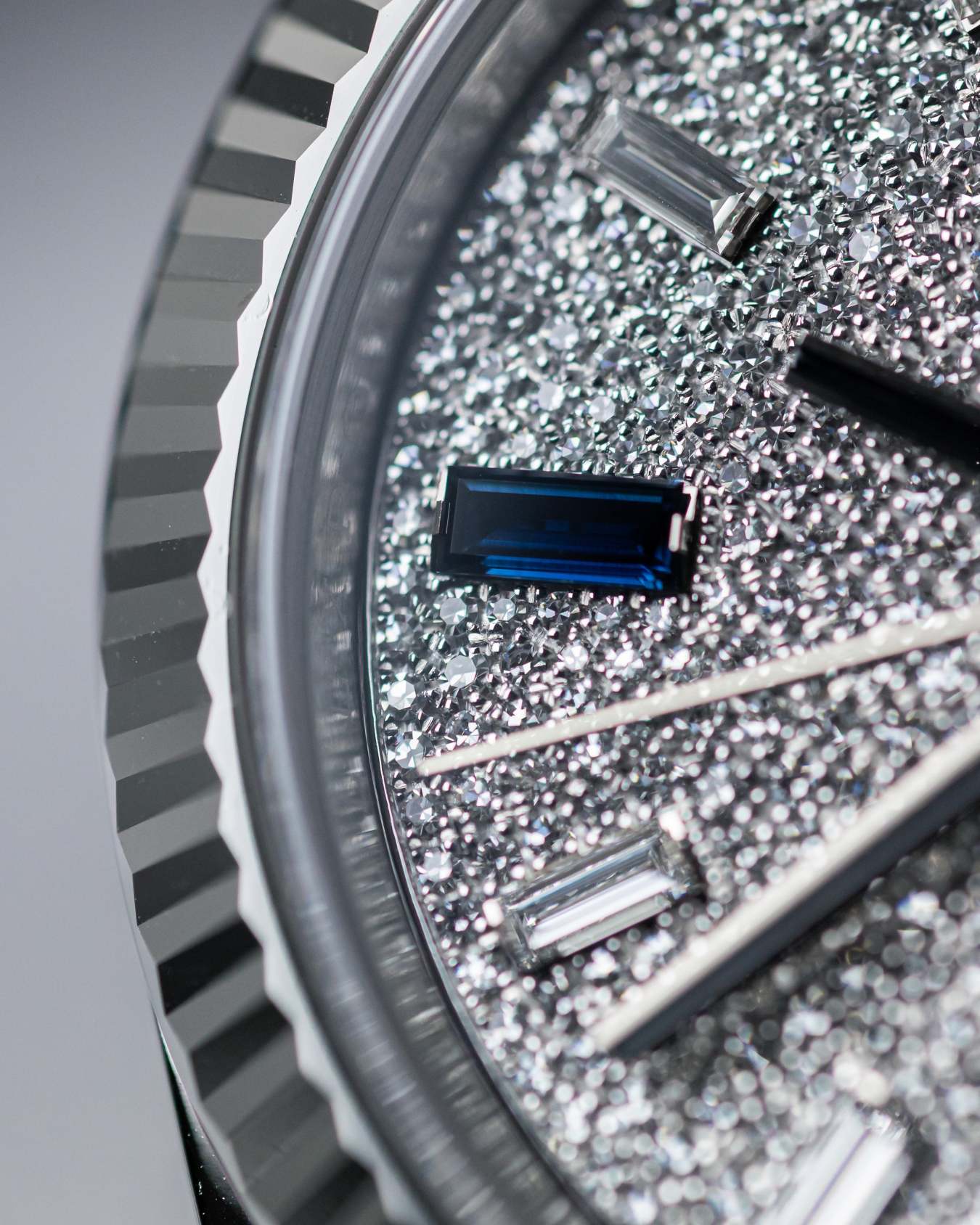 Platinum Day-Date featuring 8 baguette-cut diamonds, 2 baguette cut sapphires at 6 and 9 o’clock on a diamond-paved dial on the president bracelet.