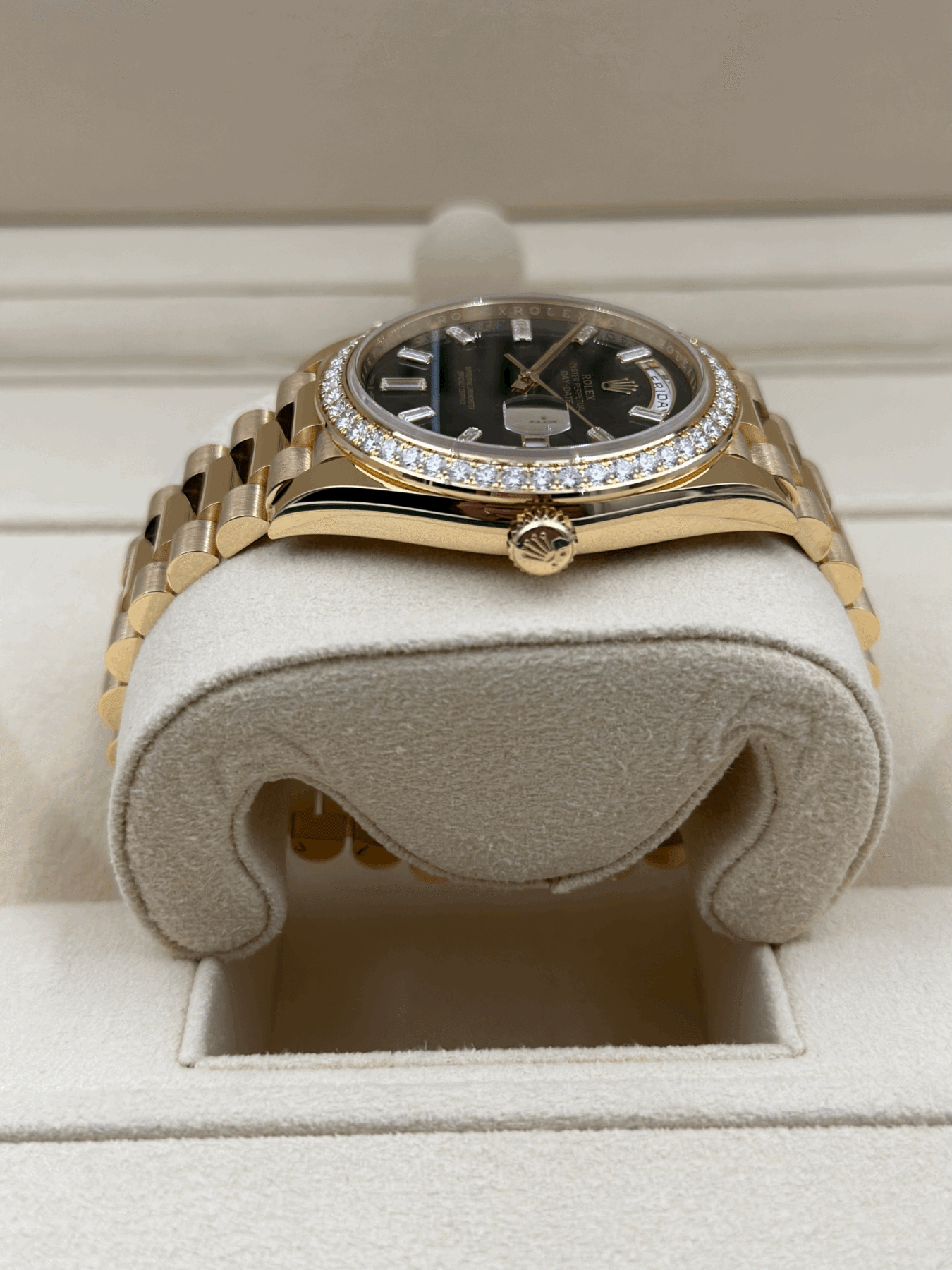 Rolex Perpetual Day-Date 40 Watch of 18k Yellow Gold with diamonds Black dial set with diamonds with hour markers of 10 baguette-cut diamonds. Screw-down, Twinlock double waterproofness system. Scratch-resistant sapphire crystal, Cyclops lens over the date. Centre hour, minute, and seconds hands Instantaneous day and date in apertures, unrestricted rapid-setting. Stop-seconds for precise time setting. The bezel of 18k Yellow Gold set with 48 diamonds. The Watch comes with Mechanical Self-winding Movement & 3255 Caliber w/ 31 jewels & 70 hours power reserve. The President 18k Yellow Gold bracelet with concealed folding Crownclasp. The Watch is with a Rolex Watch box, Rolex Warranty Card. Covered with Rolex Warranty.