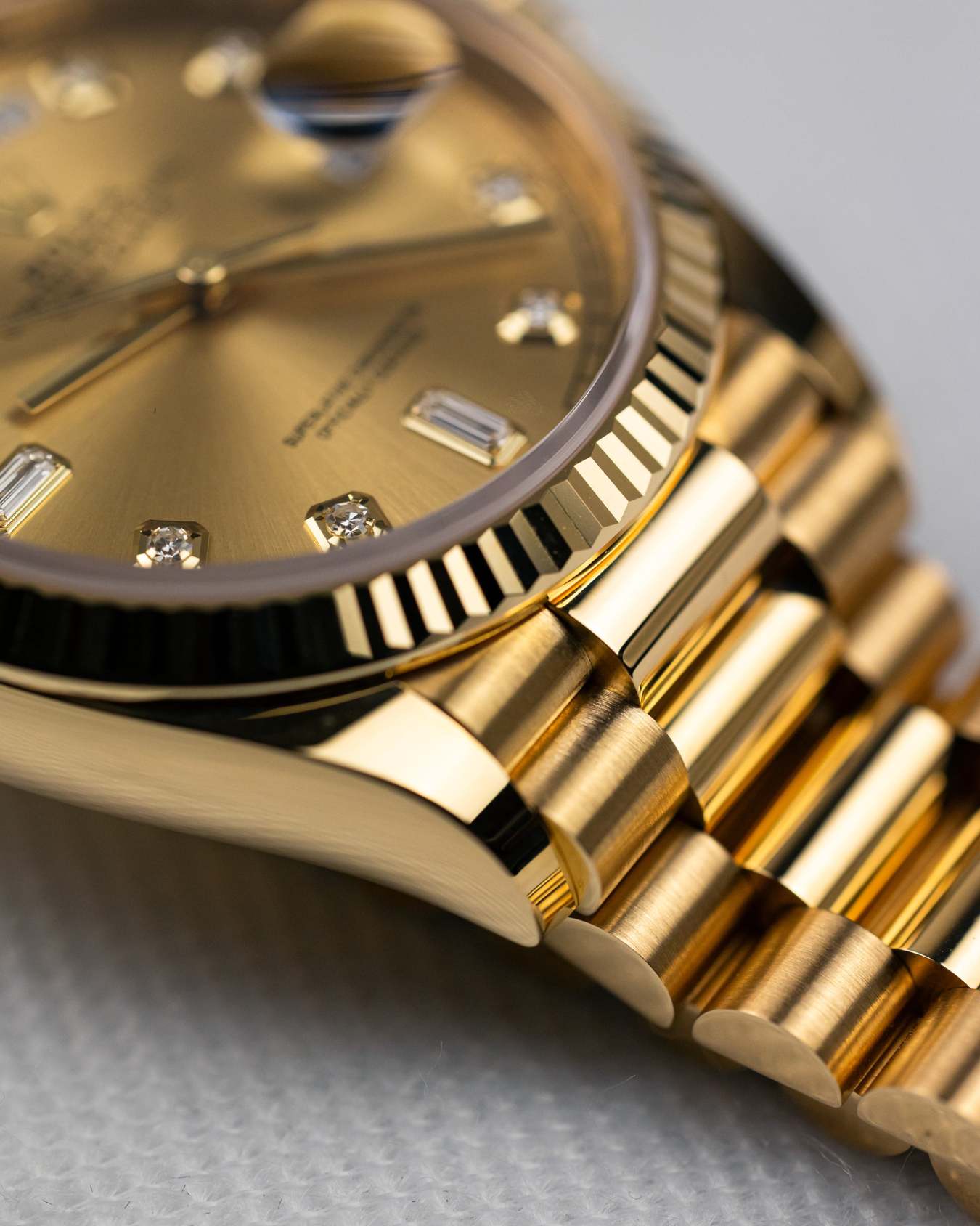 The perfect his and hers watch sized at 36mm. Presented with the champagne dial with diamond hour markers matching the iconic president bracelet in yellow gold.