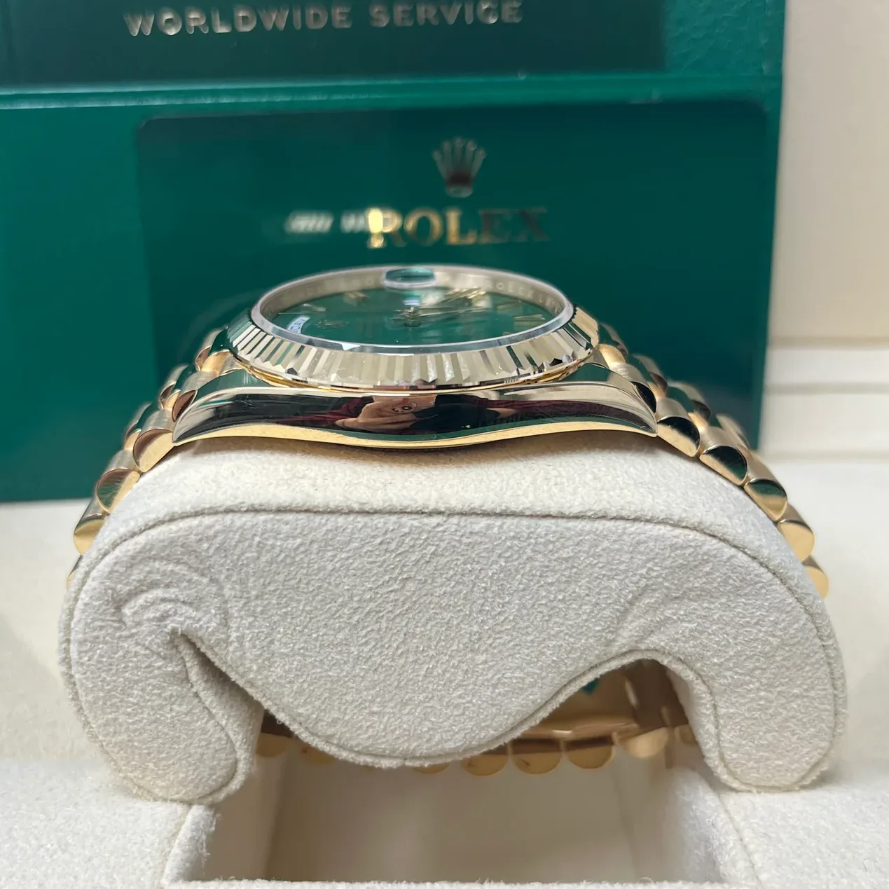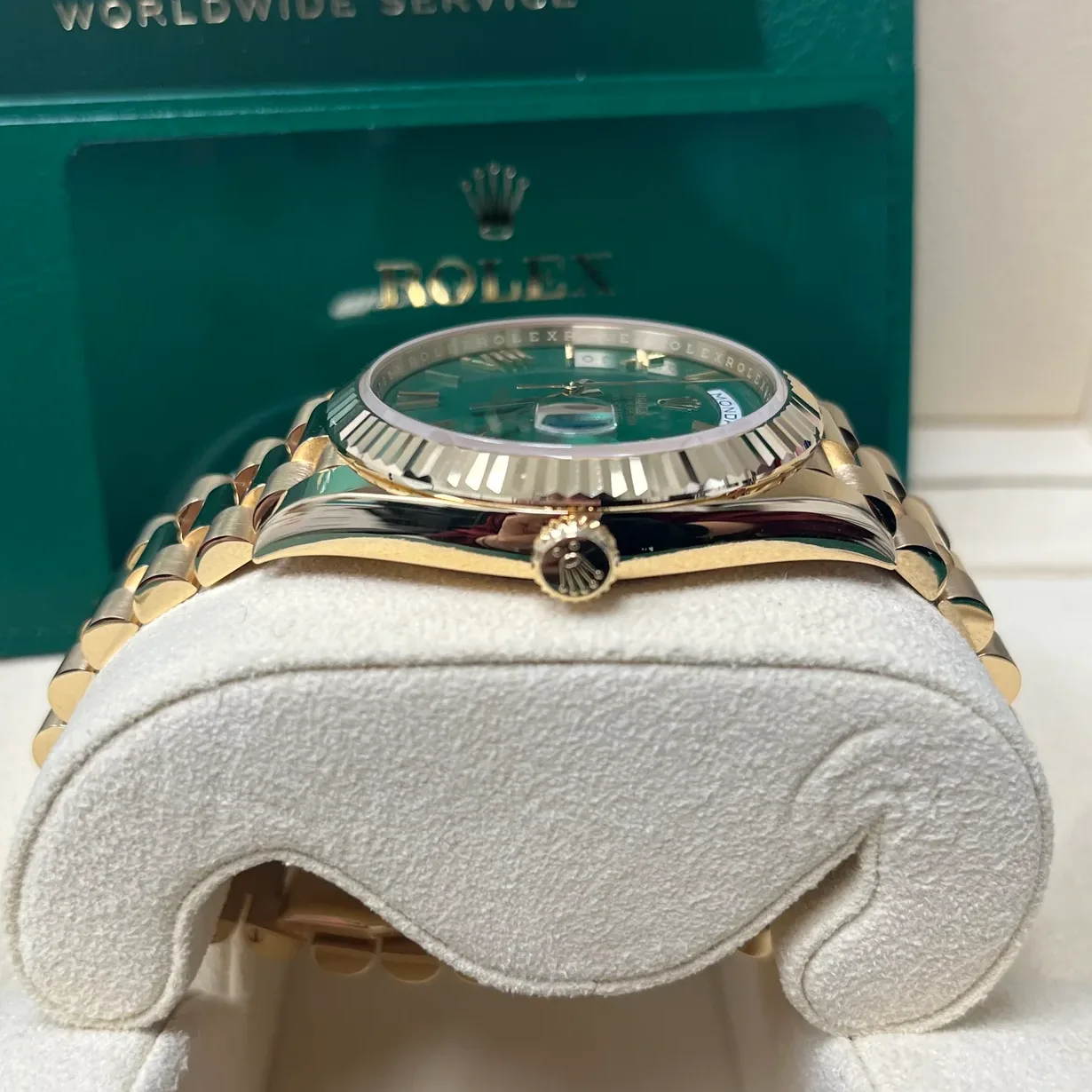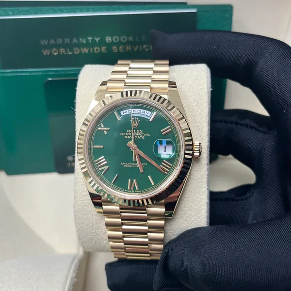 The Rolex fluted bezel is a mark of distinction. Originally, the fluting of the Oyster bezel had a functional purpose: it served to screw the bezel onto the case helping to ensure the waterproofness of the watch. It was therefore identical to the fluting on the case back, which was also screwed onto the case for waterproofness, using specific Rolex tools. Over time, the fluting became an aesthetic element, a genuine Rolex signature feature. Today the fluted bezel is a mark of distinction, in gold on this Day-Date 40.
