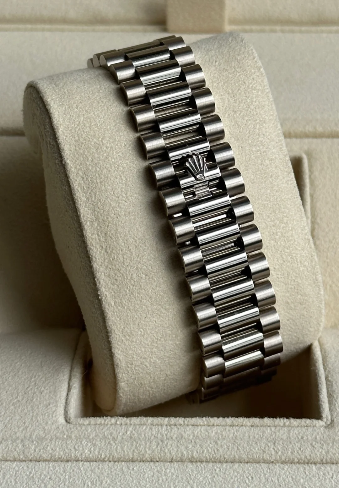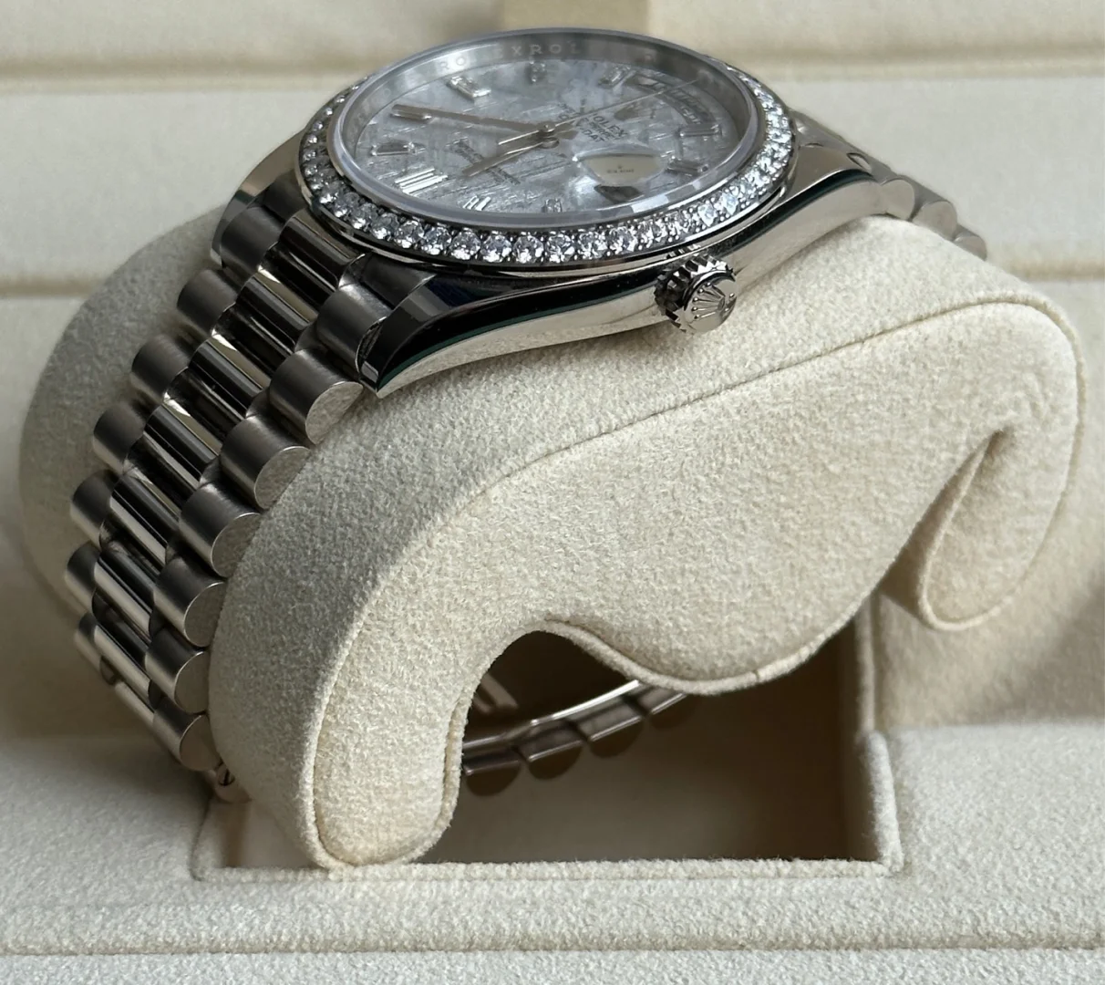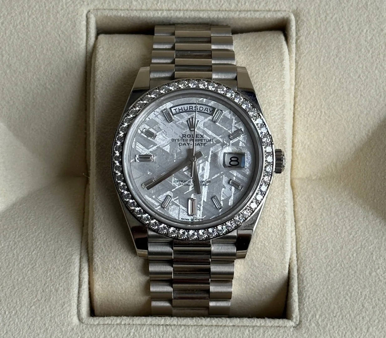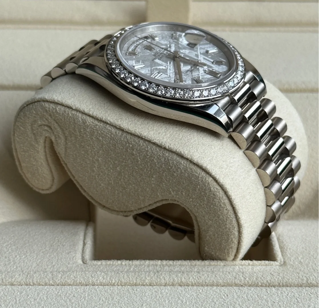 This dial features 10 baguette-cut diamonds. Formed in the far reaches of the solar system, metallic meteorite comes from an asteroid that exploded millions of years ago. On the voyage between planets, fragments of this natural extraterrestrial material, primarily composed of iron and nickel, cool by a few degrees Celsius every million years, creating unique, distinctive crystallization within the material that is impossible to recreate on Earth. Metallic meteorite is rare and challenging to work with, but once it is cut into thin sections and a chemical treatment is applied, the great beauty of its interwoven internal structure is revealed. These fascinating and varied formations are known as Widmanstätten patterns. For its dials, Rolex works with leading experts in the field and selects only the sections of meteorite with a particularly well-formed surface rich in different shapes and reflections.