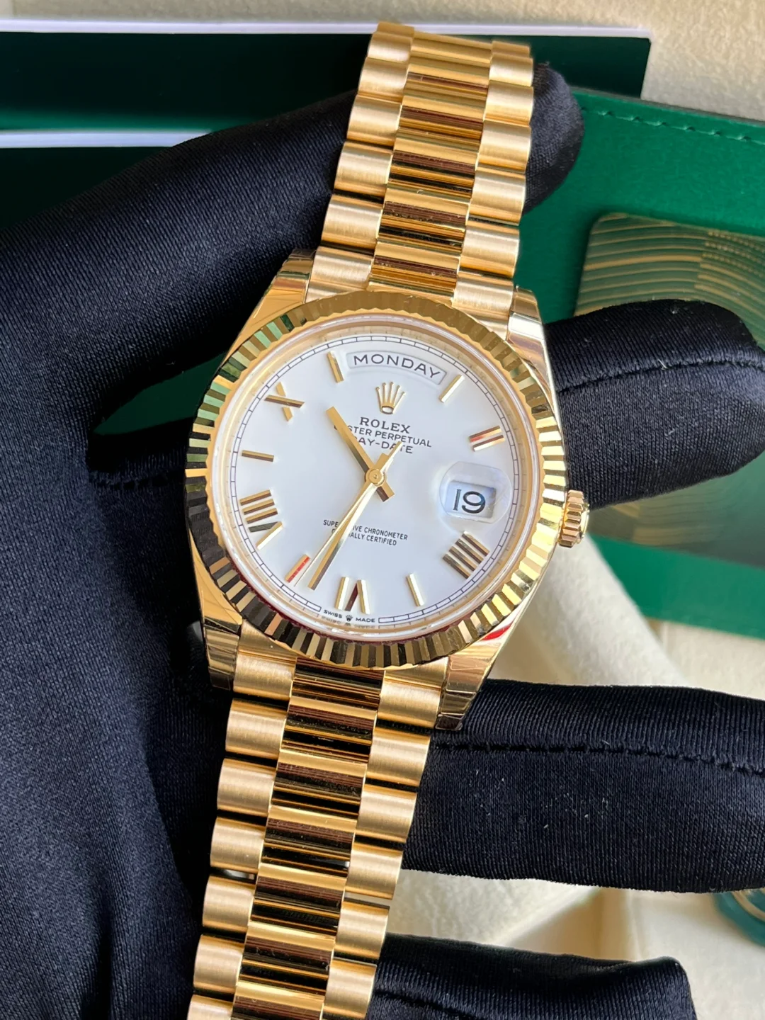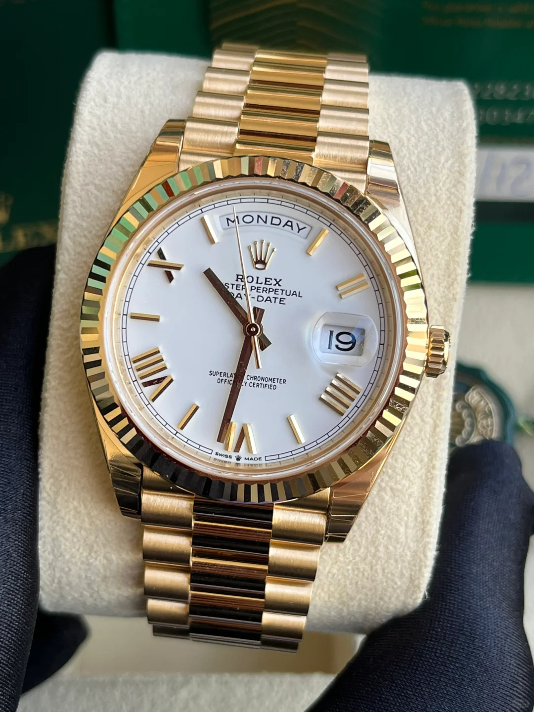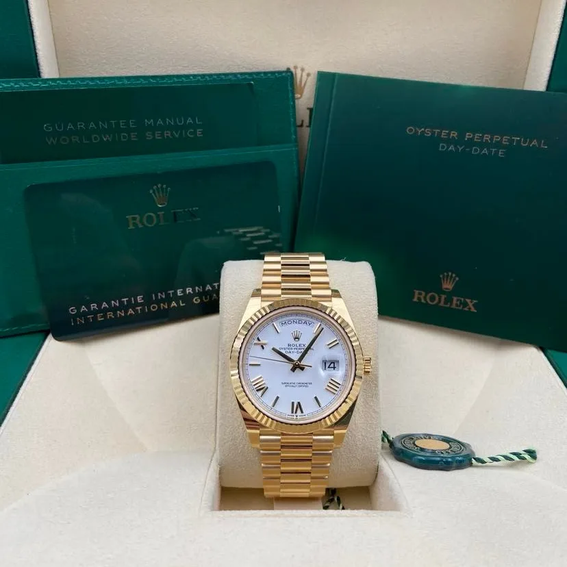 The Rolex fluted bezel is a mark of distinction. Originally, the fluting of the Oyster bezel had a functional purpose: it served to screw the bezel onto the case helping to ensure the waterproofness of the watch. It was therefore identical to the fluting on the case back, which was also screwed onto the case for waterproofness, using specific Rolex tools. Over time, the fluting became an aesthetic element, a genuine Rolex signature feature. Today the fluted bezel is a mark of distinction, in gold on this Day-Date 40.