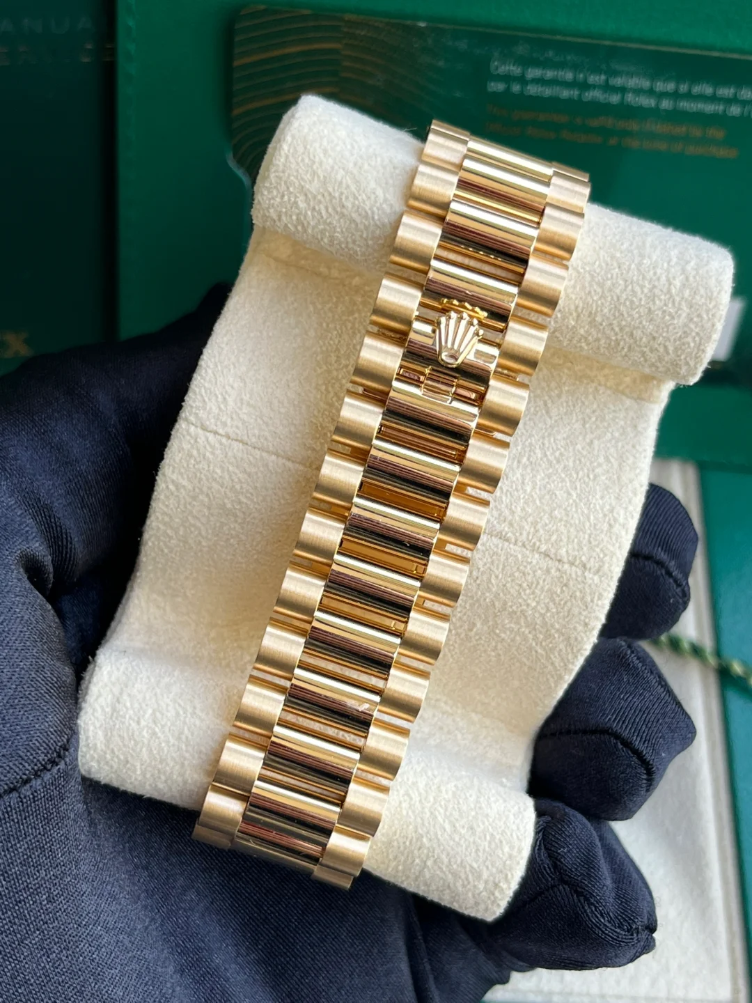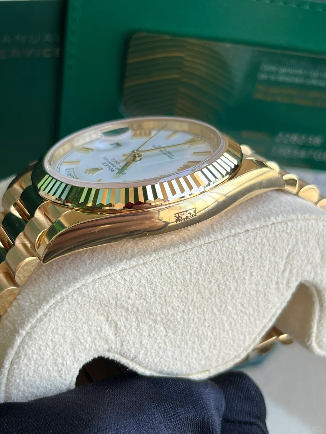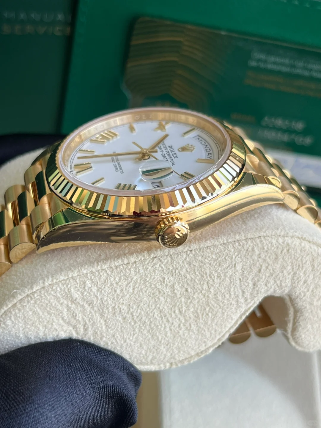 The Rolex fluted bezel is a mark of distinction. Originally, the fluting of the Oyster bezel had a functional purpose: it served to screw the bezel onto the case helping to ensure the waterproofness of the watch. It was therefore identical to the fluting on the case back, which was also screwed onto the case for waterproofness, using specific Rolex tools. Over time, the fluting became an aesthetic element, a genuine Rolex signature feature. Today the fluted bezel is a mark of distinction, in gold on this Day-Date 40.