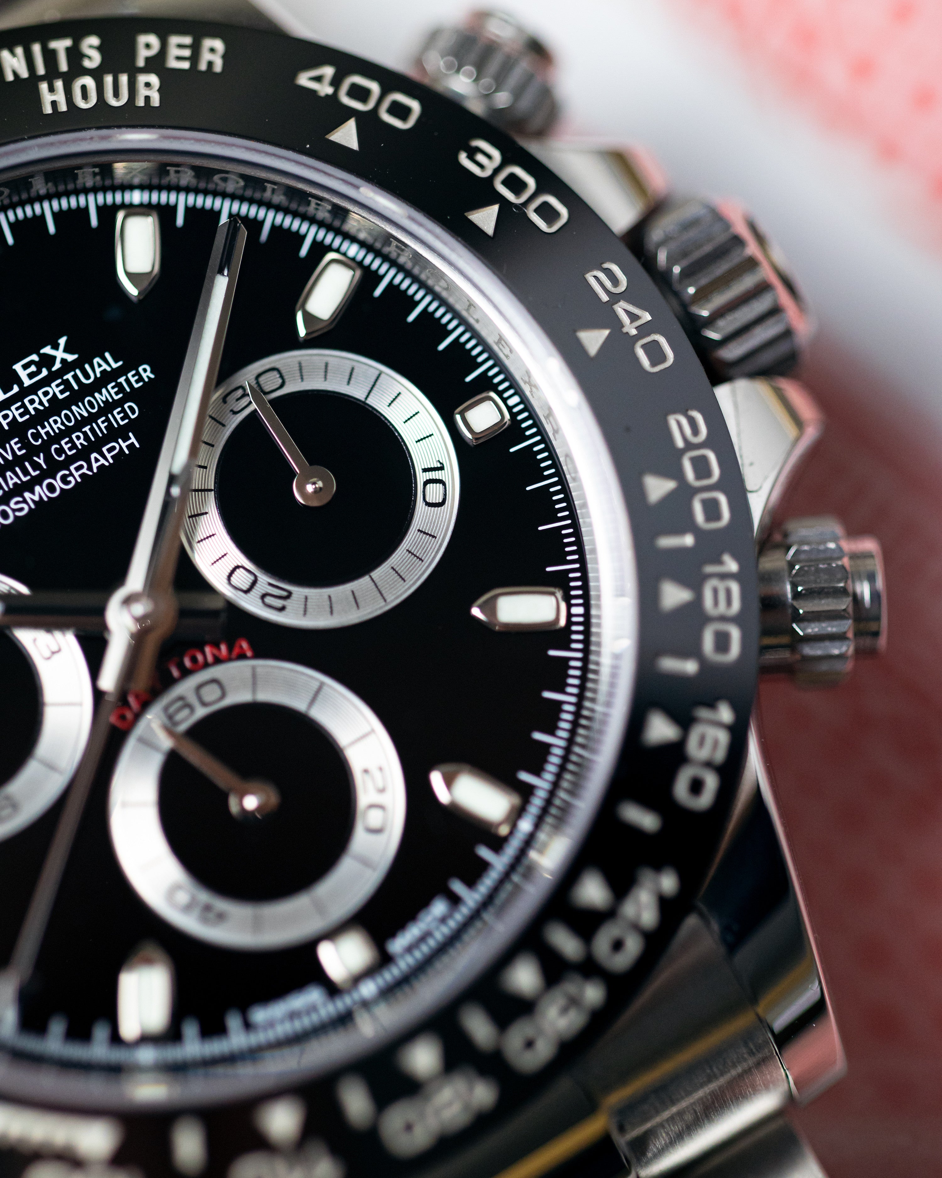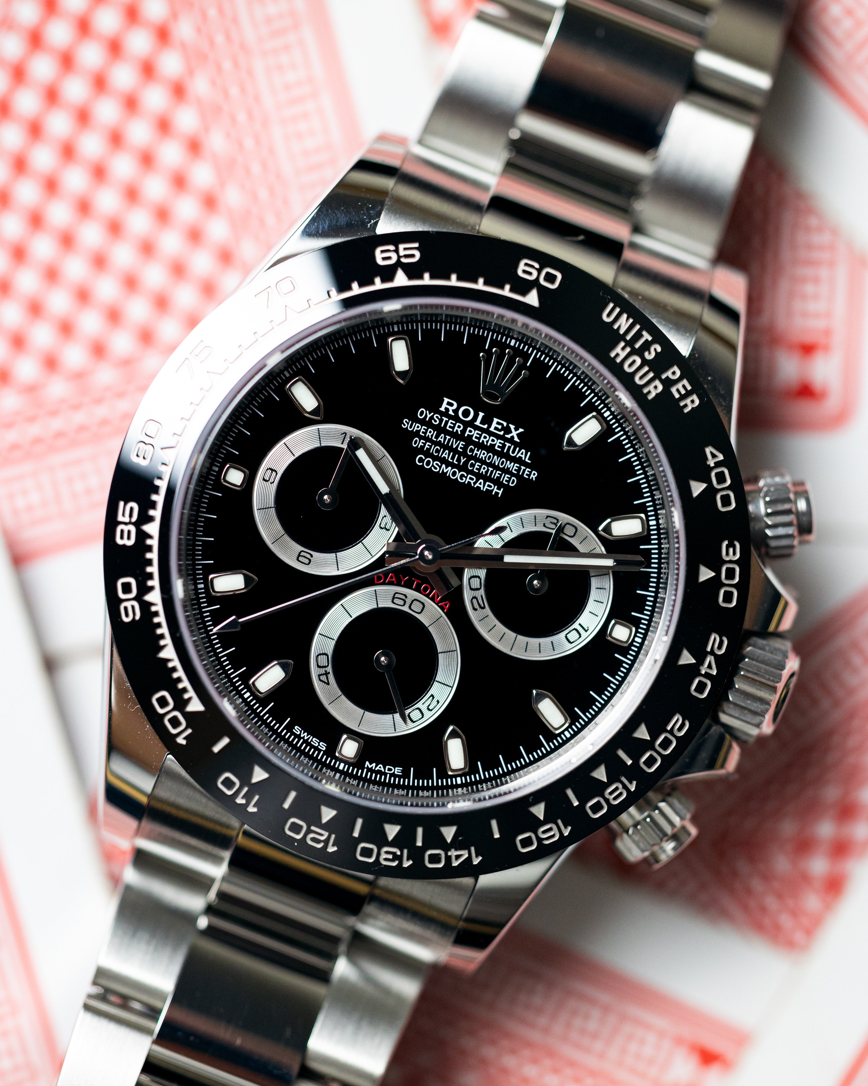 Rolex Cosmograph Daytona Oystersteel 116500LN men's watch. Features a polished with brushed 904L Oystersteel stainless steel case and brushed with polished 904L Oystersteel stainless steel Oyster bracelet. Black monobloc Cerachrom ceramic fixed bezel with engraved tachymeter scale. Black dial with Chromalight blue luminescent hands and index hour markers. Chronograph with large central chronograph seconds hand, 30 minute counter sub-dial at 3 o'clock and 12 hour counter sub-dial at 9 o'clock. Small seconds sub-dial at 6 o'clock. Stop-seconds feature for precise time setting. Powered by the Rolex Caliber 4130 self-winding automatic COSC Superlative Chronometer certified movement which boasts a 72 hour power reserve, beats at 28,800 vph and contains 44 jewels.