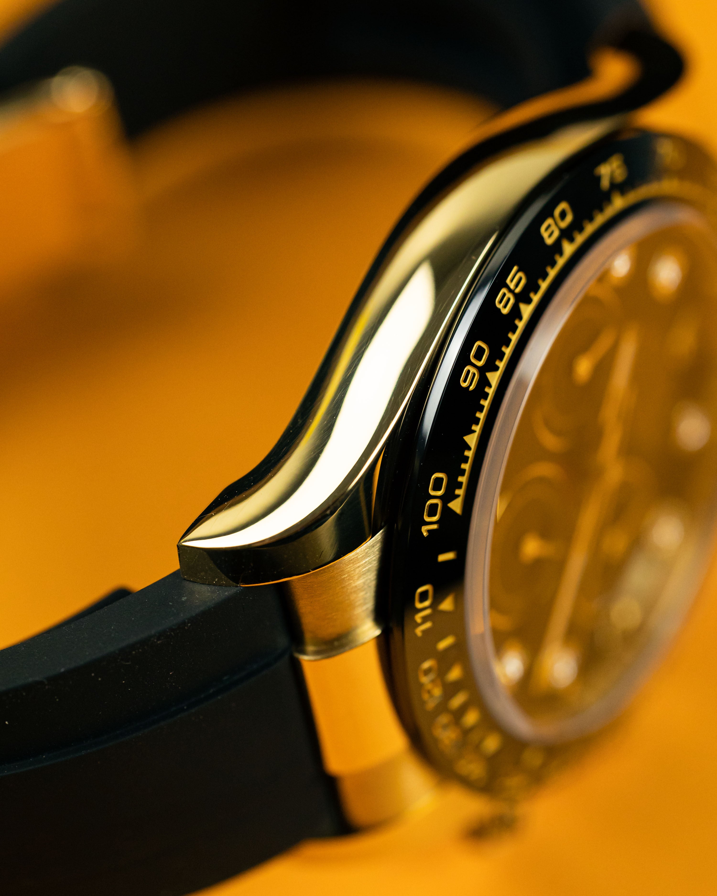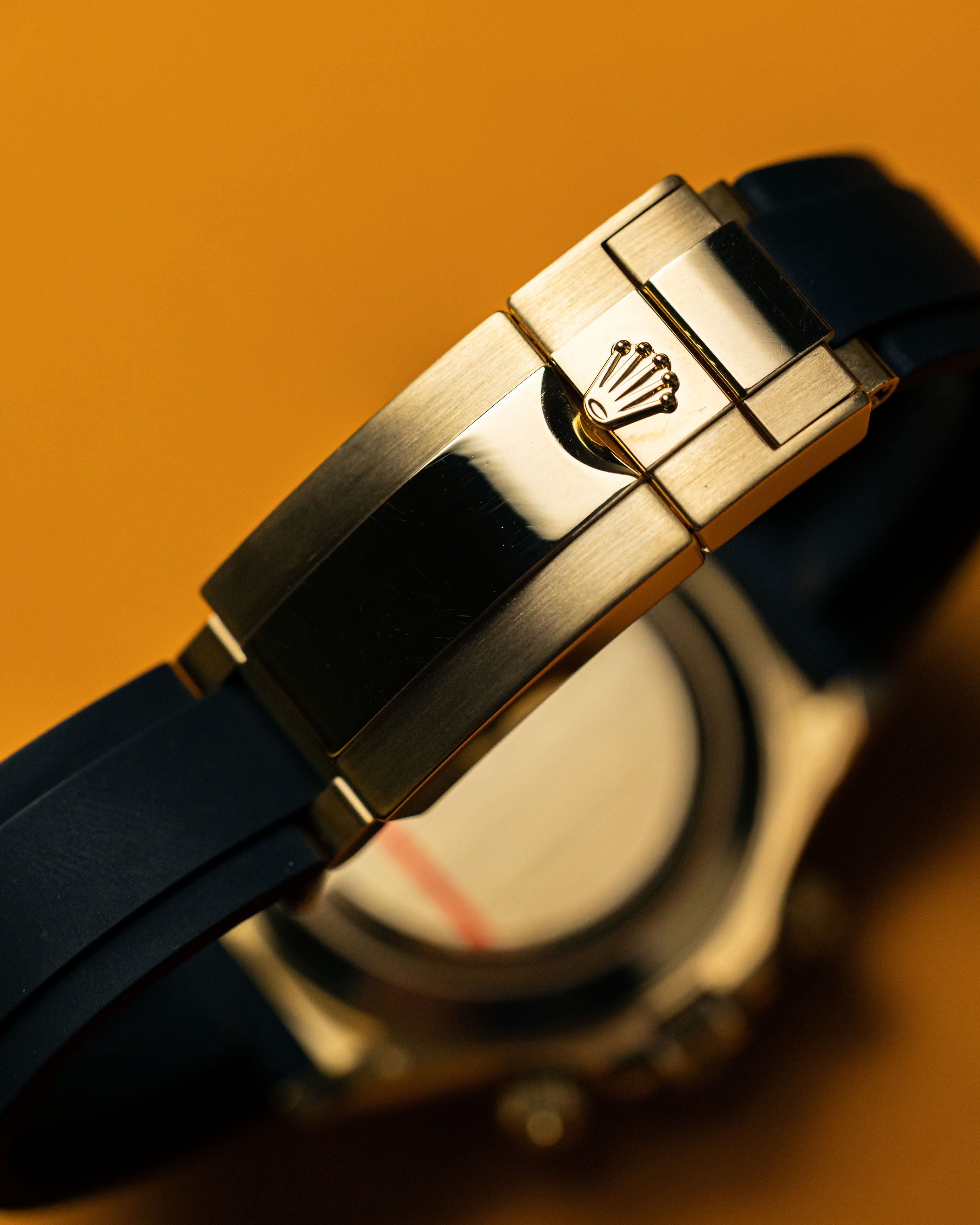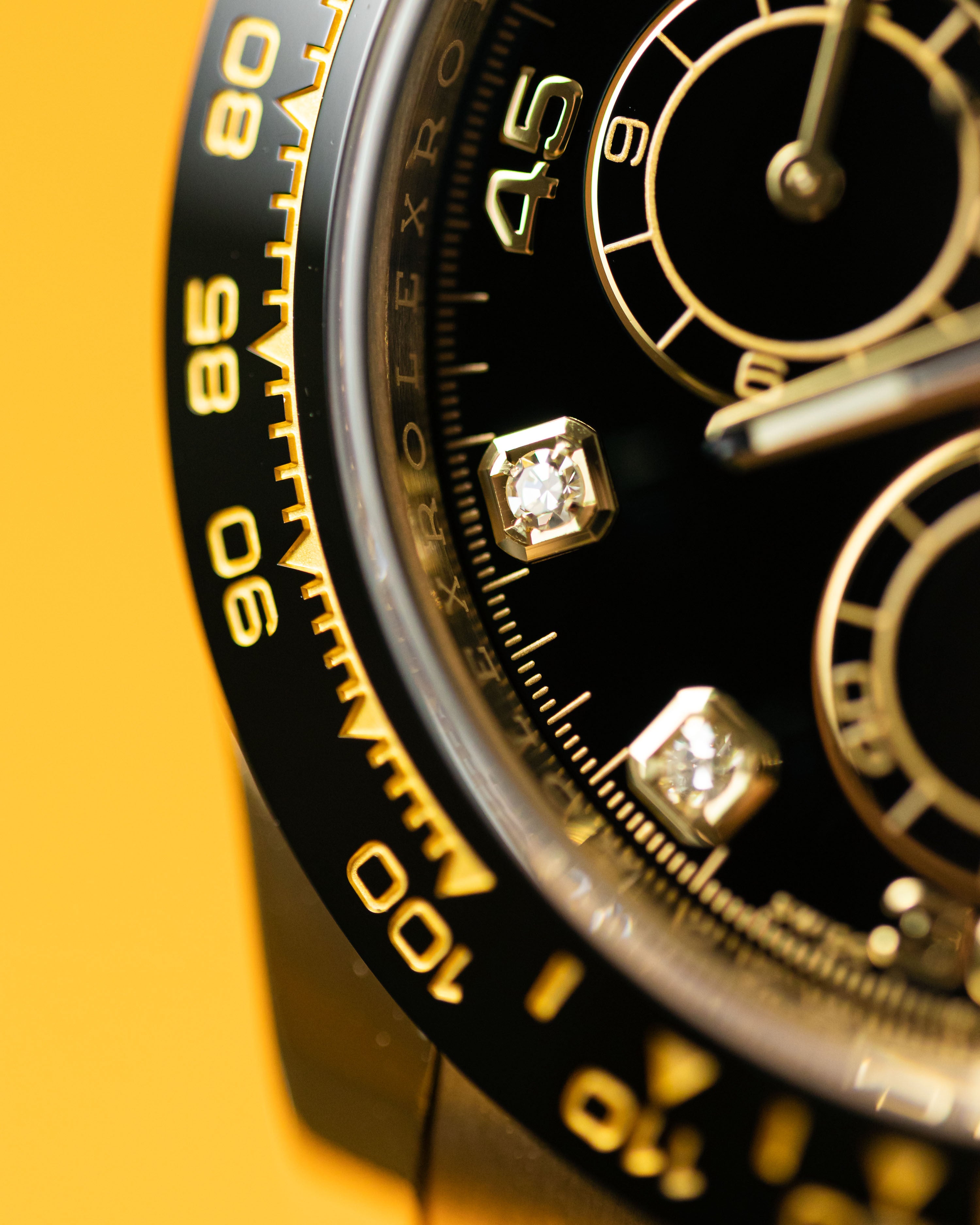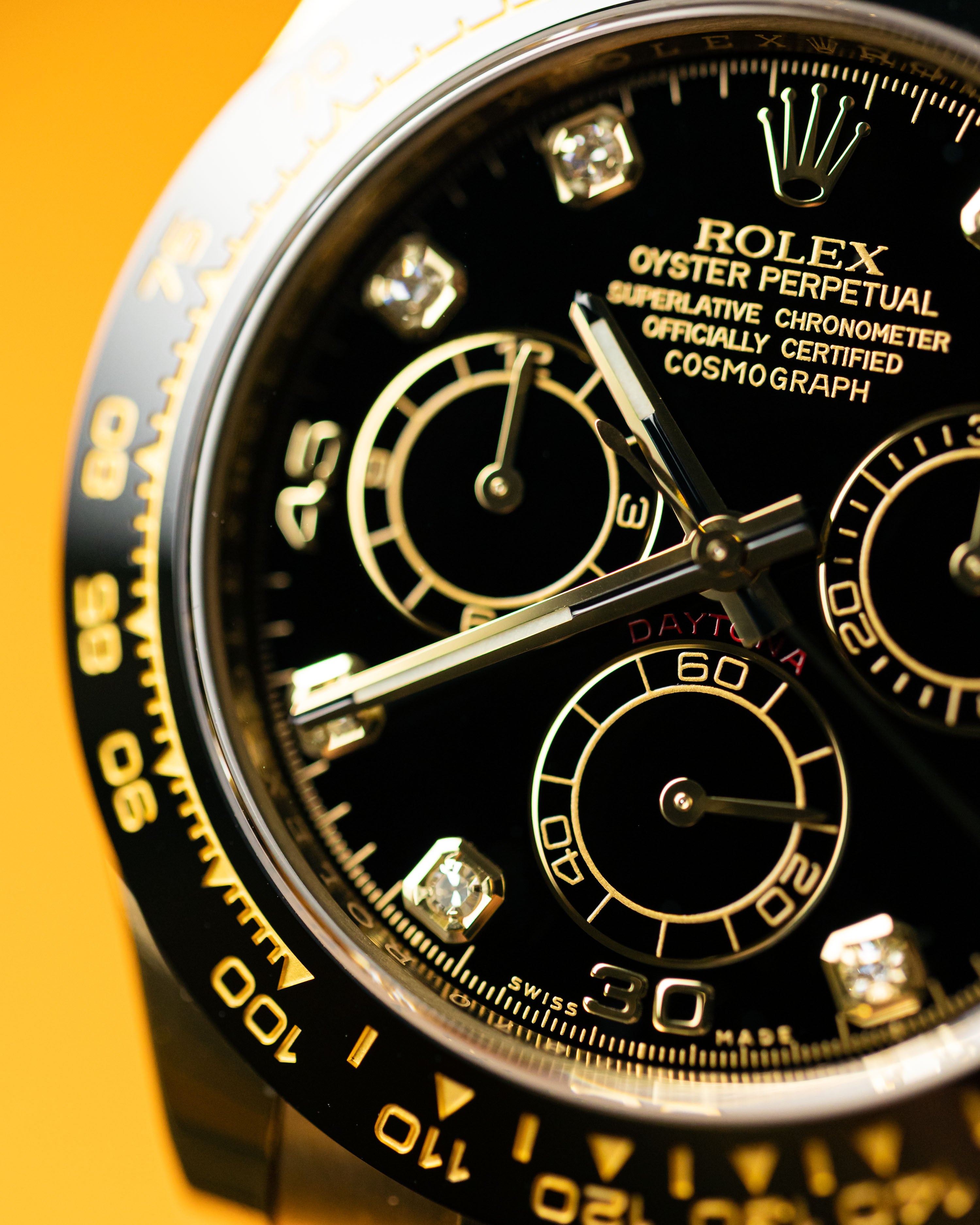 One of the most eye-pleasing combinations for the oysterflex Daytona, the glossy black dial provides the perfect backdrop to the diamond hour markers.