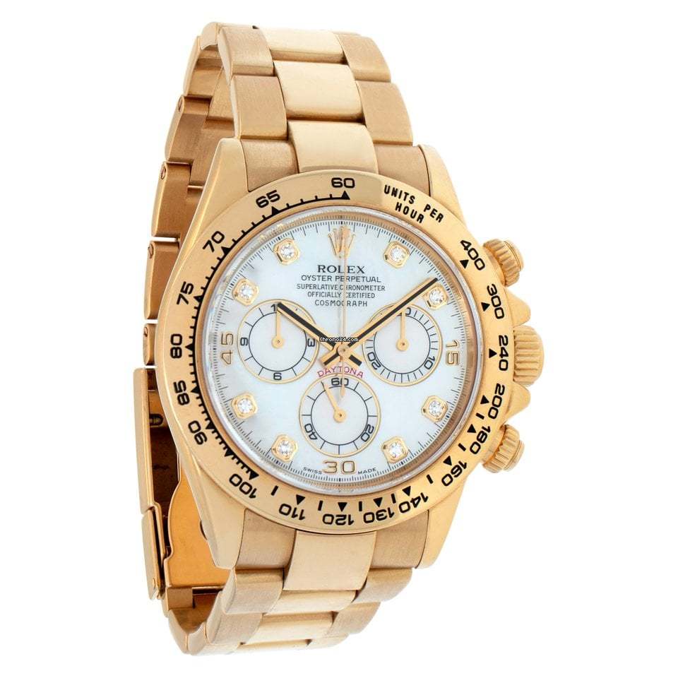 Men’s Rolex Daytona 40mm Yellow Gold, Mother-of-pearl Diamond Dial on Oyster Bracelet, Reference # 116508 md with Fixed Yellow Gold Tachymeter Engraved bezel. You can get like new timepiece from us as well as Rolex Ref# 116508 md.