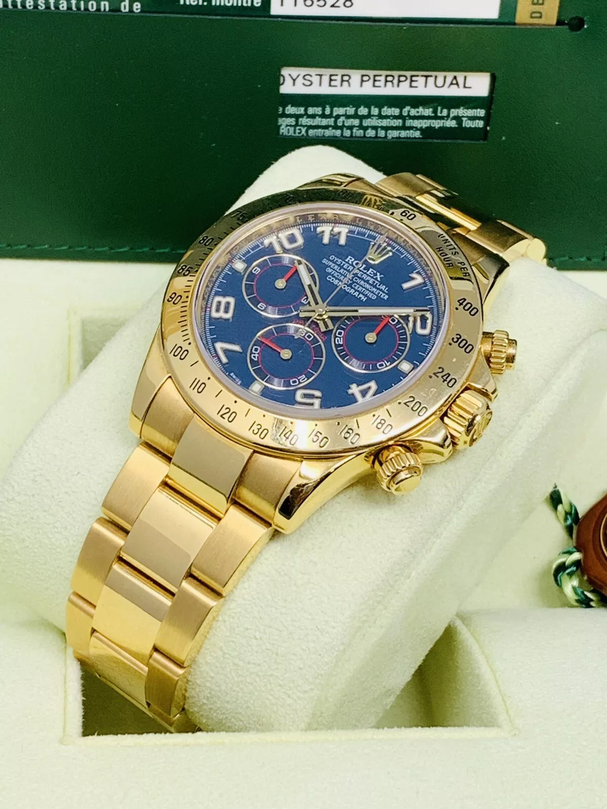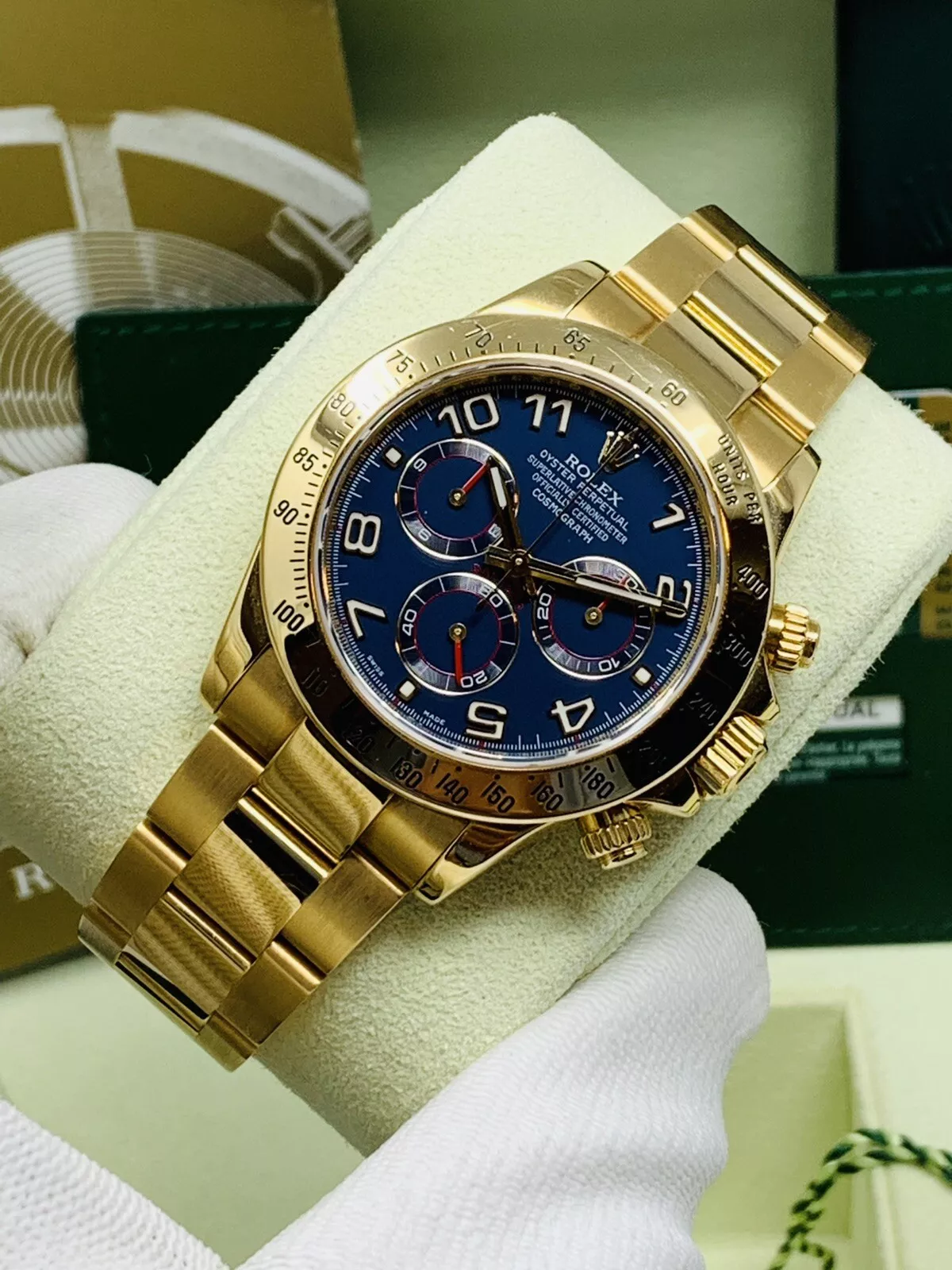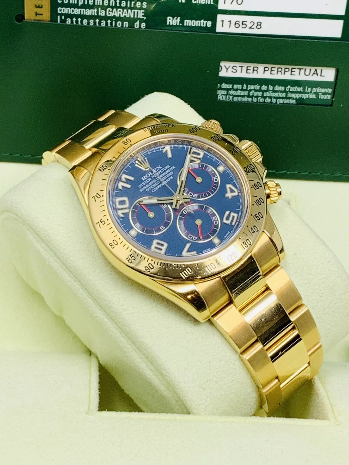 This 18k gold watch 40mm case carries a blue dial called "Racing dial" and a yellow gold bracelet.