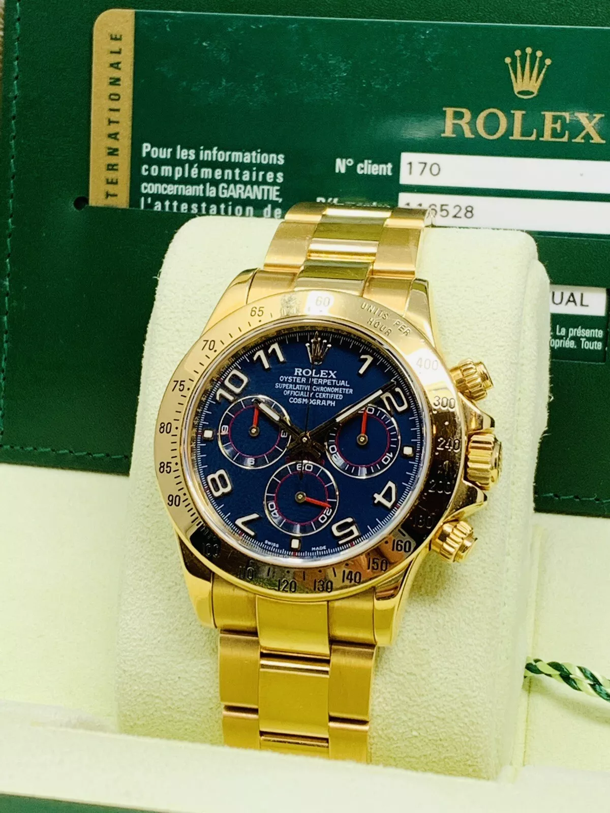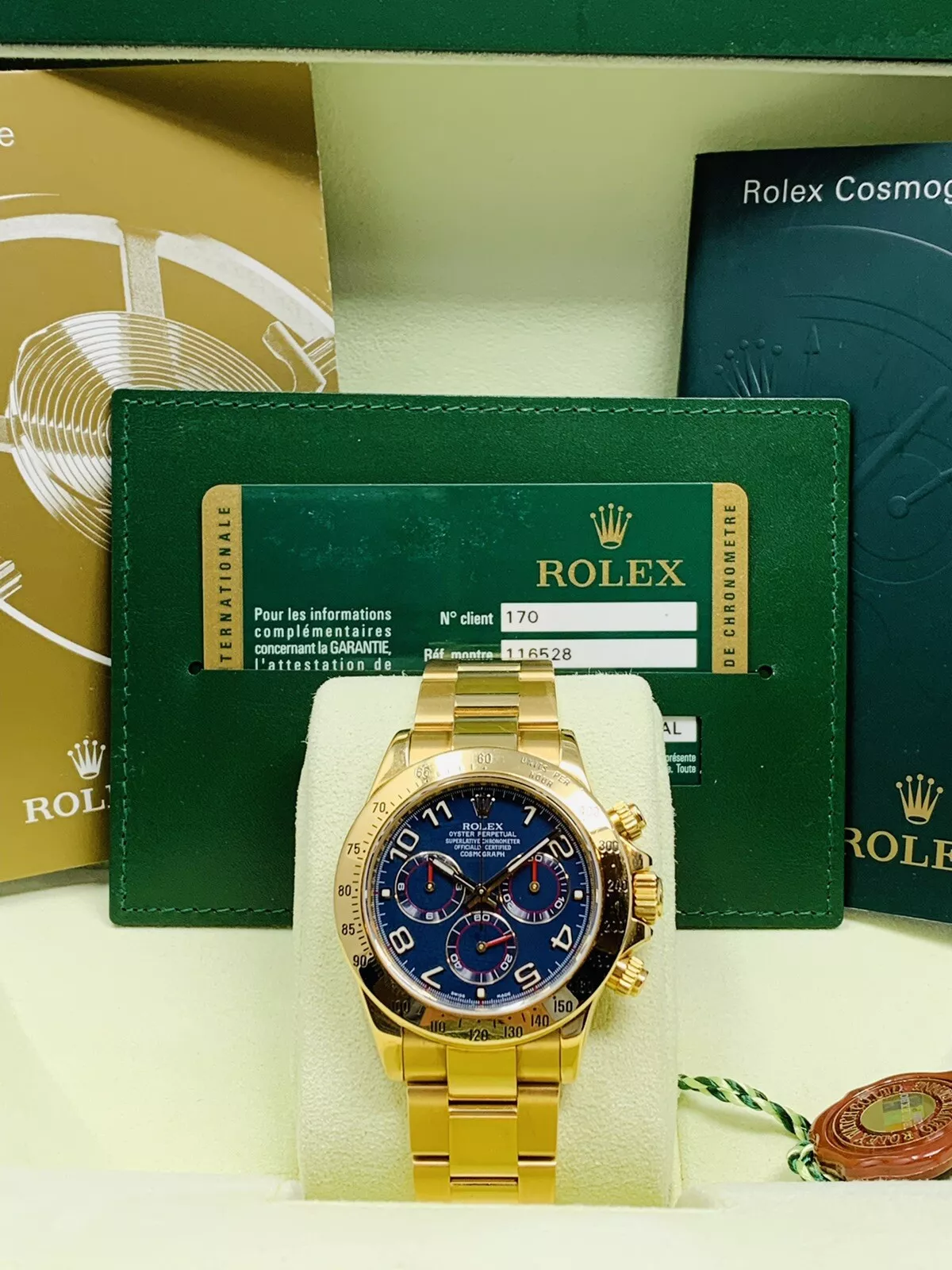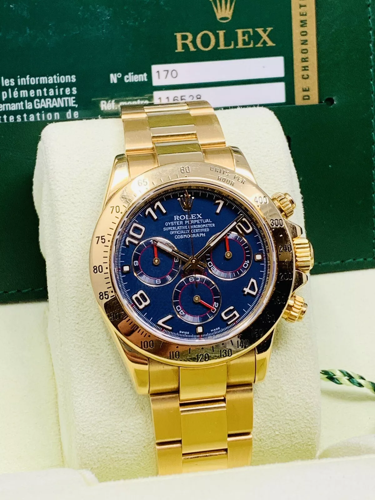This 18k gold watch 40mm case carries a blue dial called "Racing dial" and a yellow gold bracelet.