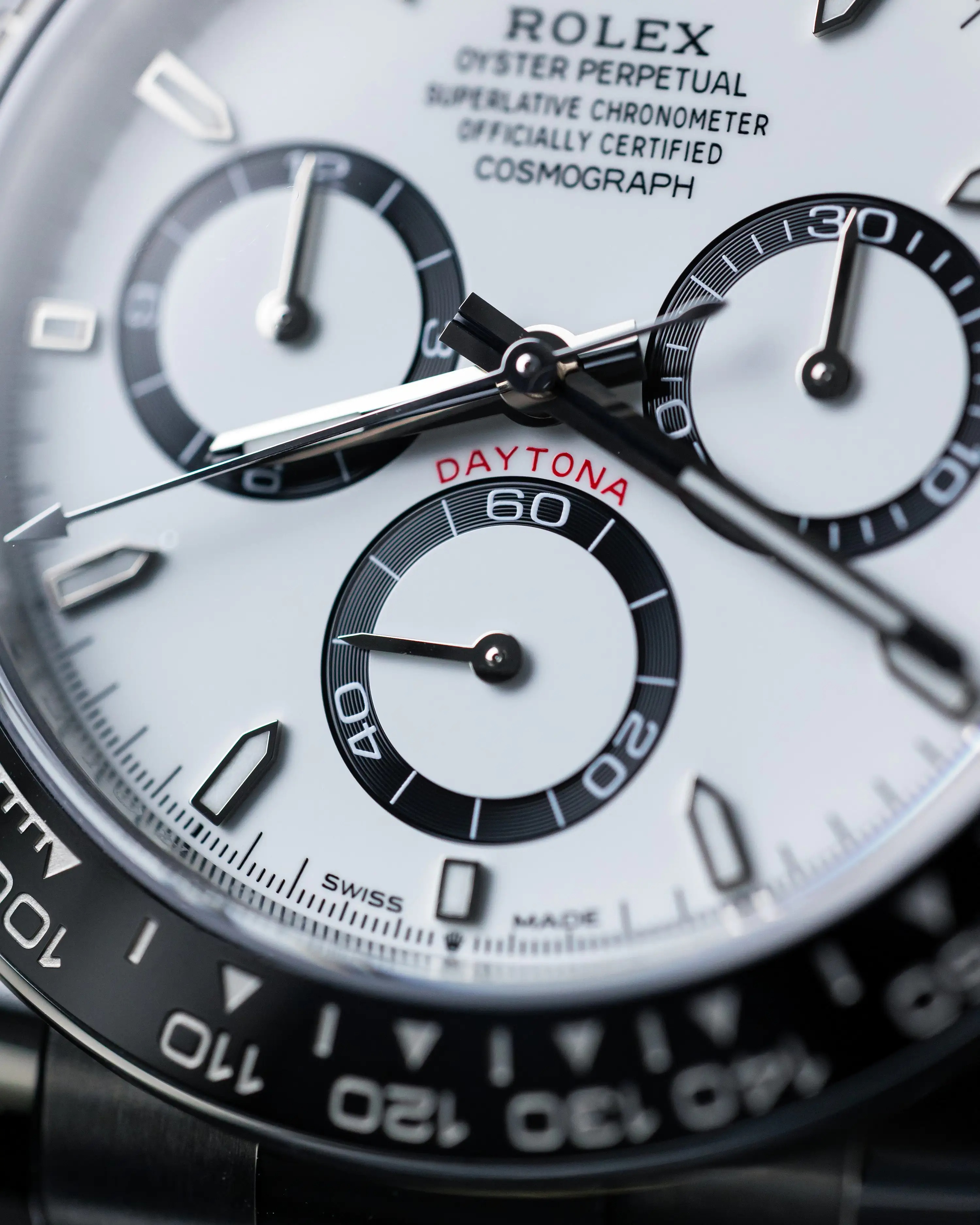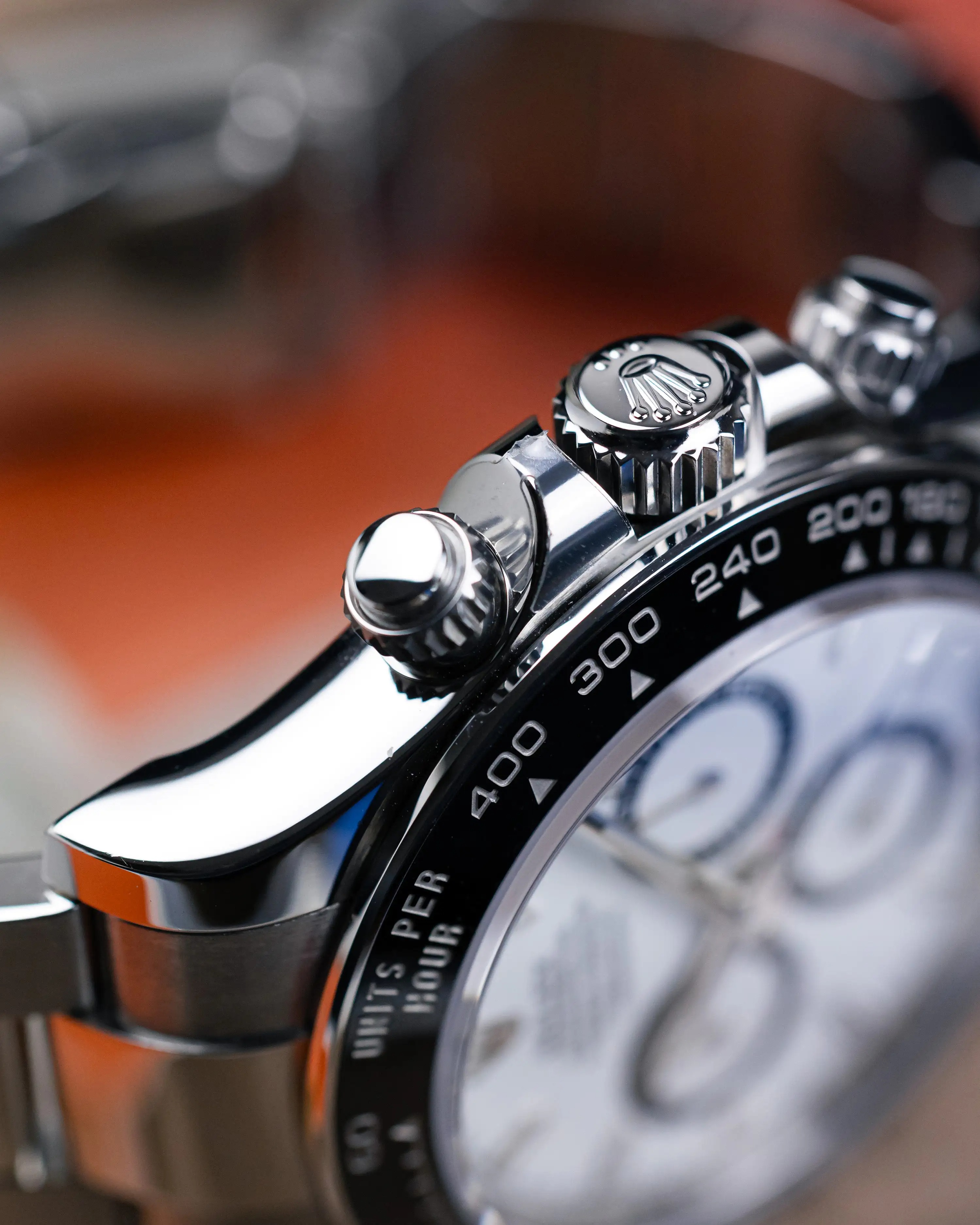 A key part of the model��s identity is the bezel moulded with a tachymetric scale for measuring average speeds of up to 400 miles or kilometres per hour. Blending high technology with sleek aesthetics, the black bezel is reminiscent of the 1965 model that was fitted with a black Plexiglas bezel insert. The monobloc Cerachrom bezel in high-tech ceramic offers a number of advantages: it is corrosion resistant, virtually scratchproof and the colour is unaffected by UV rays. This extremely durable bezel also offers an exceptionally legible tachymetric scale, thanks to the deposition of a thin layer of platinum in the numerals and graduation via a PVD (Physical Vapour Deposition) process. The monobloc Cerachrom bezel is made in a single piece and holds the crystal firmly in place on the middle case, ensuring waterproofness.