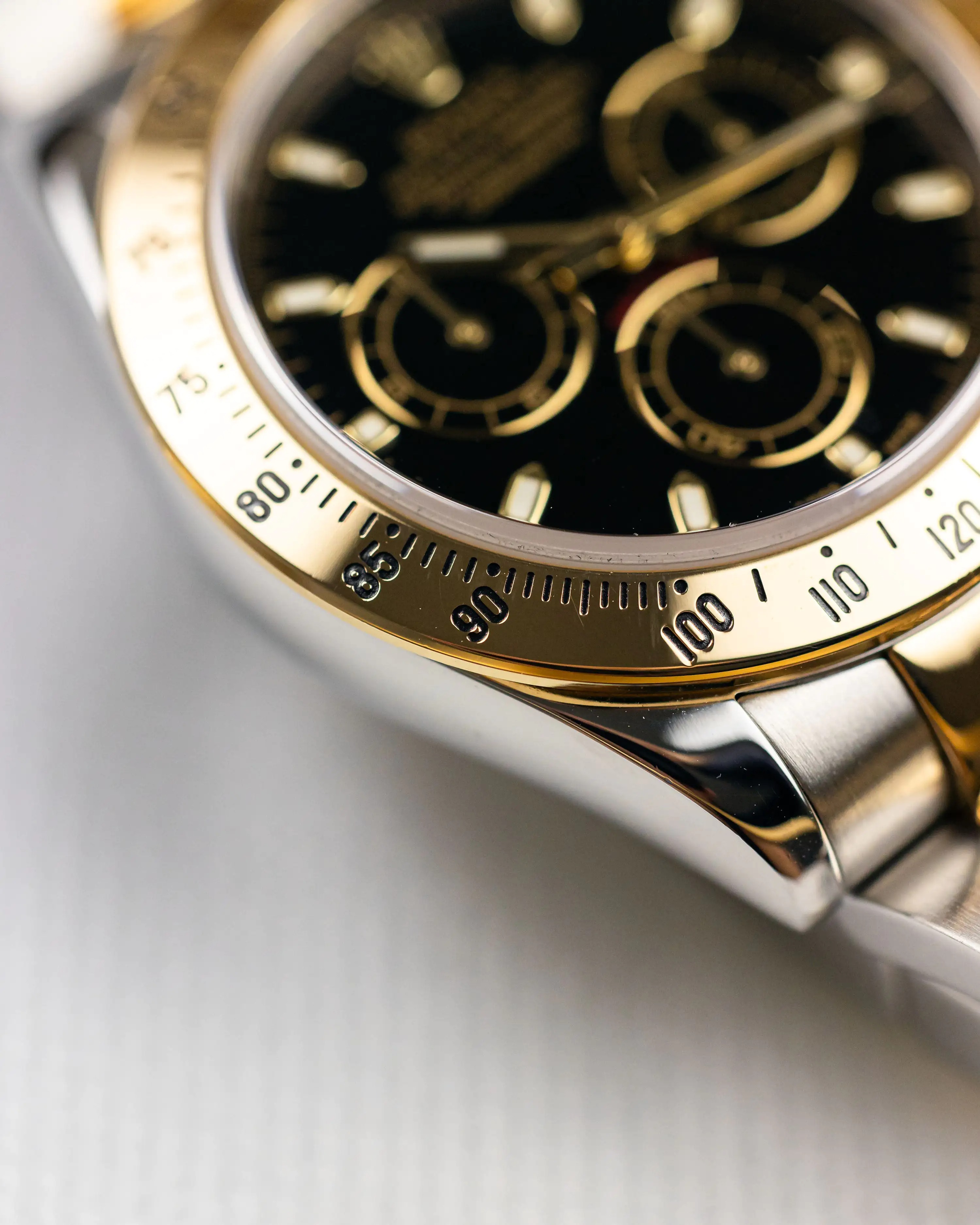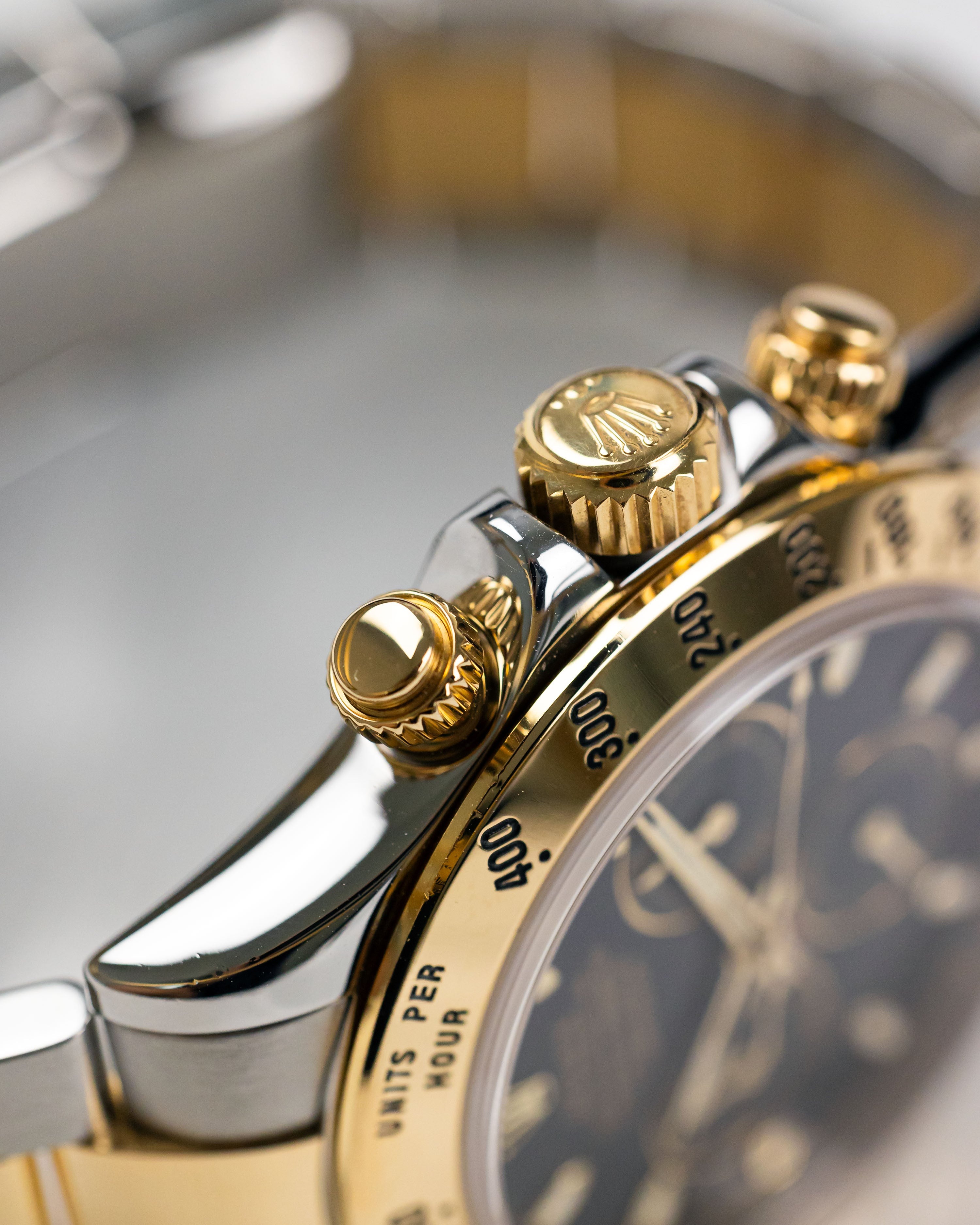 - Solid 18k Yellow Gold Triplock Screw Down Crown & Chronograph Buttons