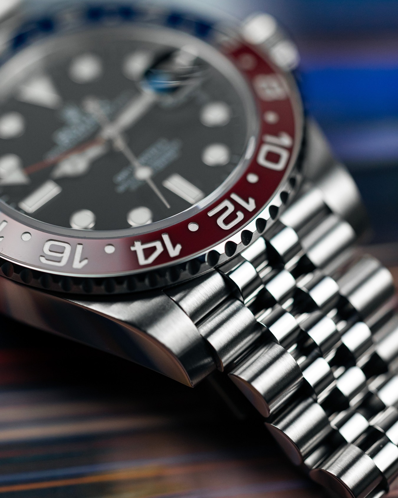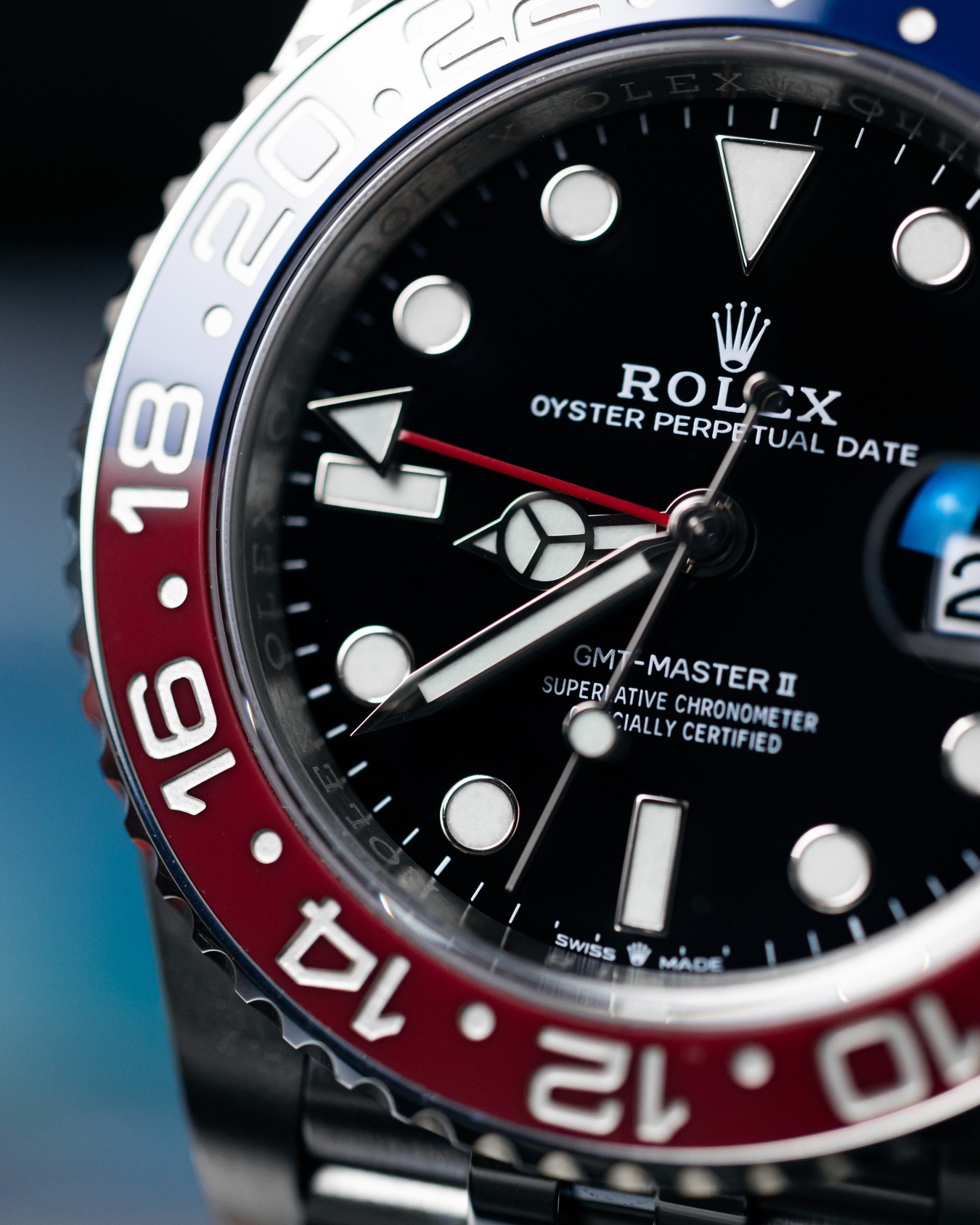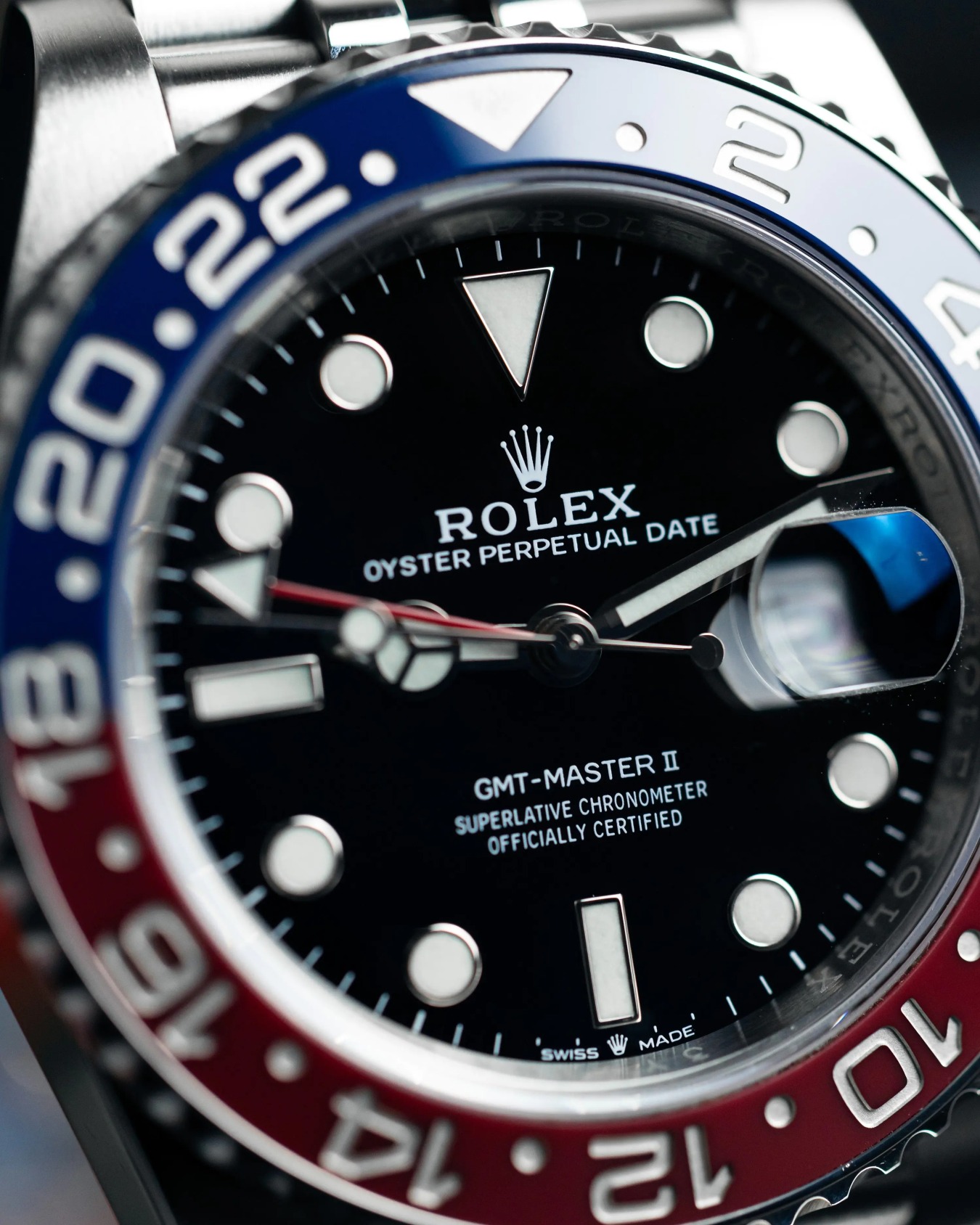 In addition to the standard hour, minute, and sweeping second hands, the GMT-Master II 126710 BLRO comes with a triangle-tipped 24-hour hand. This hand works in combination with the demarcated bezel to allow the wearer to display local and reference time or local and an alternative time zone.