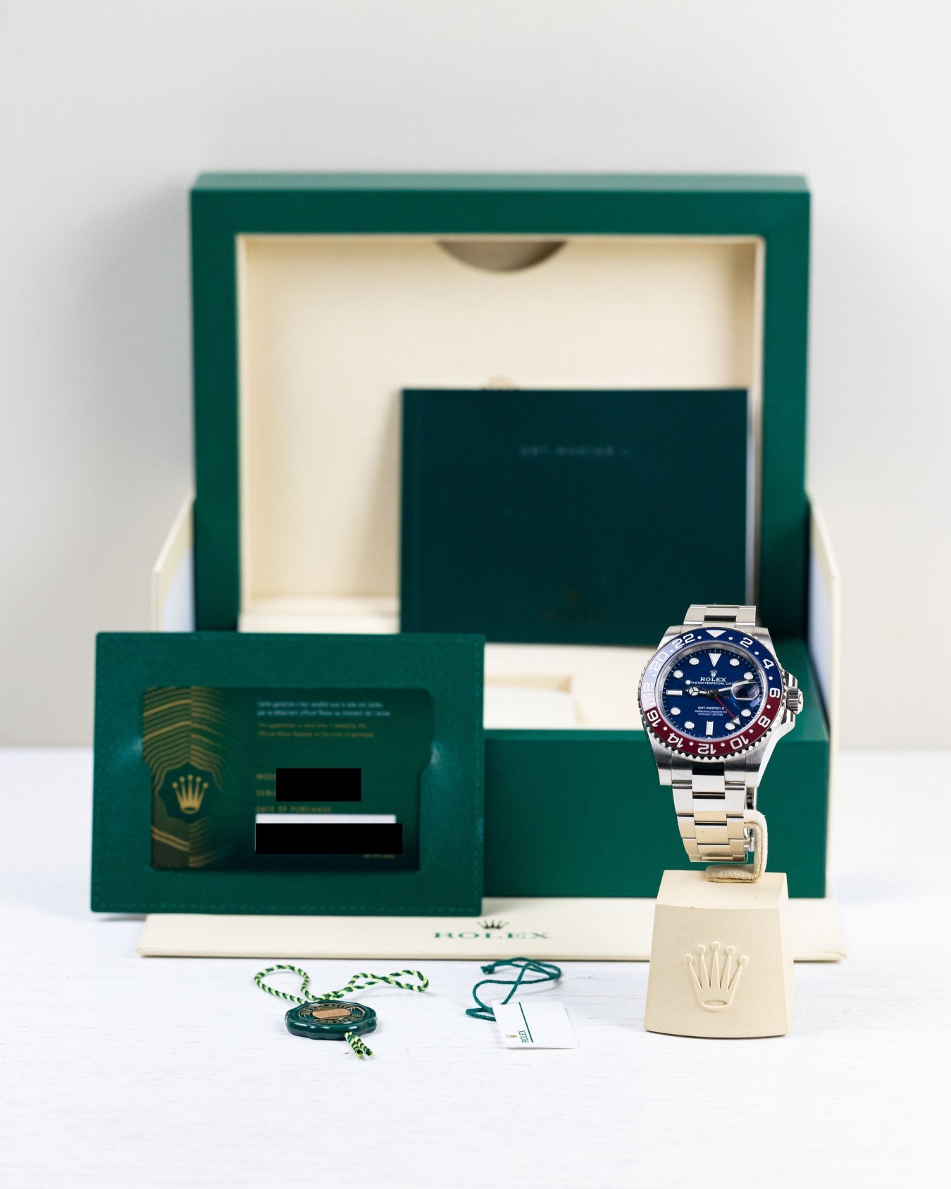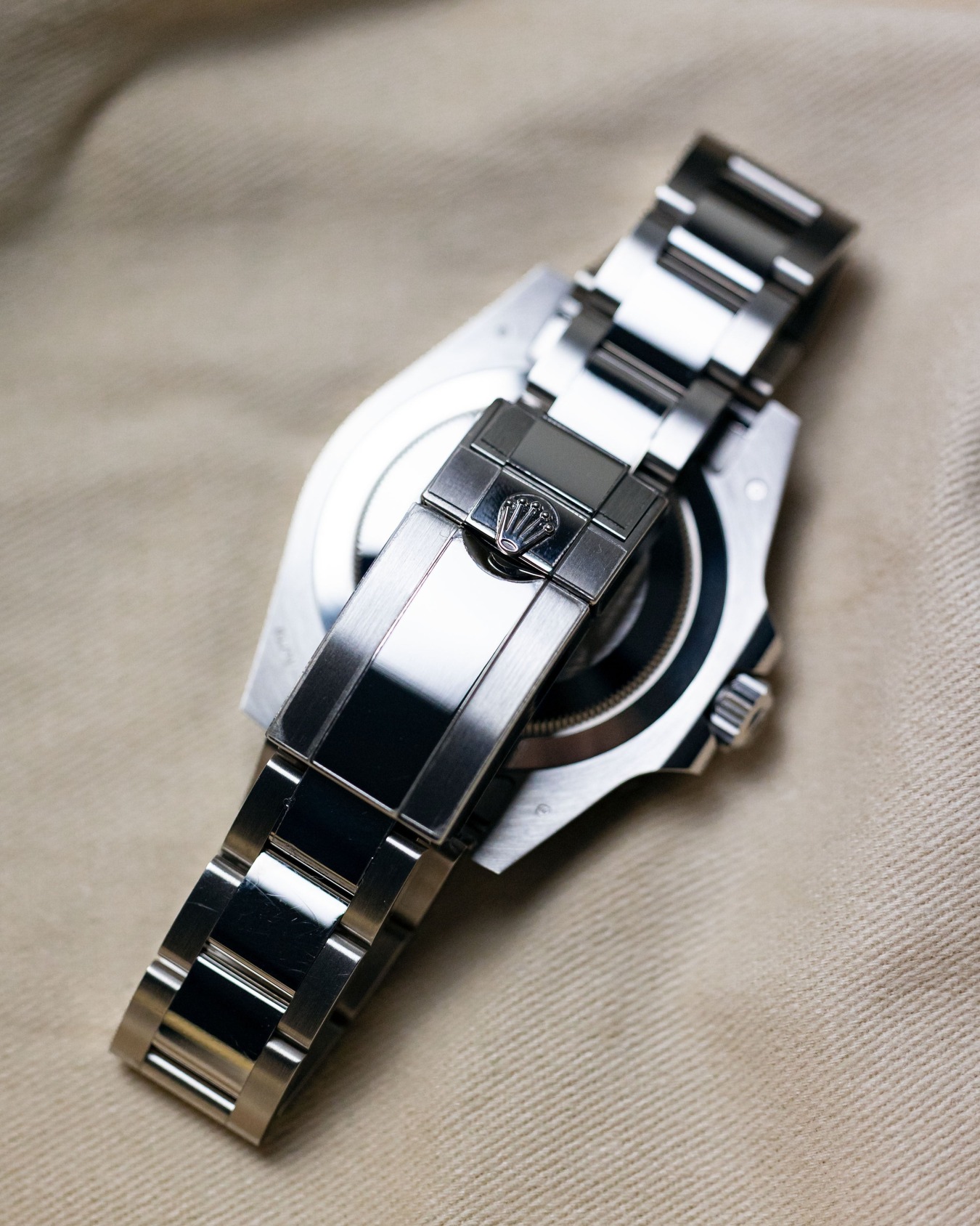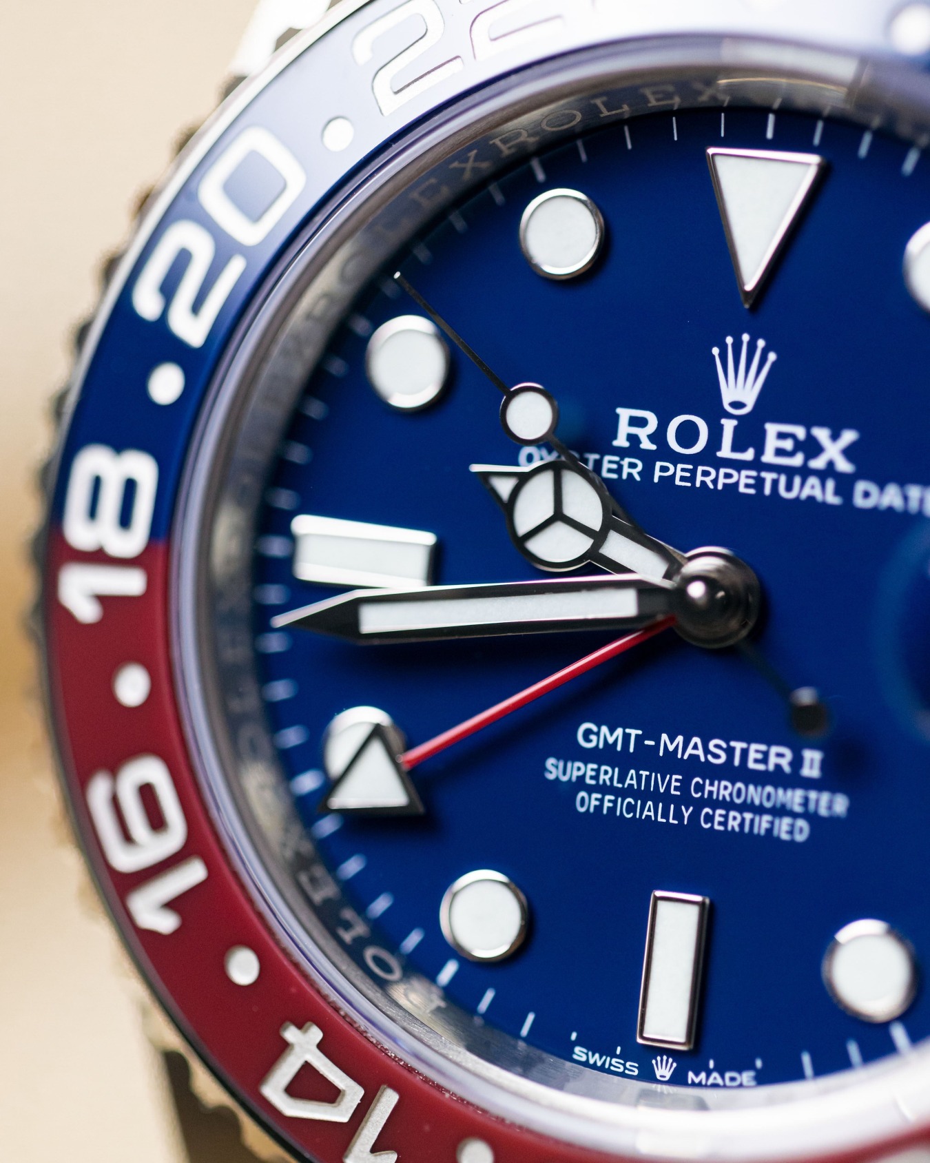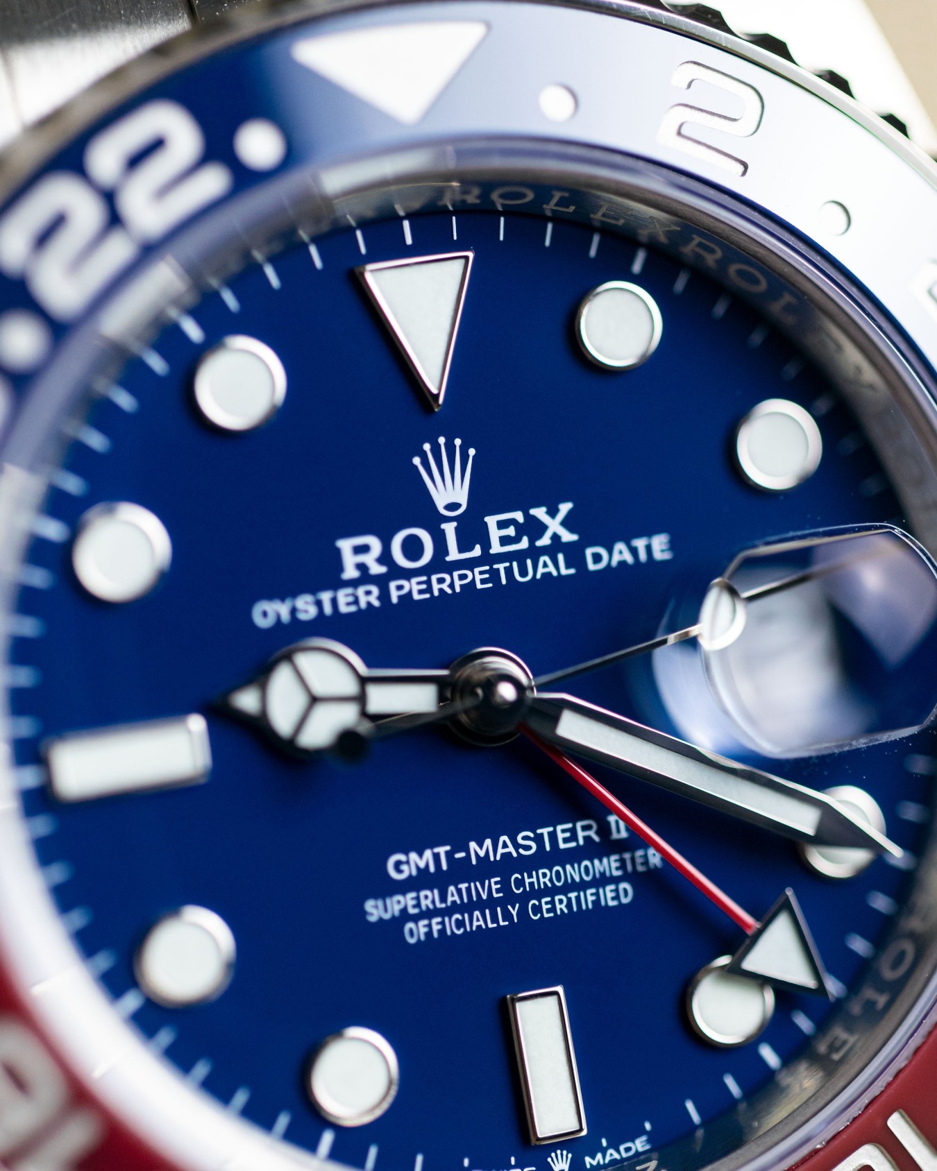 In addition to conventional hour, minute and seconds hands, the GMT-Master II features an arrow-tipped hand, which circles the dial once every 24 hours, as well as a bidirectional rotatable 24-hour graduated bezel.