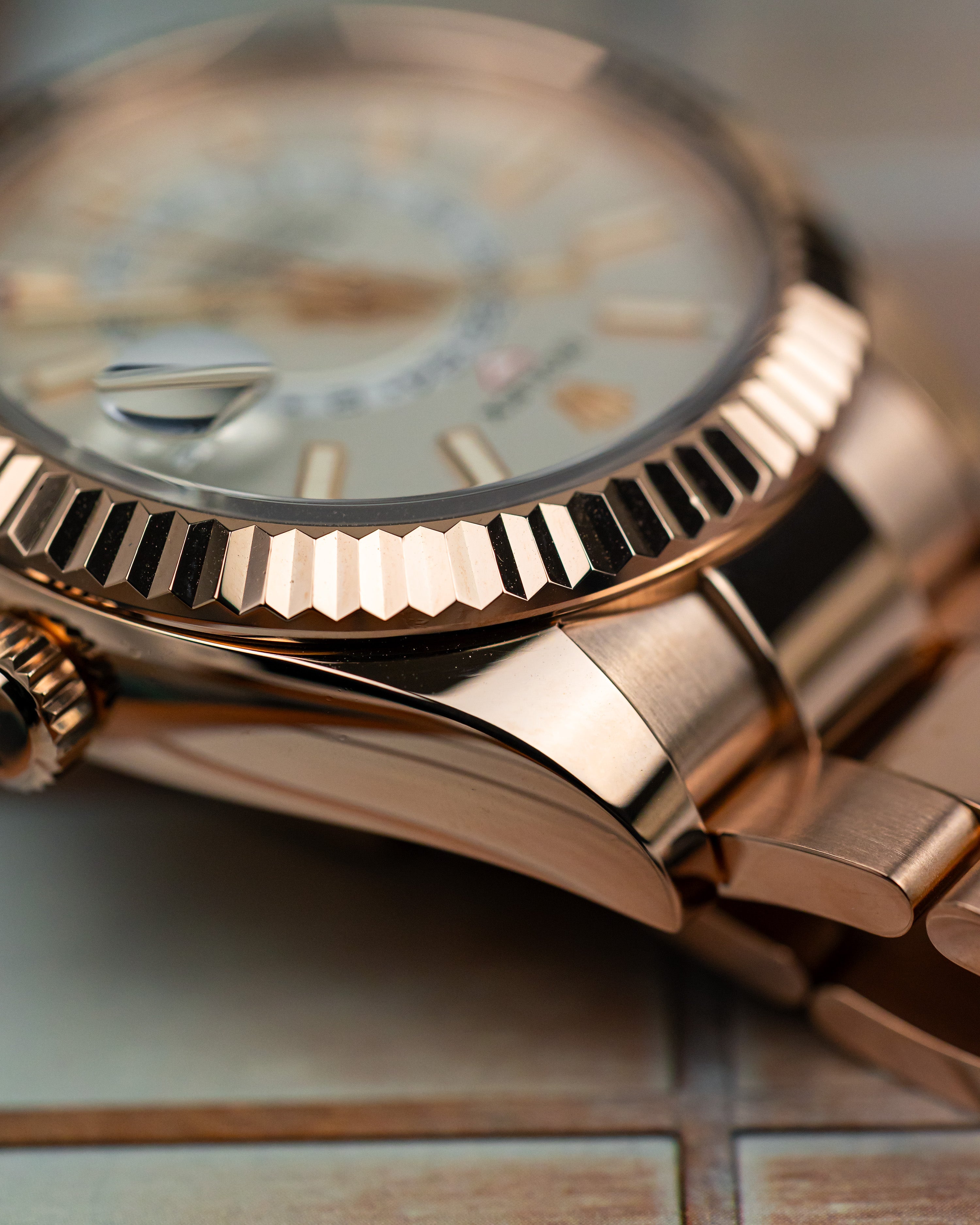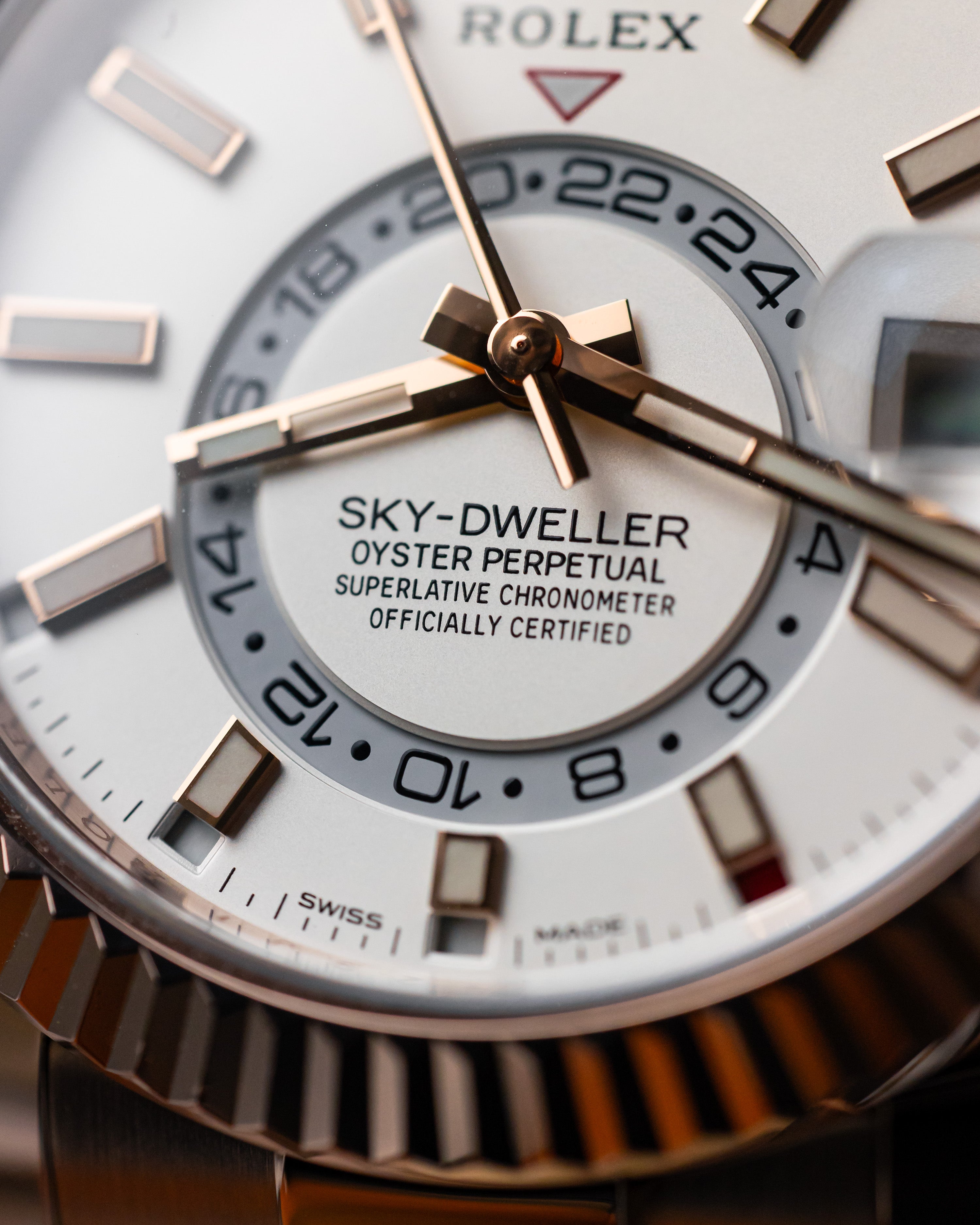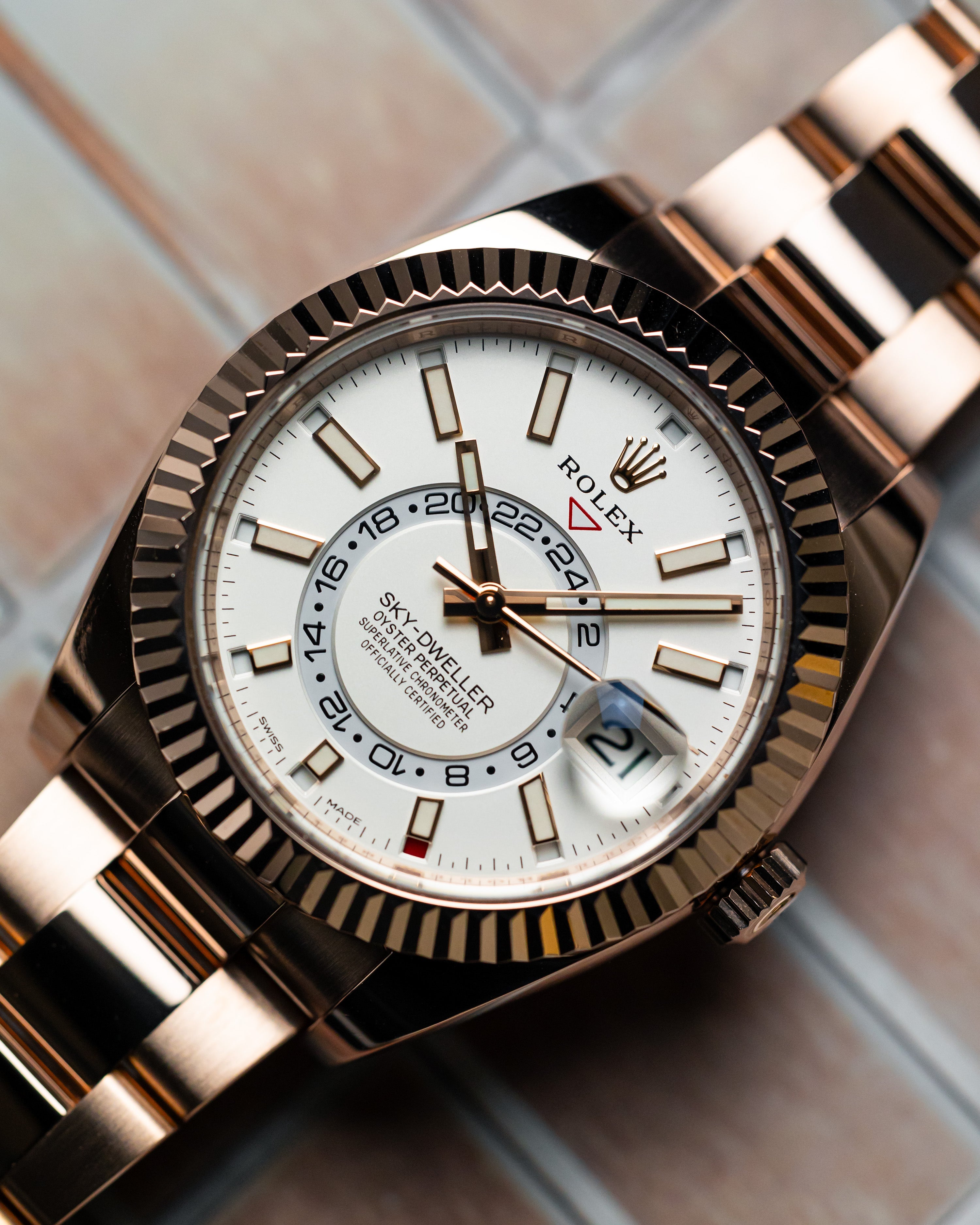 With its crisp white dial and luxurious rose gold case, this watch may appear simple at first glance but a closer look reveals it as one of the most complex timepieces in Rolex’s lineup.