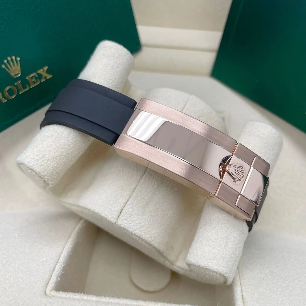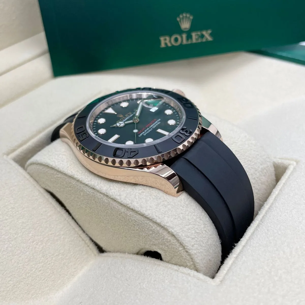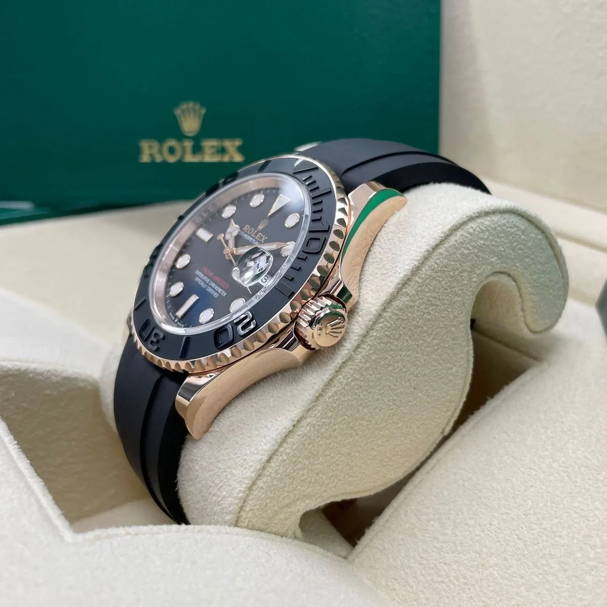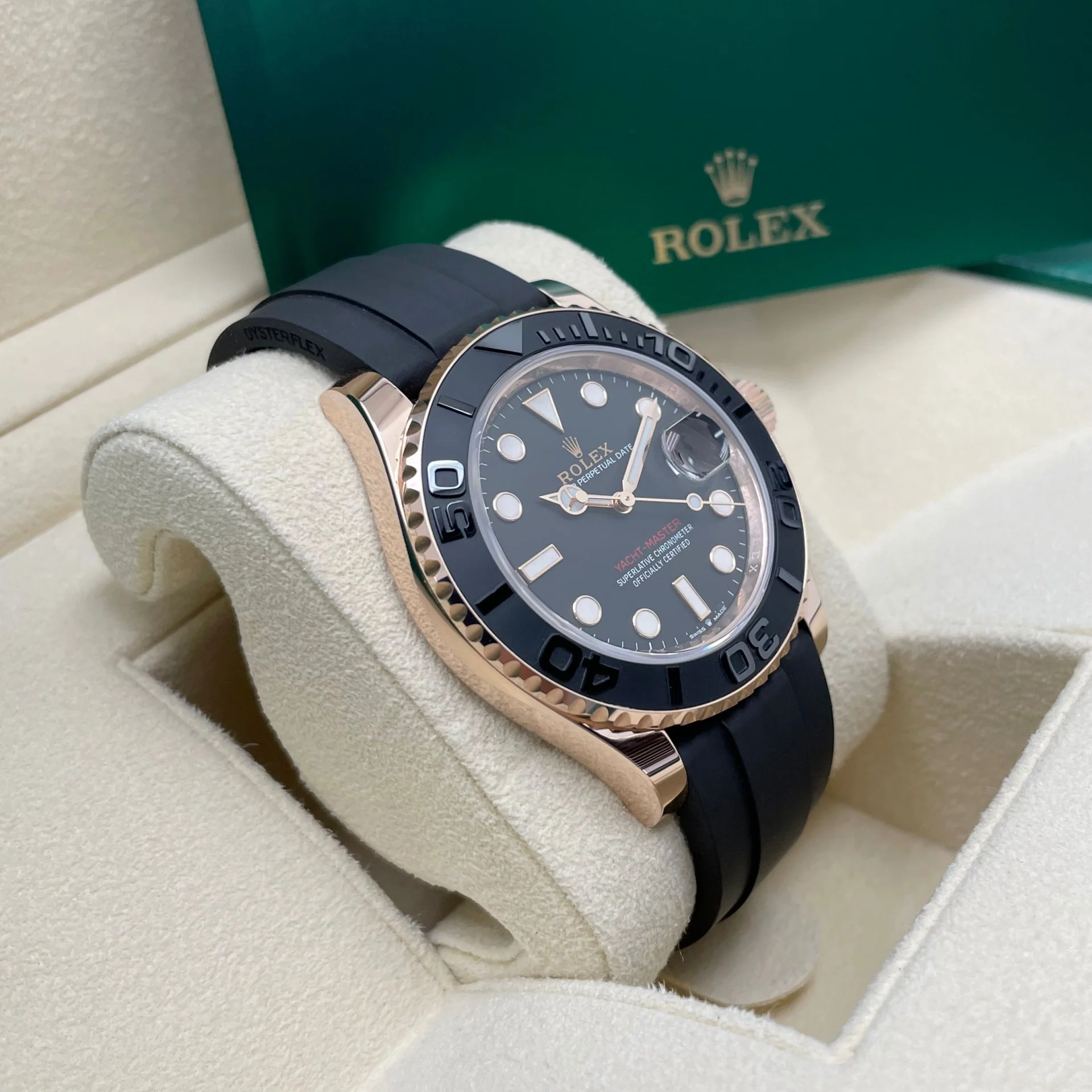 The Yacht-Master's new Oysterflex bracelet, developed by Rolex and patented, offers a sporty alternative to metal bracelets. The bracelet attaches to the watch case and the Oysterlock safety clasp by a flexible titanium and nickel alloy metal blade. The blade is overmoulded with high-performance black elastomer which is particularly resistant to environmental effects, very durable and perfectly inert for the wearer of the watch. For enhanced comfort, the inside of the Oysterflex bracelet is equipped with a patented longitudinal cushion system that stabilizes the watch on the wrist and fitted with an 18 ct Everose gold Oysterlock safety clasp. It also features the Rolex Glidelock extension system, designed by the brand and patented. This inventive toothed mechanism, integrated beneath the clasp, allows fine adjustment of the bracelet length by some 15 mm in increments of approximately 2.5 mm, without the use of tools.