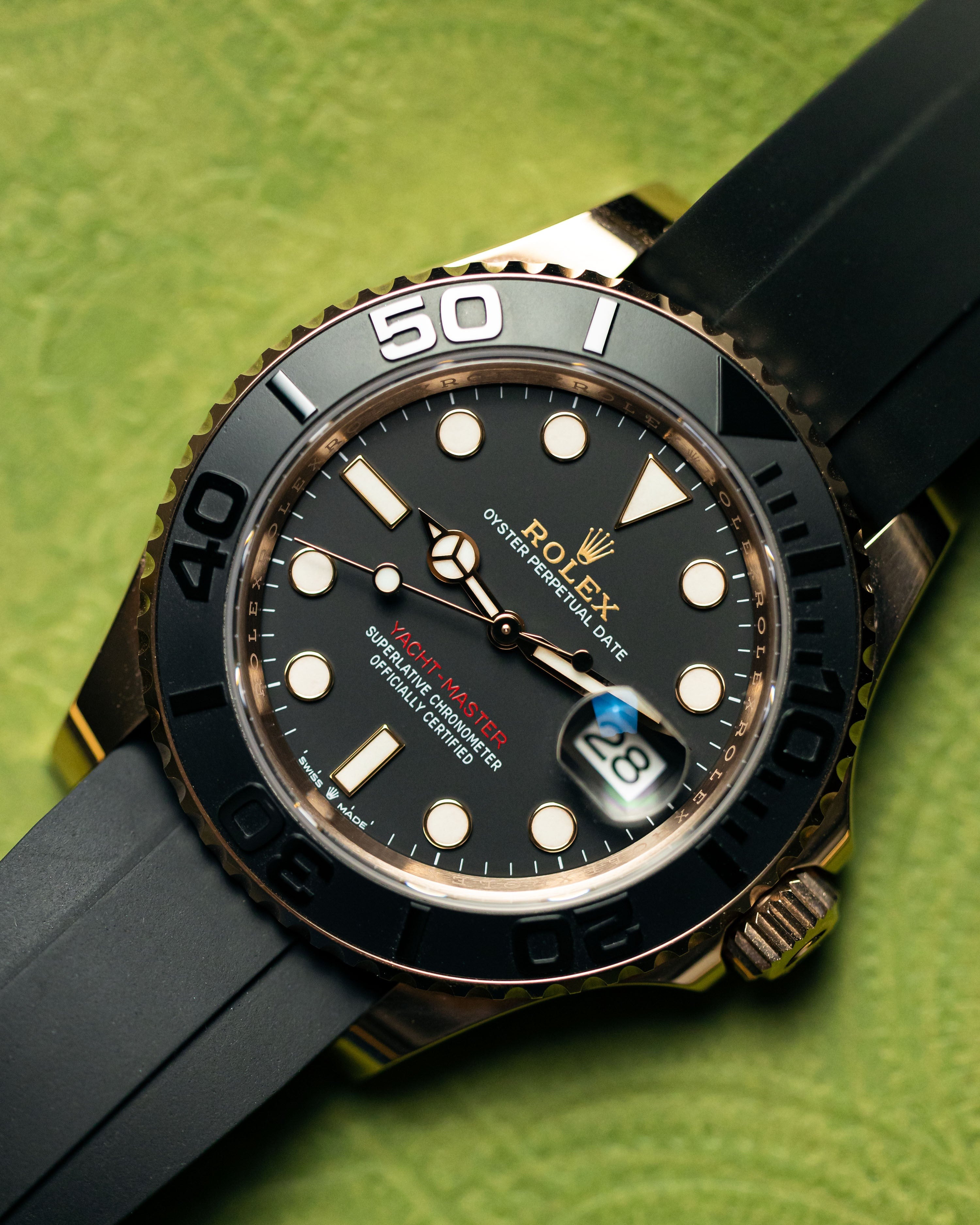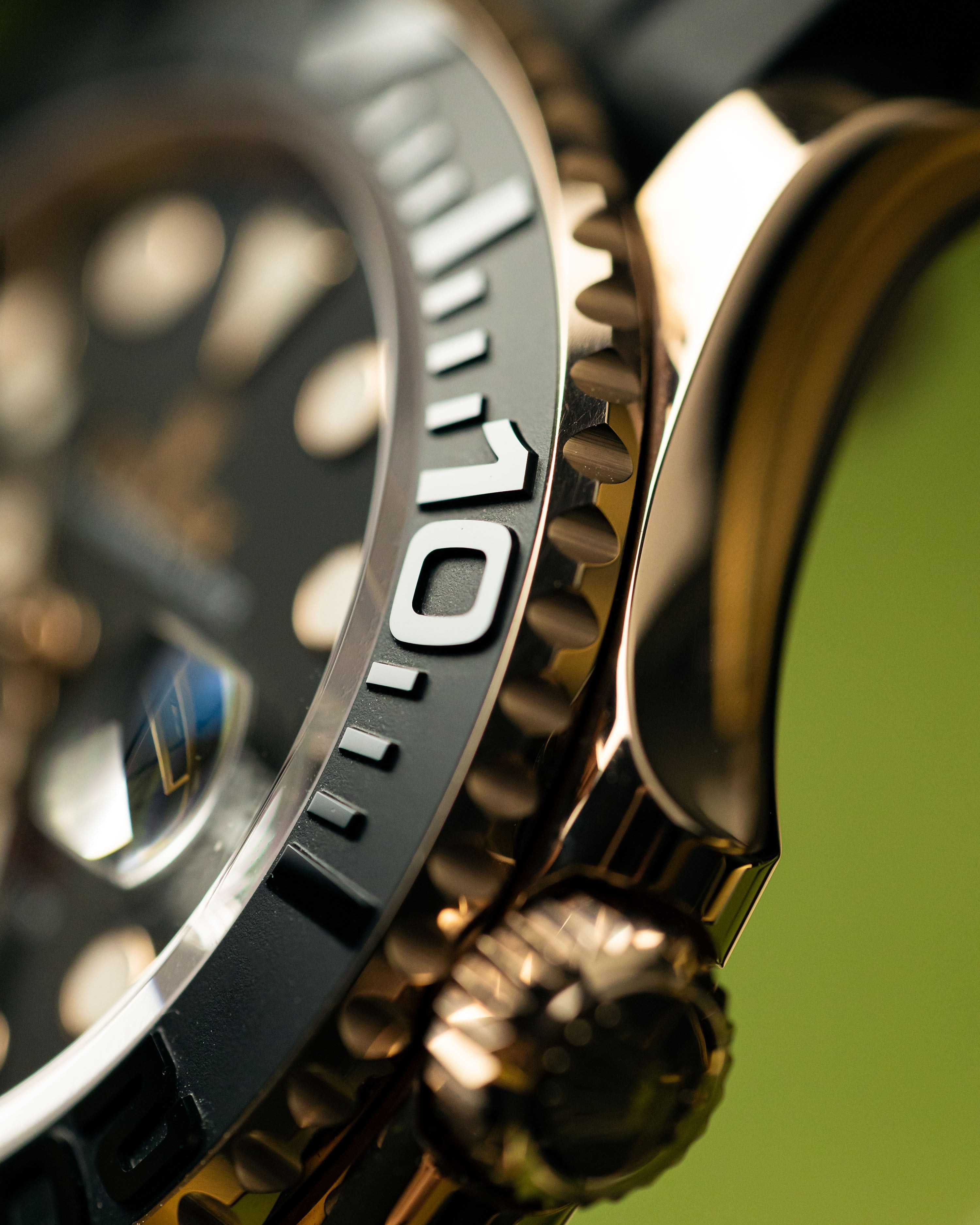 The Yacht-Master?s bidirectional rotatable 60-minute graduated bezel is made of precious materials. The raised polished numerals and graduations stand out clearly against a matt, sand-blasted background. This functional bezel ? which allows the wearer to calculate, for example, the sailing time between two buoys ? is also a key component in the model?s distinctive visual identity.