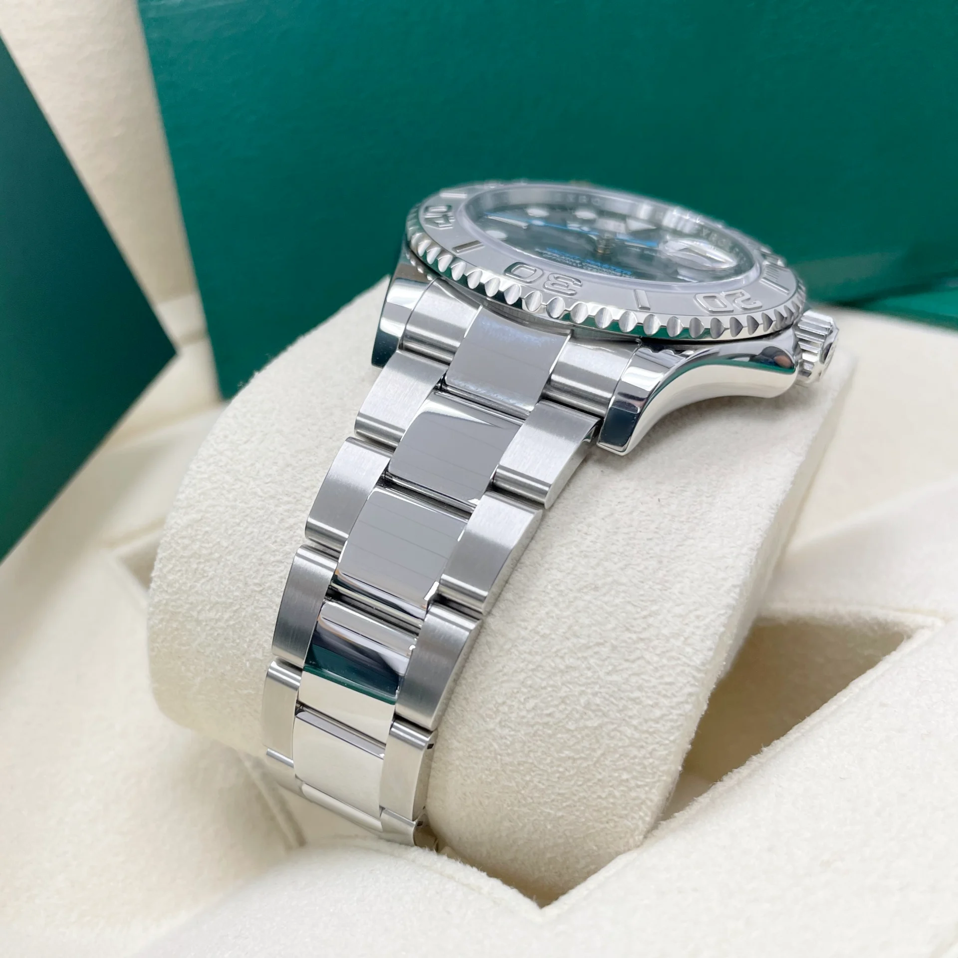 Like all Rolex Professional watches, the Yacht-Master 40 offers exceptional legibility in all circumstances, and especially in the dark, thanks to its Chromalight display. The broad hands and hour markers in simple shapes – triangles, circles, rectangles – are filled with a luminescent material emitting a long-lasting glow.