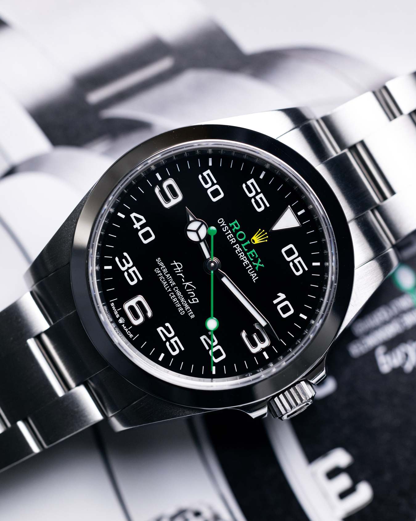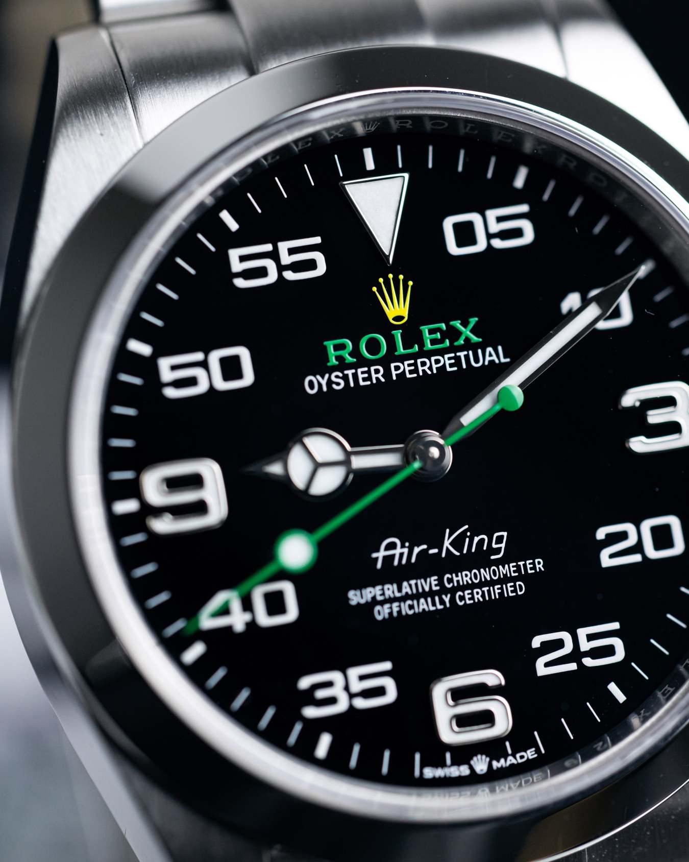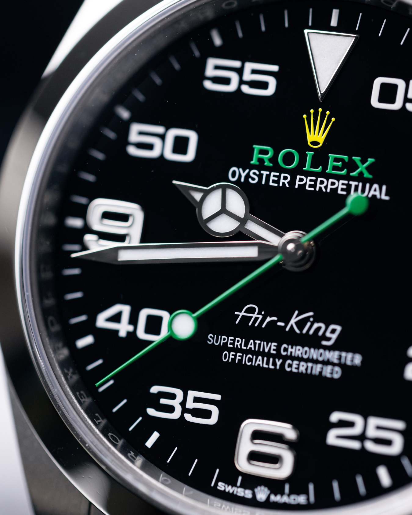 Featuring a distinctive black dial with a combination of large 3, 6, 9 numeral marking, The Air-King continues to uphold the aeronautical legacy established by the original Rolex Oyster.