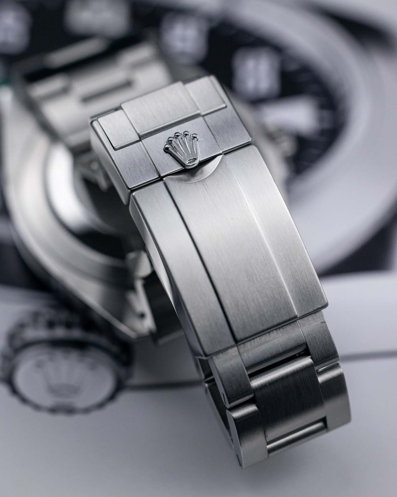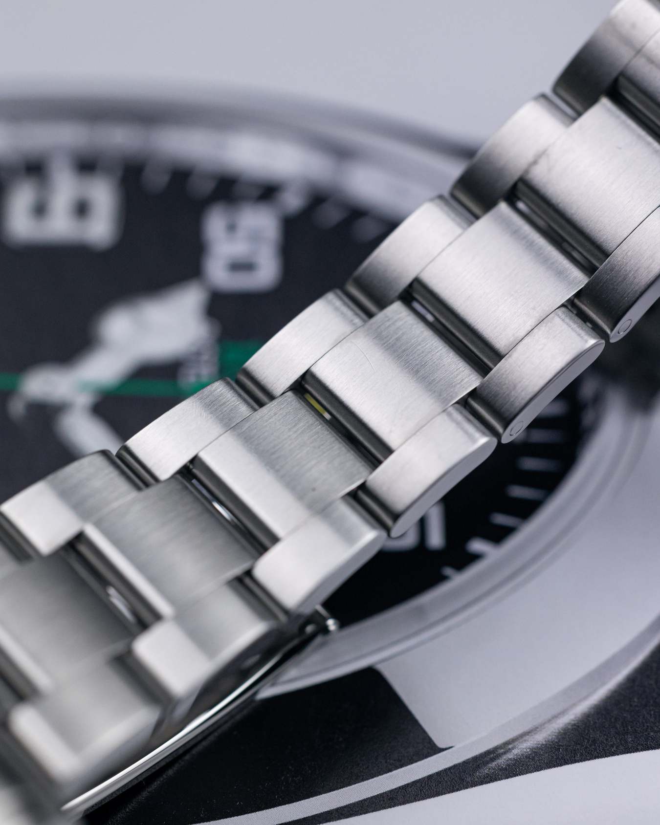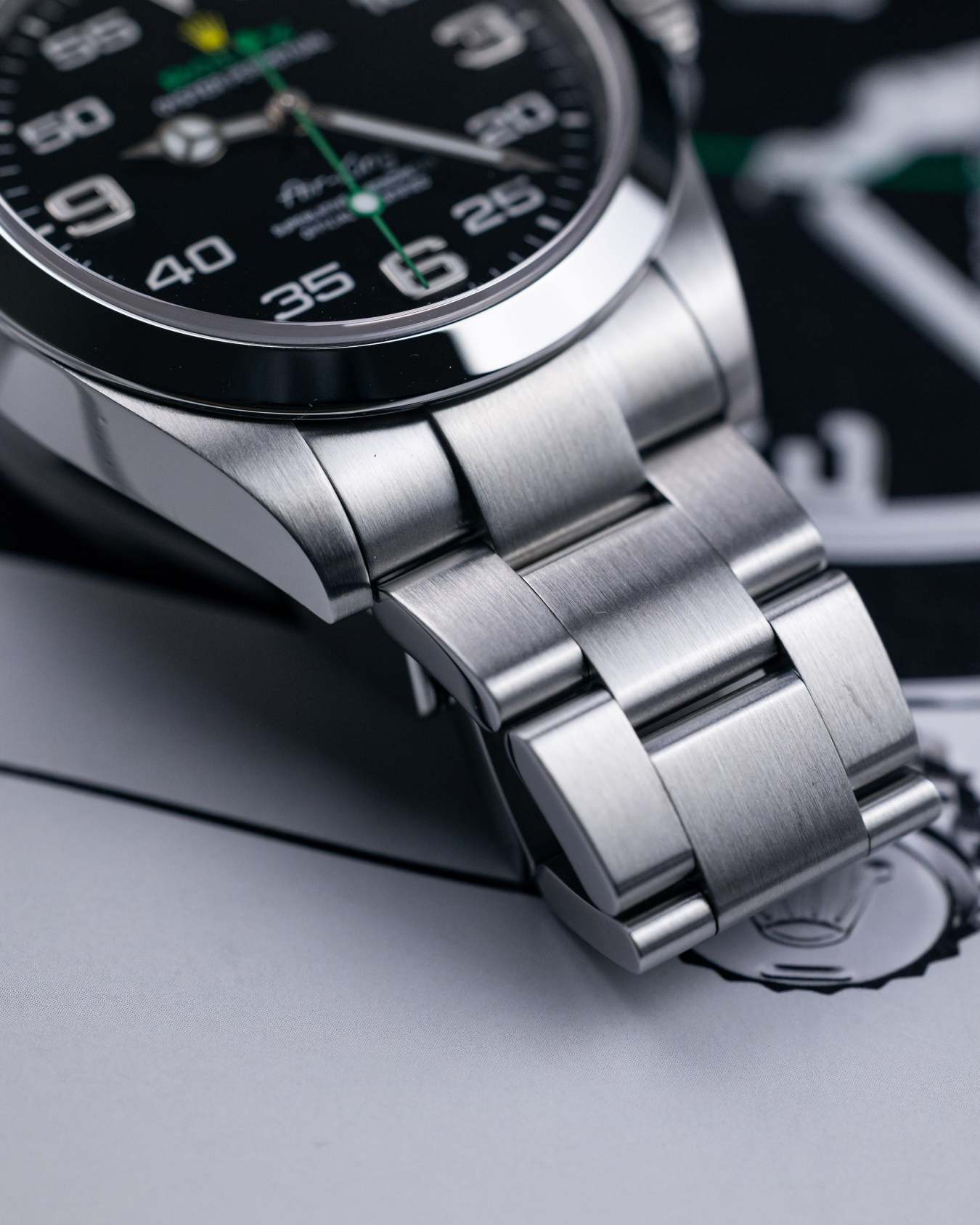 Featuring a distinctive black dial with a combination of large 3, 6, 9 numeral marking, The Air-King continues to uphold the aeronautical legacy established by the original Rolex Oyster.