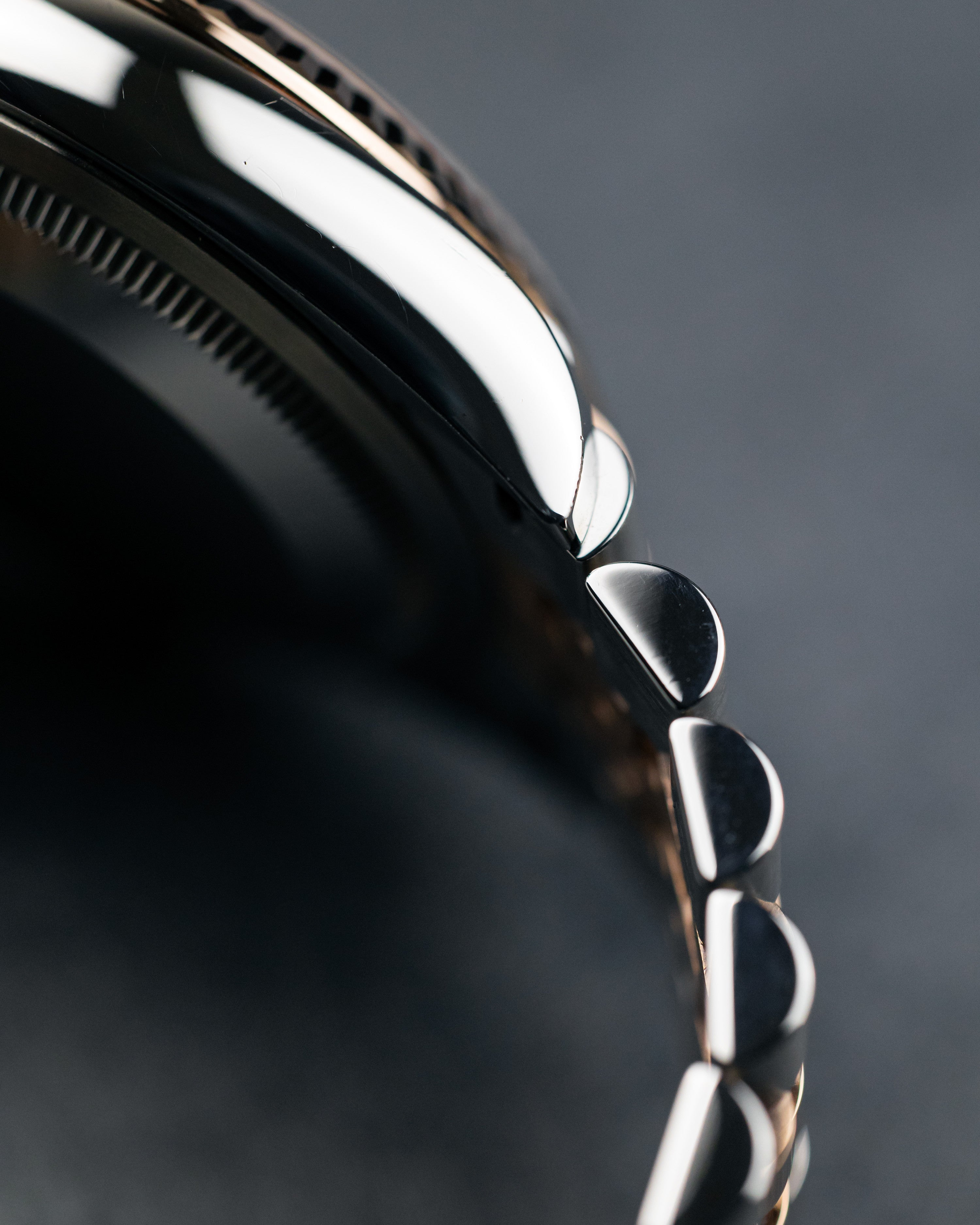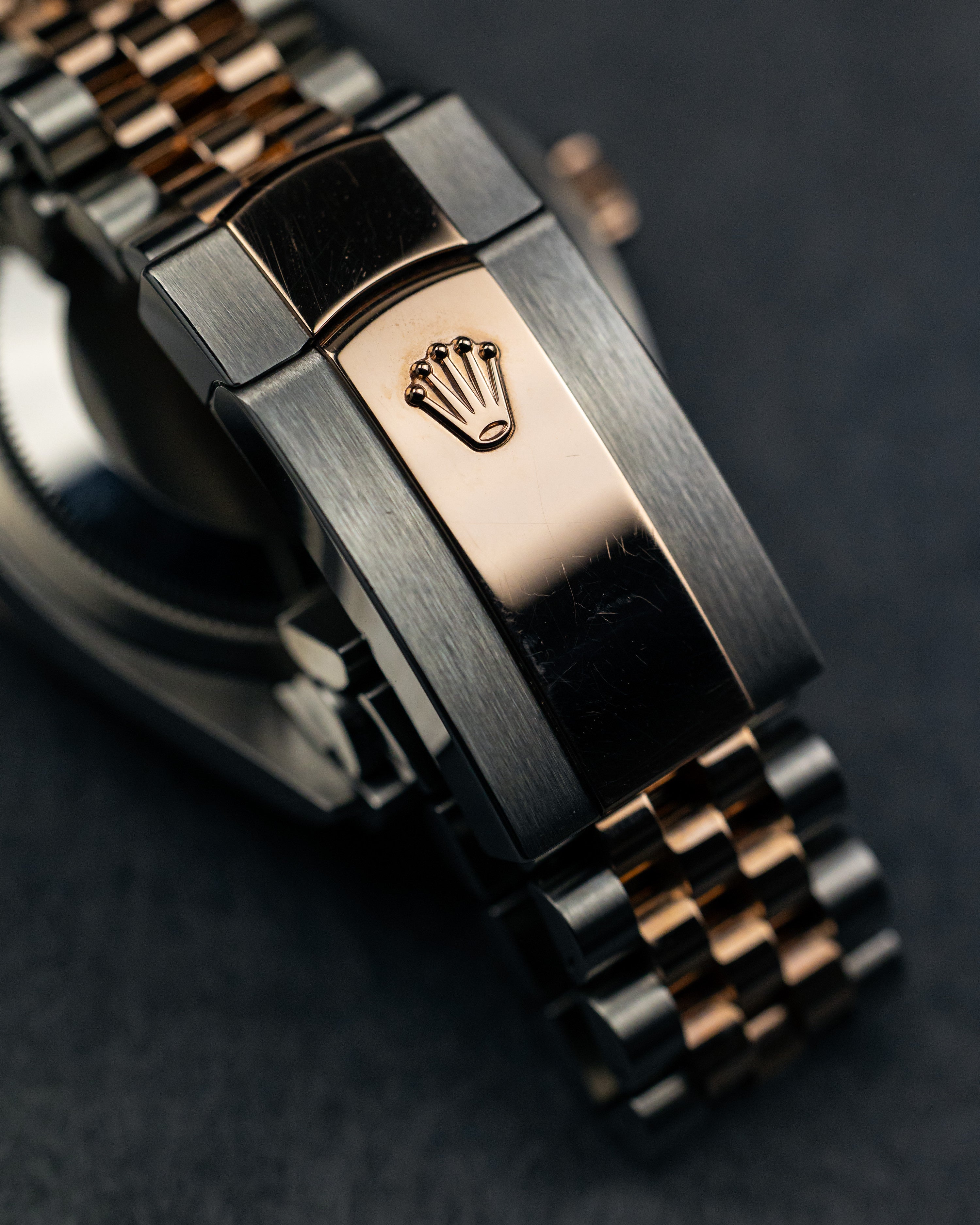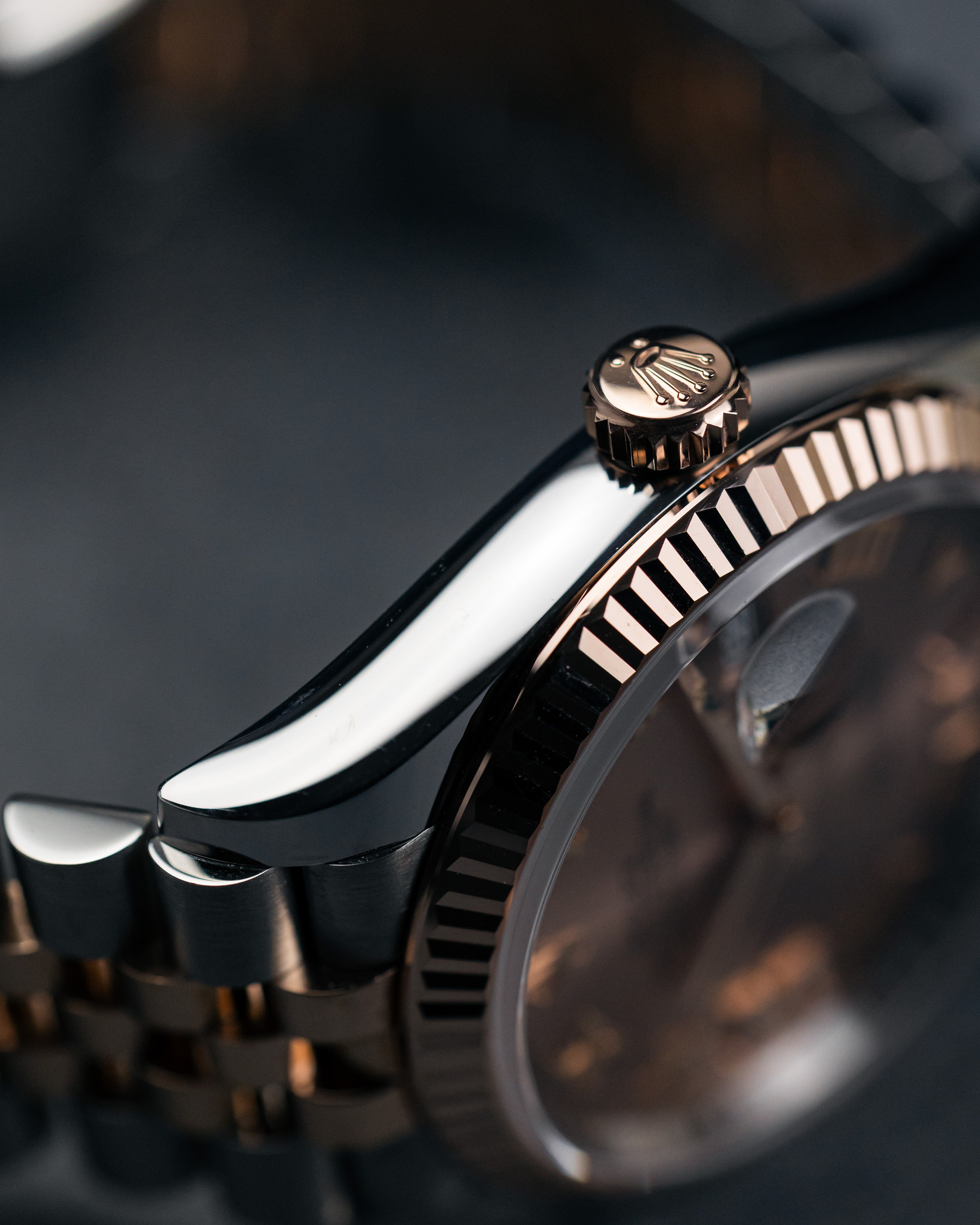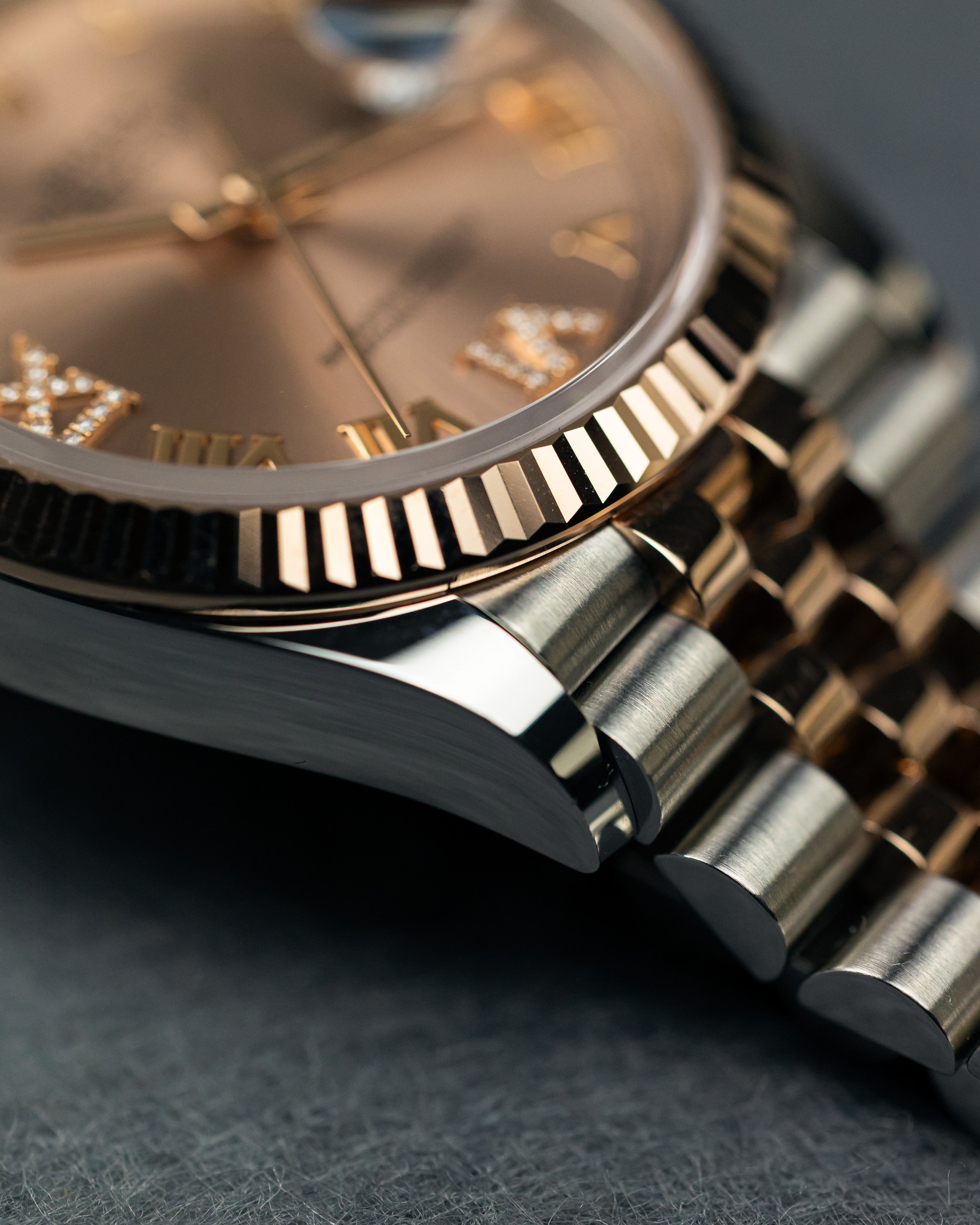 Everose Gold Hands With Roman Numeral Hour Markers and a Pave VI and IX With the Date Displayed, on a Rose Dial