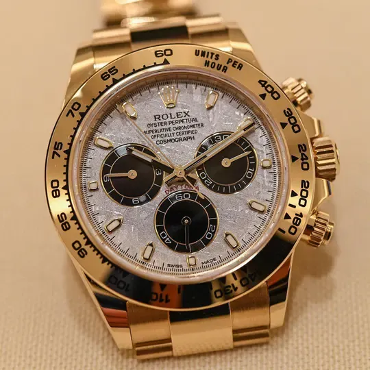 During its journey, the centre of the meteorite is gradually transformed, producing highly unusual metallic patterns, resulting from the very slow cooling of molten asteroid cores. The designers at Rolex create from these configurations a unique treasure for some of the most prestigious models, including this Cosmograph Daytona.
