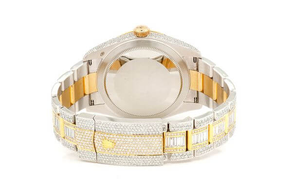 This iced out diamond watches Rolex DateJust is made of TwoTone and 42mm with 21.40ctw of Moissanite. This watch inside and out to Rolex quality standards.