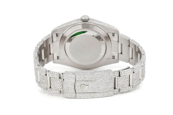 ROLEX ICED OUT DateJust is made of Silver and has a 41mm case size with 21.00ctw of Moissanite diamonds. Our expert watchmakers have serviced this watch inside and out to Rolex quality standards. This watch comes with an Rolex box.