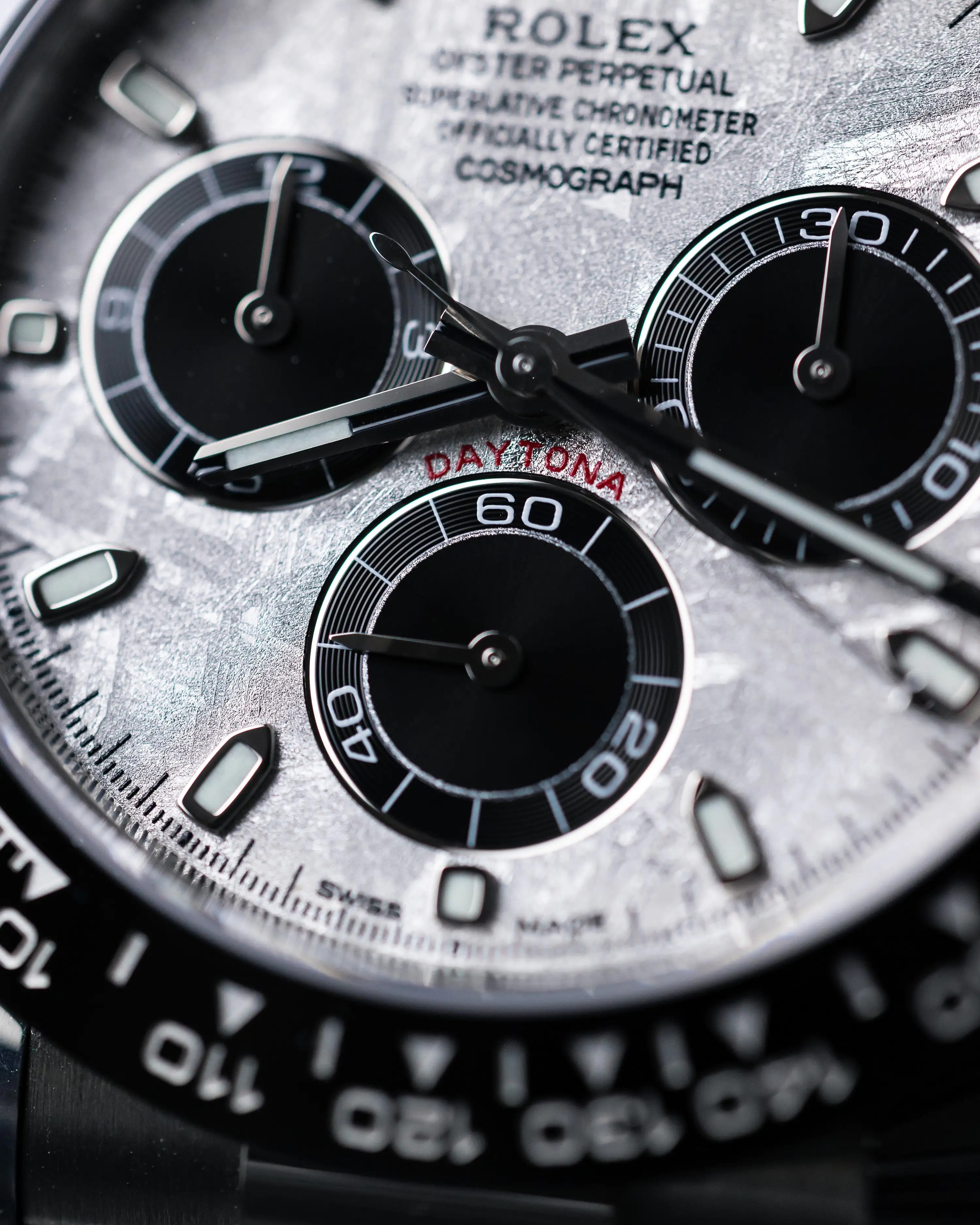 Meteorite comes from the heart of an asteroid or possibly even a planet that has exploded, propelling material across the Solar System until chance brings it into our planet��s orbit and gravity pulls it to Earth. During its journey, the centre of the meteorite is gradually transformed, producing highly unusual metallic patterns, resulting from the very slow cooling of molten asteroid cores. The designers at Rolex create from these configurations a unique treasure for some of the most prestigious models, including this Cosmograph Daytona.
