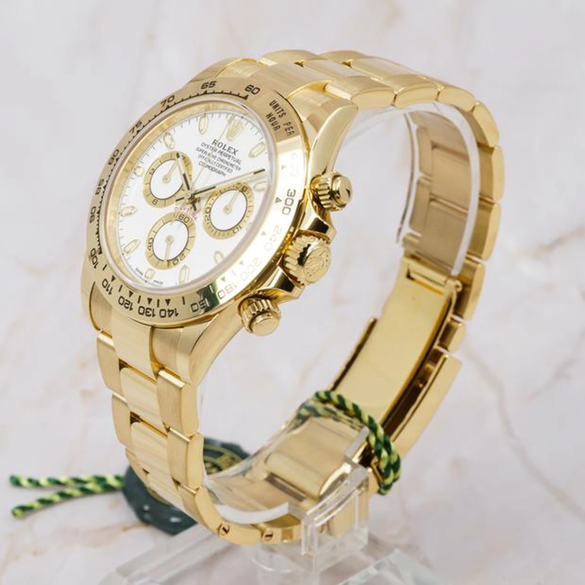 With its tachymetric scale, its three counters and its pushers, the Cosmograph Daytona was designed to be the ultimate timing tool for endurance racing drivers. The bezel features a tachymetric scale to read average speed over a given distance based on elapsed time.