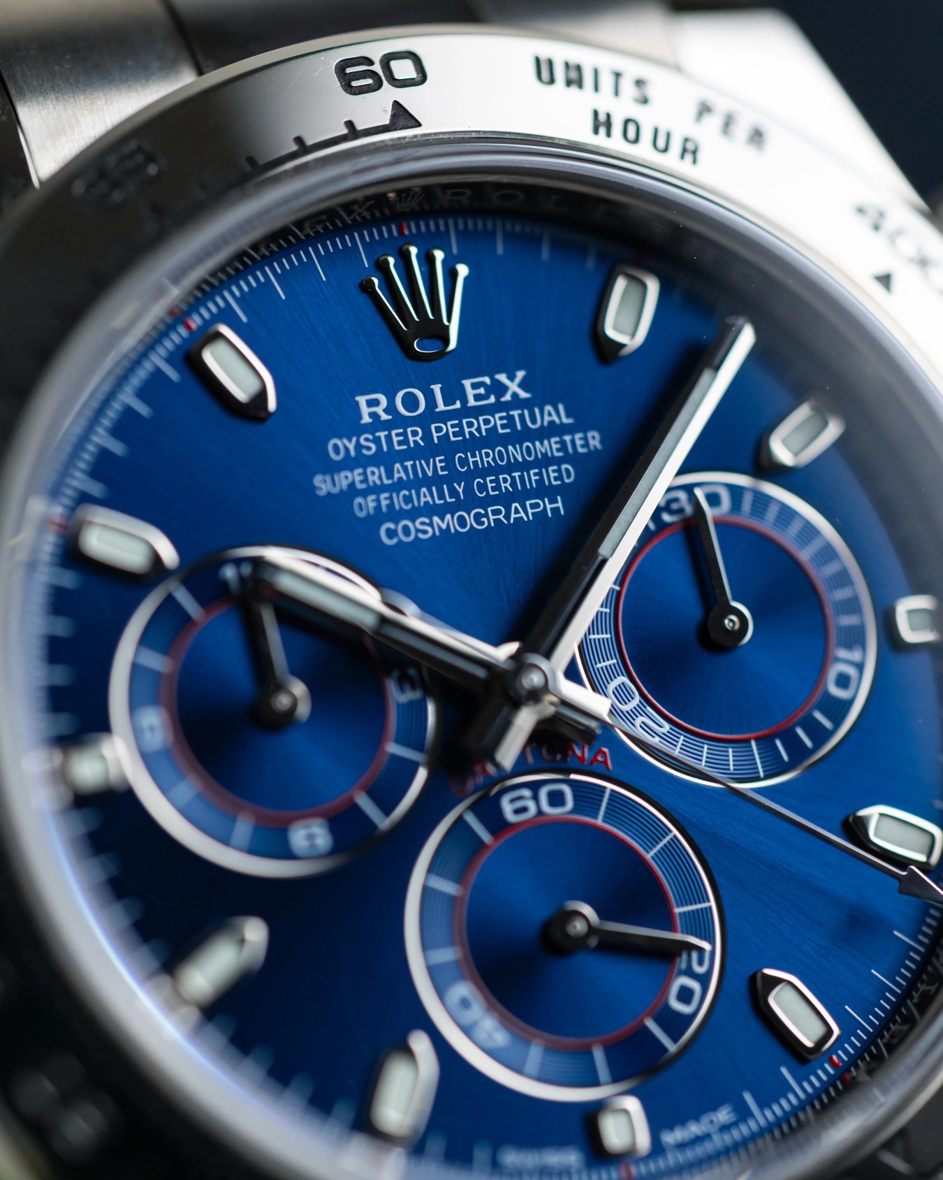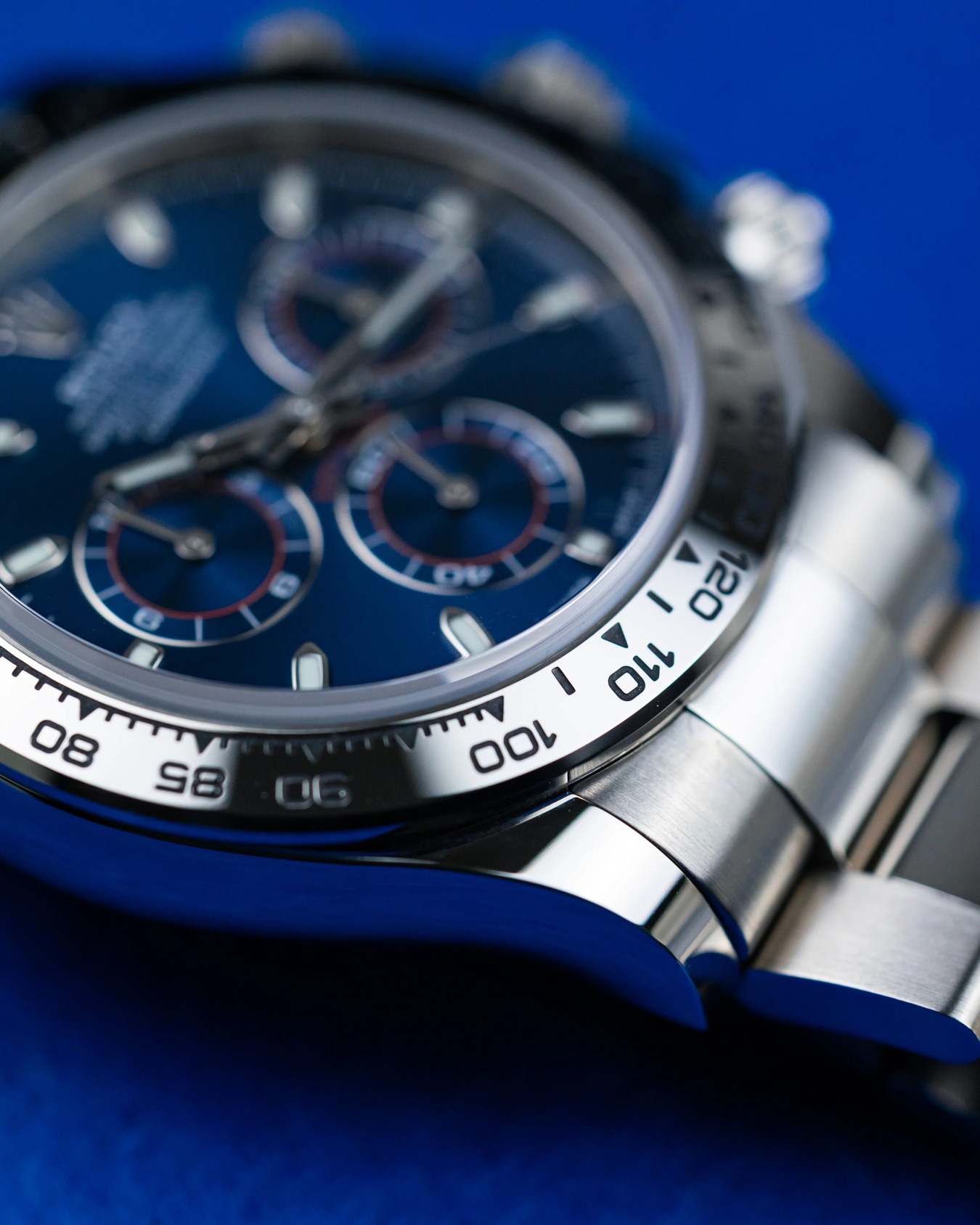 With its tachymetric scale, its three counters and its pushers, the Cosmograph Daytona was designed to be the ultimate timing tool for endurance racing drivers. The bezel features a tachymetric scale to read average speed over a given distance based on elapsed time. This scale offers optimal legibility, making the Cosmograph Daytona the ideal instrument for measuring speeds up to 400 units per hour, expressed in kilometres or miles.