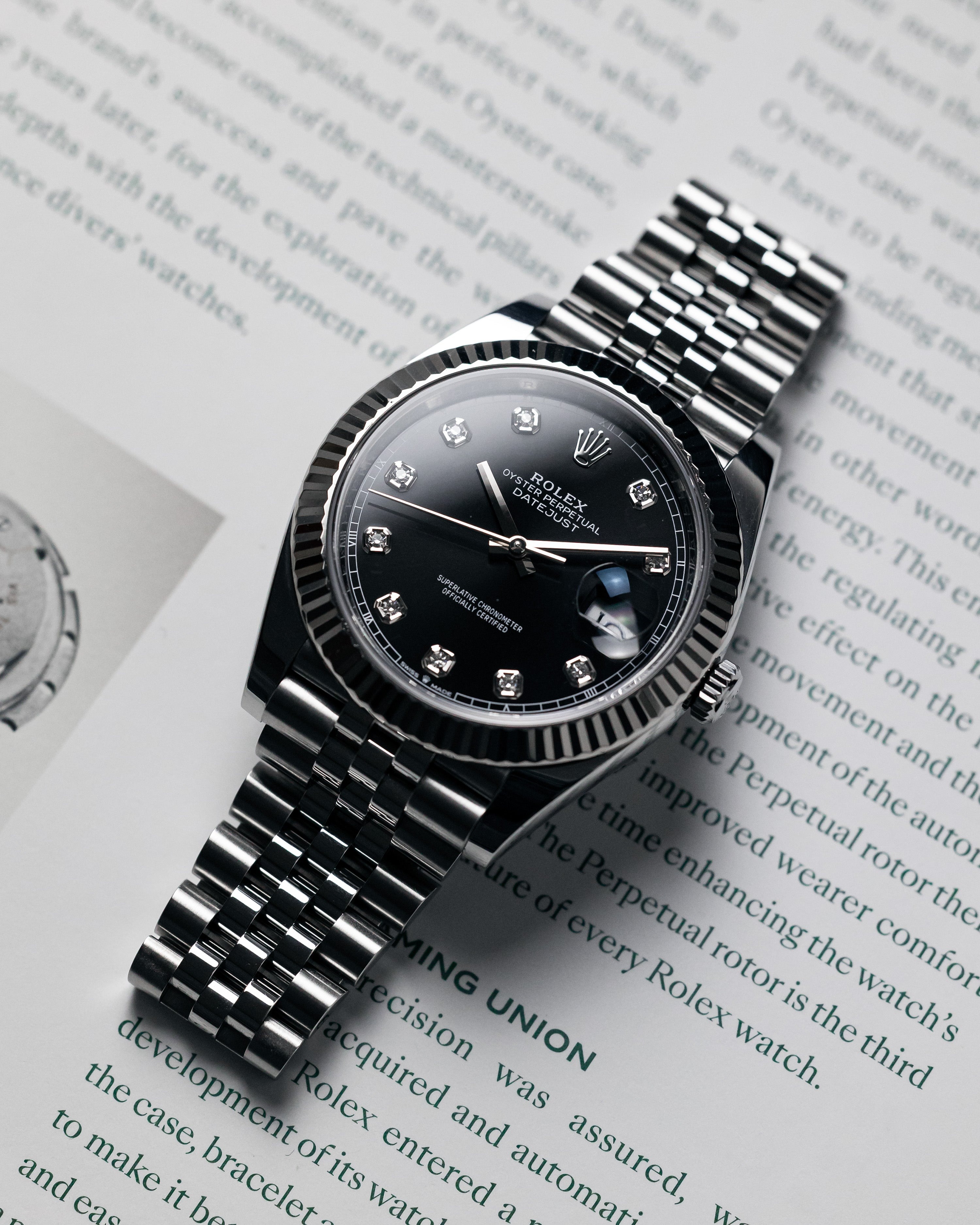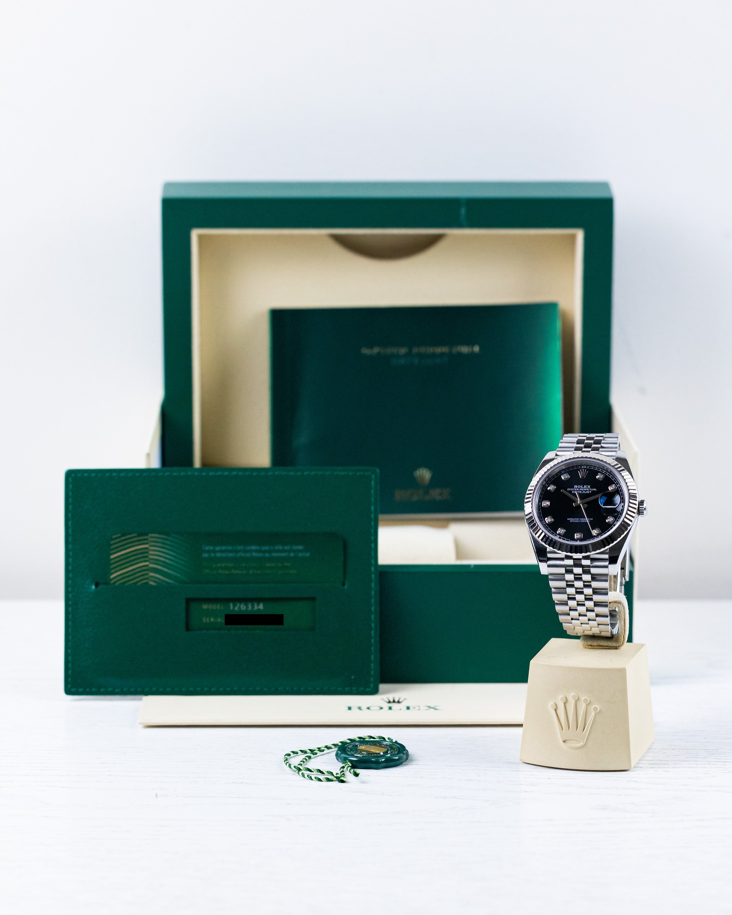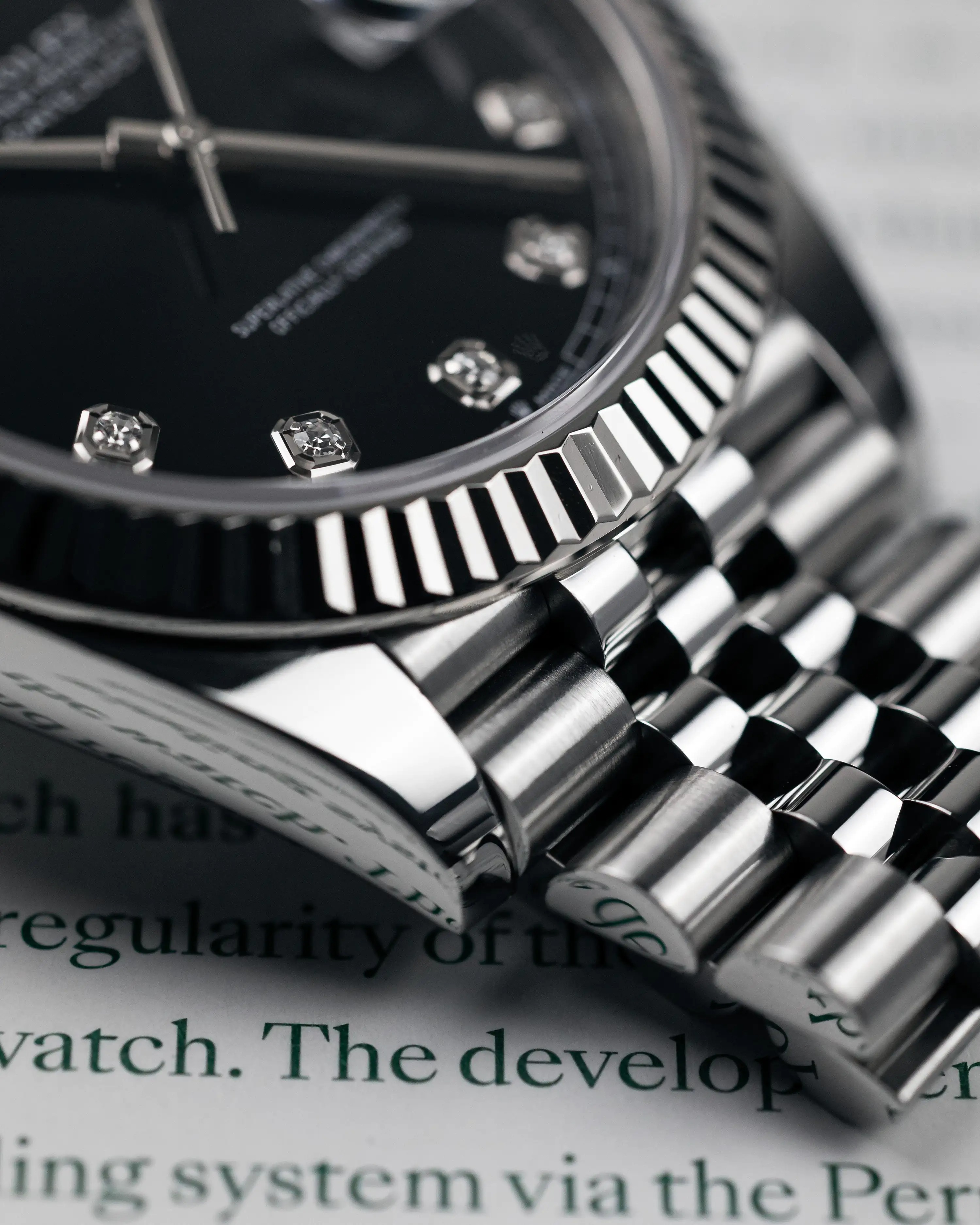 This Rolex Datejust 126334 replica watch is a stunning piece of craftsmanship. It features a 904L stainless steel case and bezel, with a black dial and gem-set indices. The movement is an automatic caliber 3235 with a 60-hour power reserve and precision of -3/+3 seconds per day within COSC certification limits. The second hand has a sweep motion. The bracelet is an adjustable 904L stainless steel Oyster with a fold clasp.