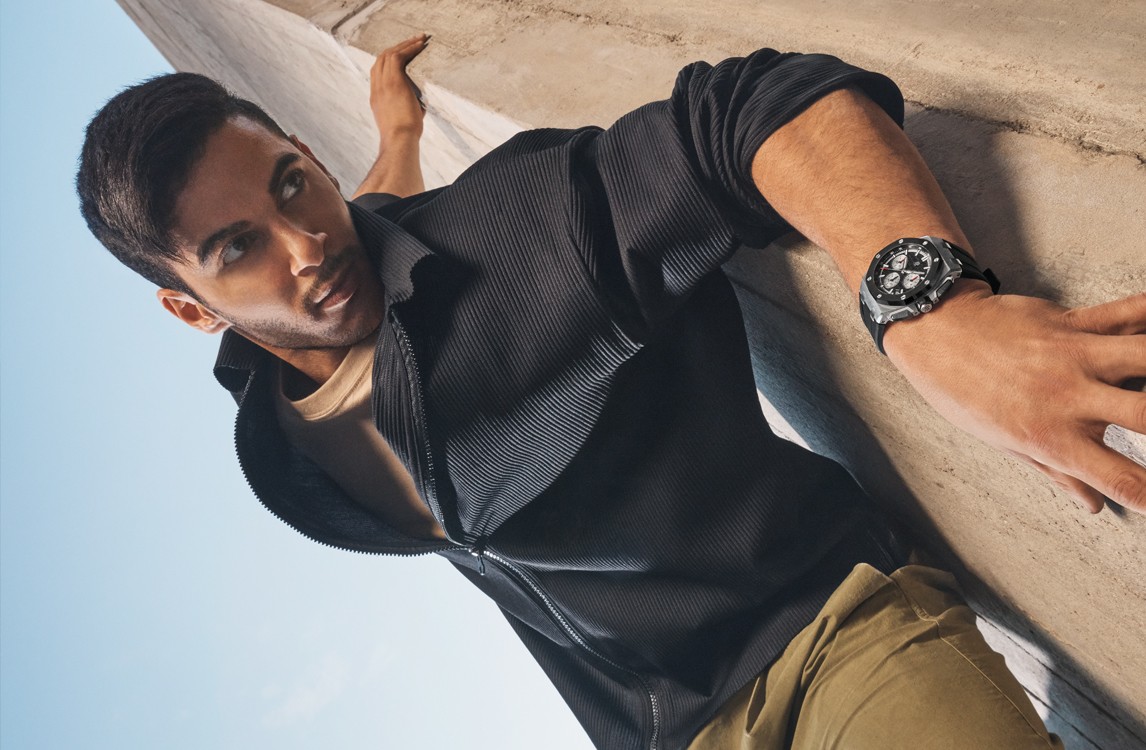 Black dial with ��M茅ga Tapisserie�� pattern, rhodium-toned counters and external zone, white gold applied hour-markers and Royal�Oak hands with luminescent coating, black inner bezel