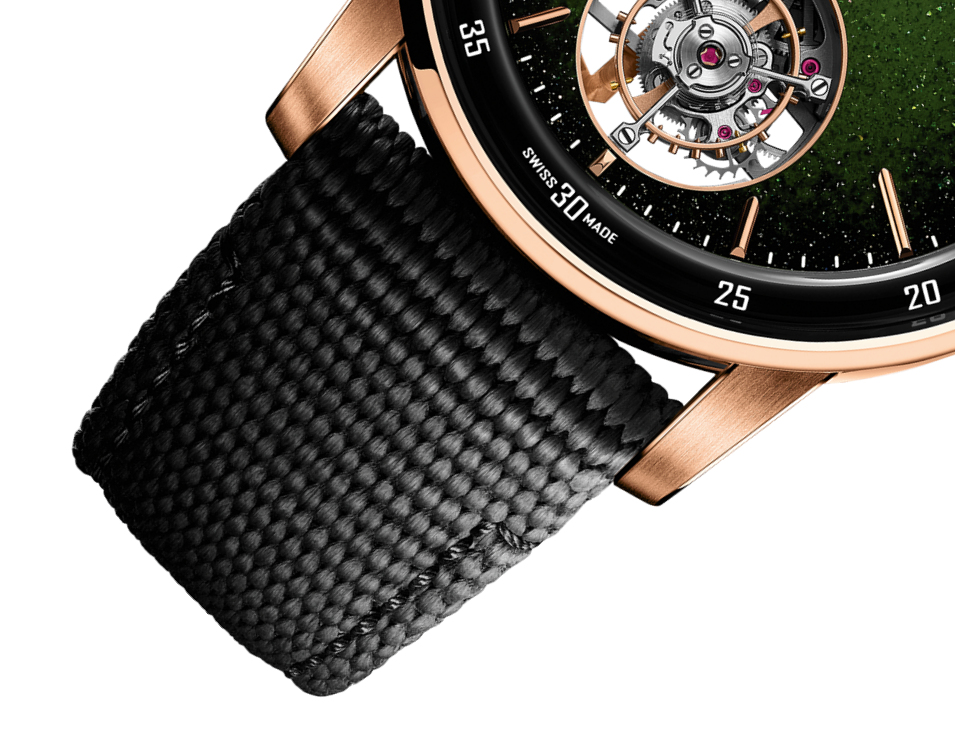 Smoked green enamelled aventurine creates a magical backdrop for this pink gold and black ceramic flying tourbillon timepiece that is a symbol of watchmaking excellence.