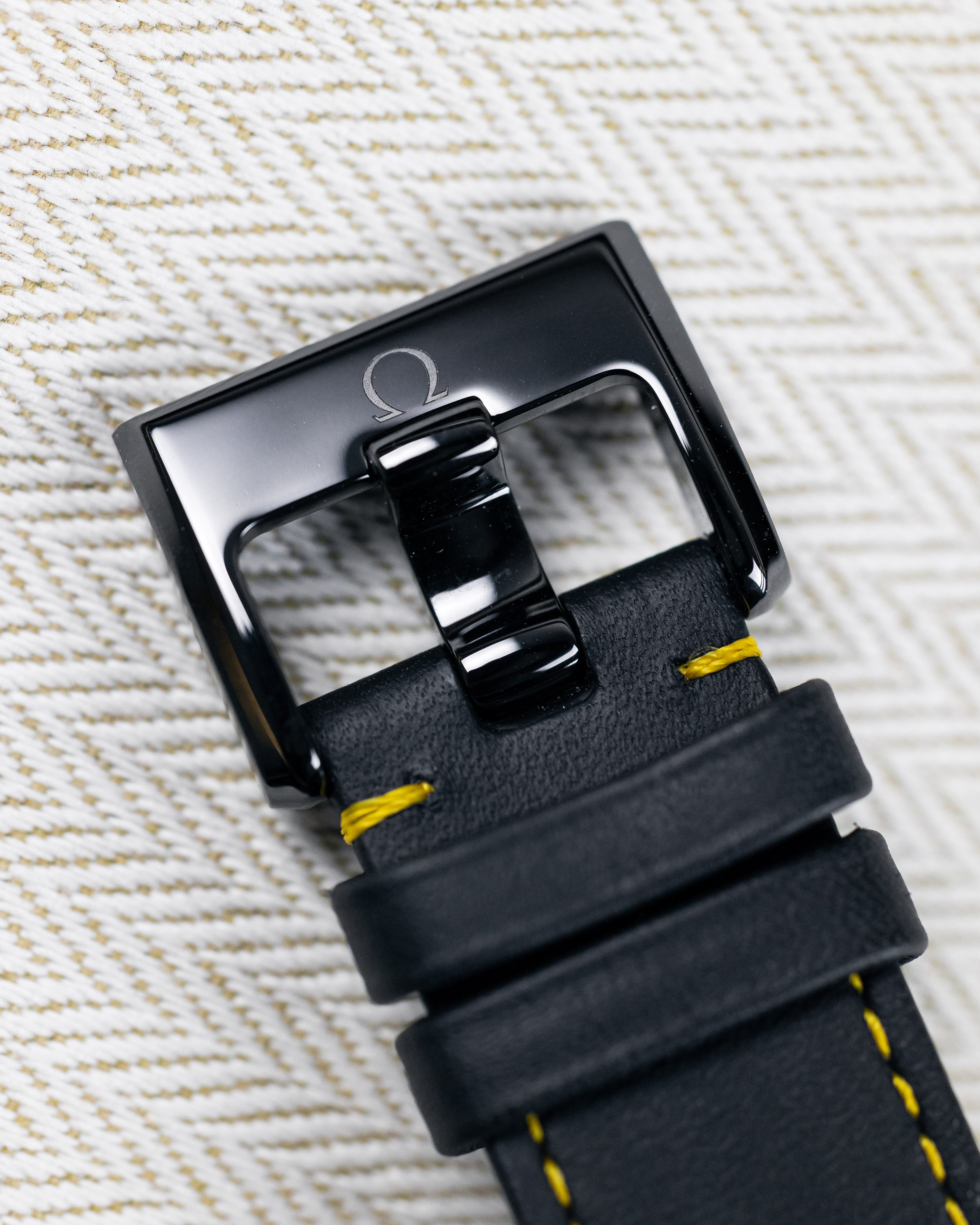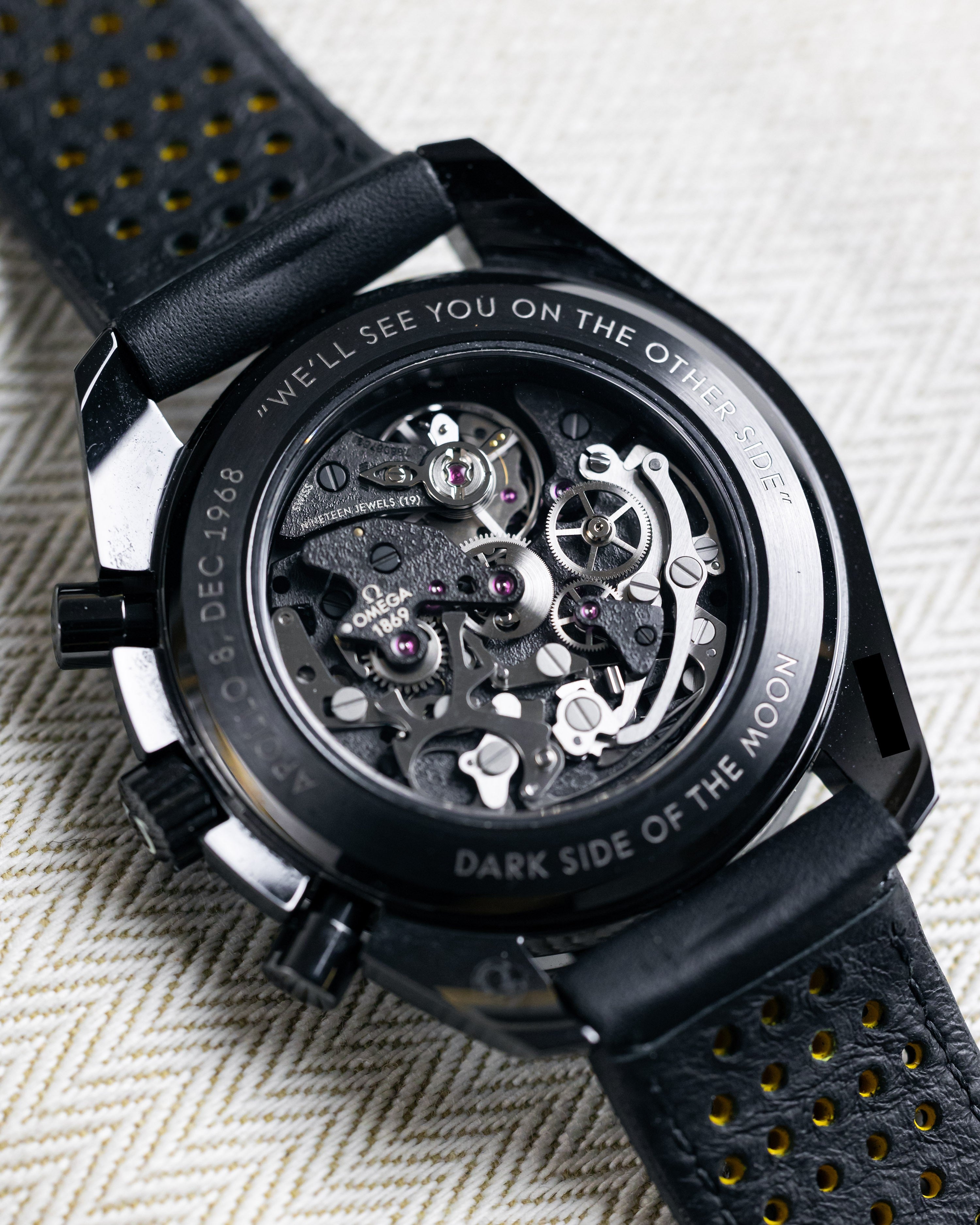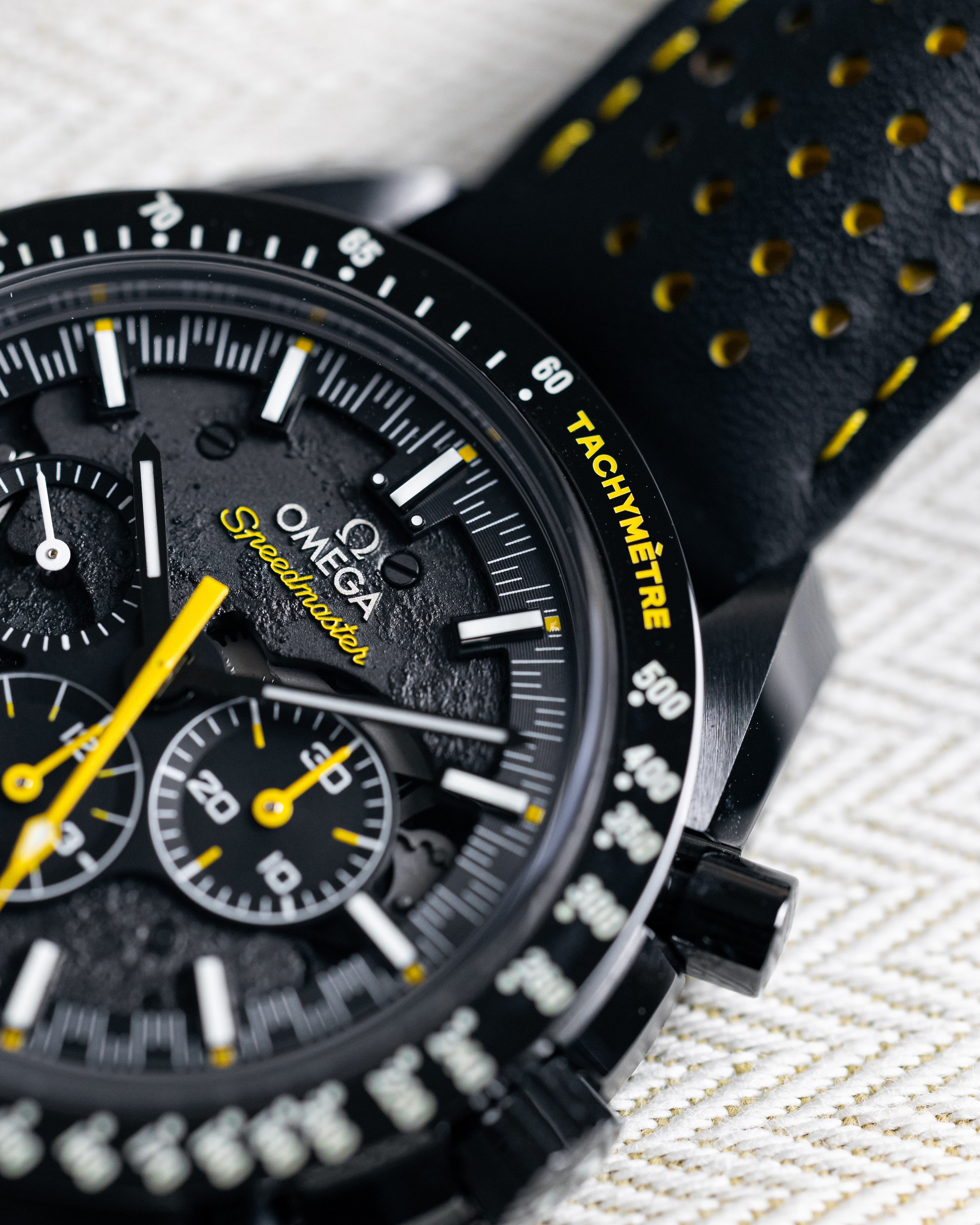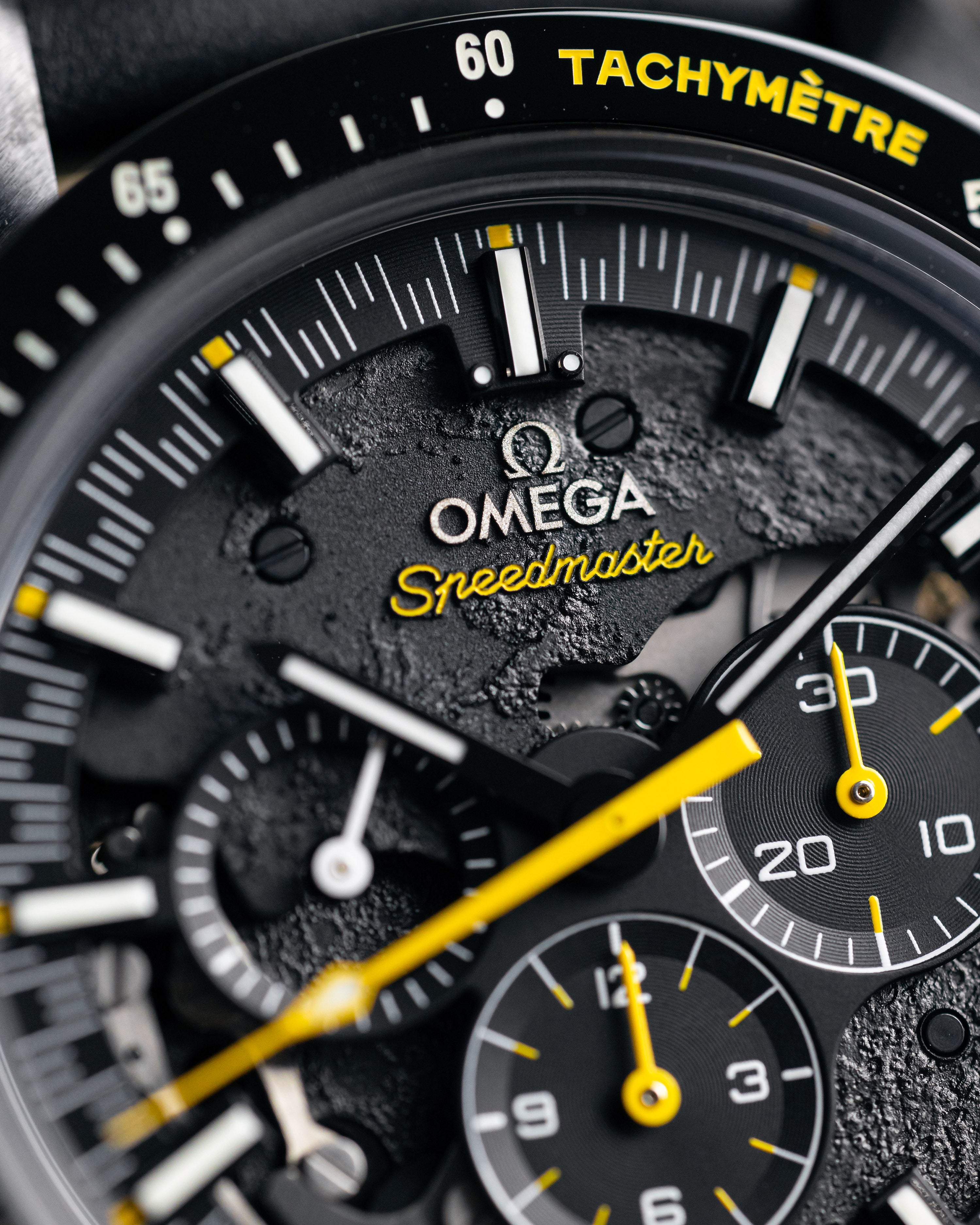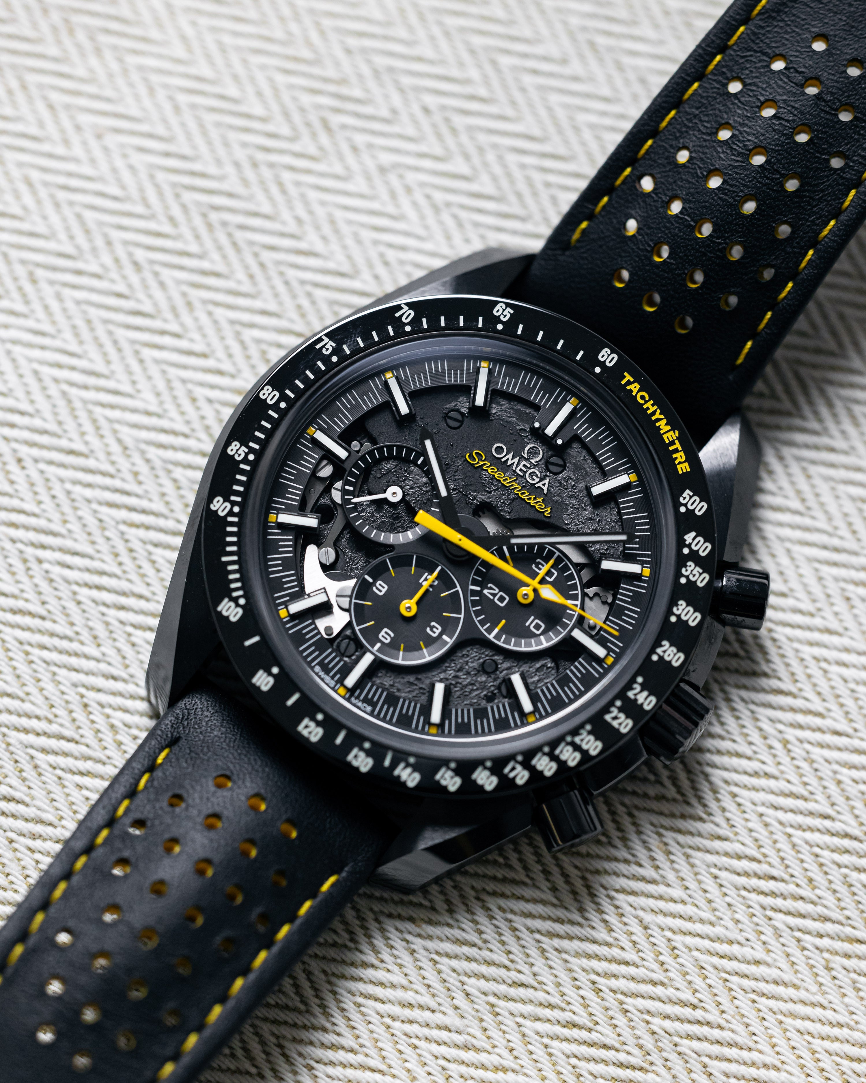 On a perforated black leather strap with yellow rubber through the middle, 44mm full black ceramic case, semi-skeletonised dial that carries a laser illustration of the Moon’s surface.