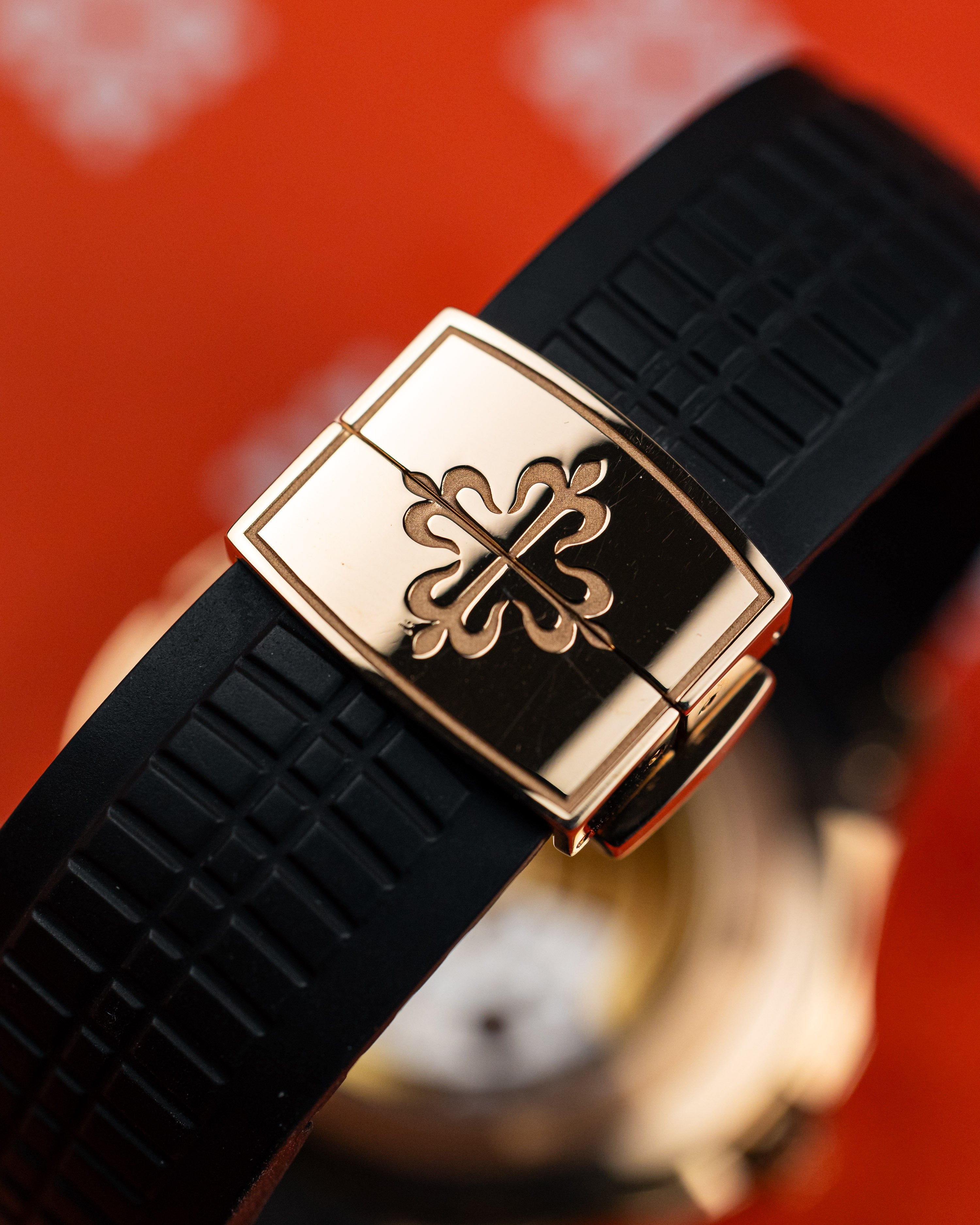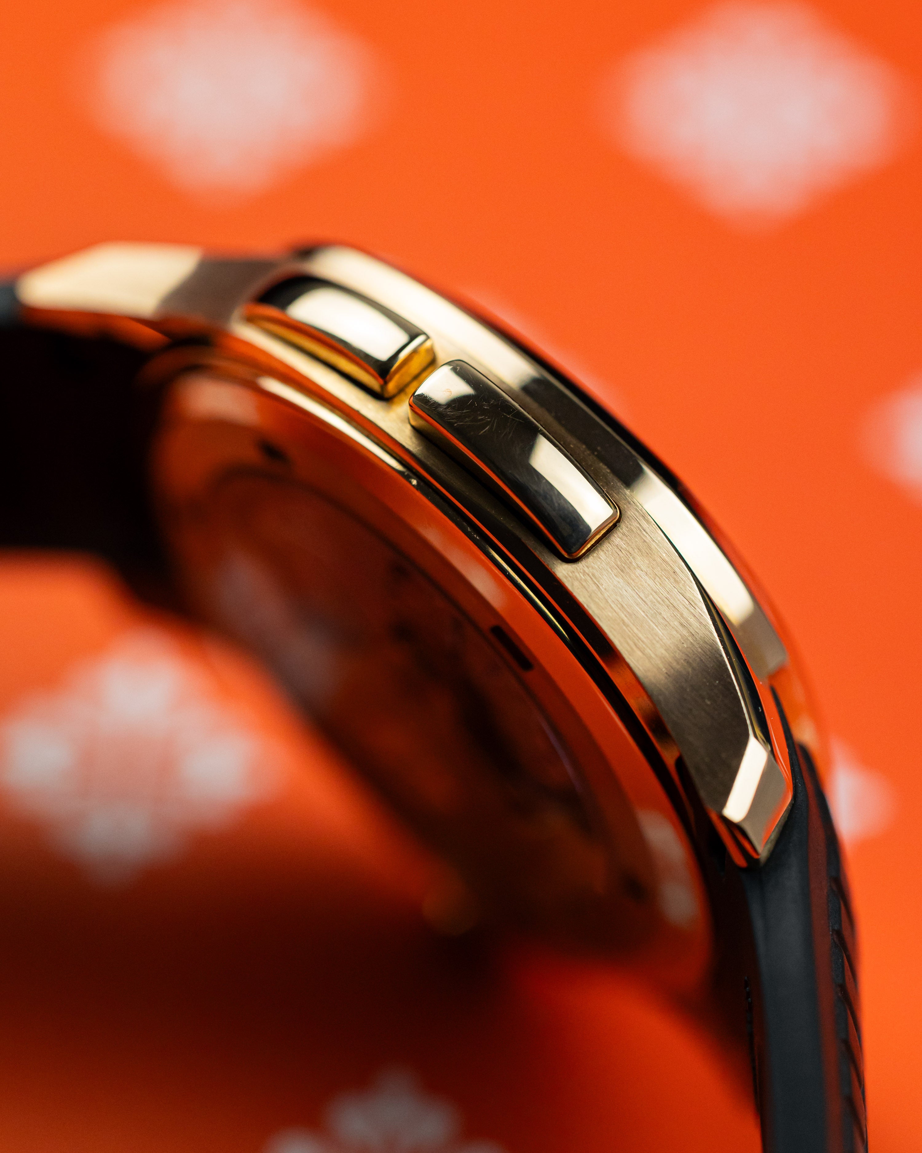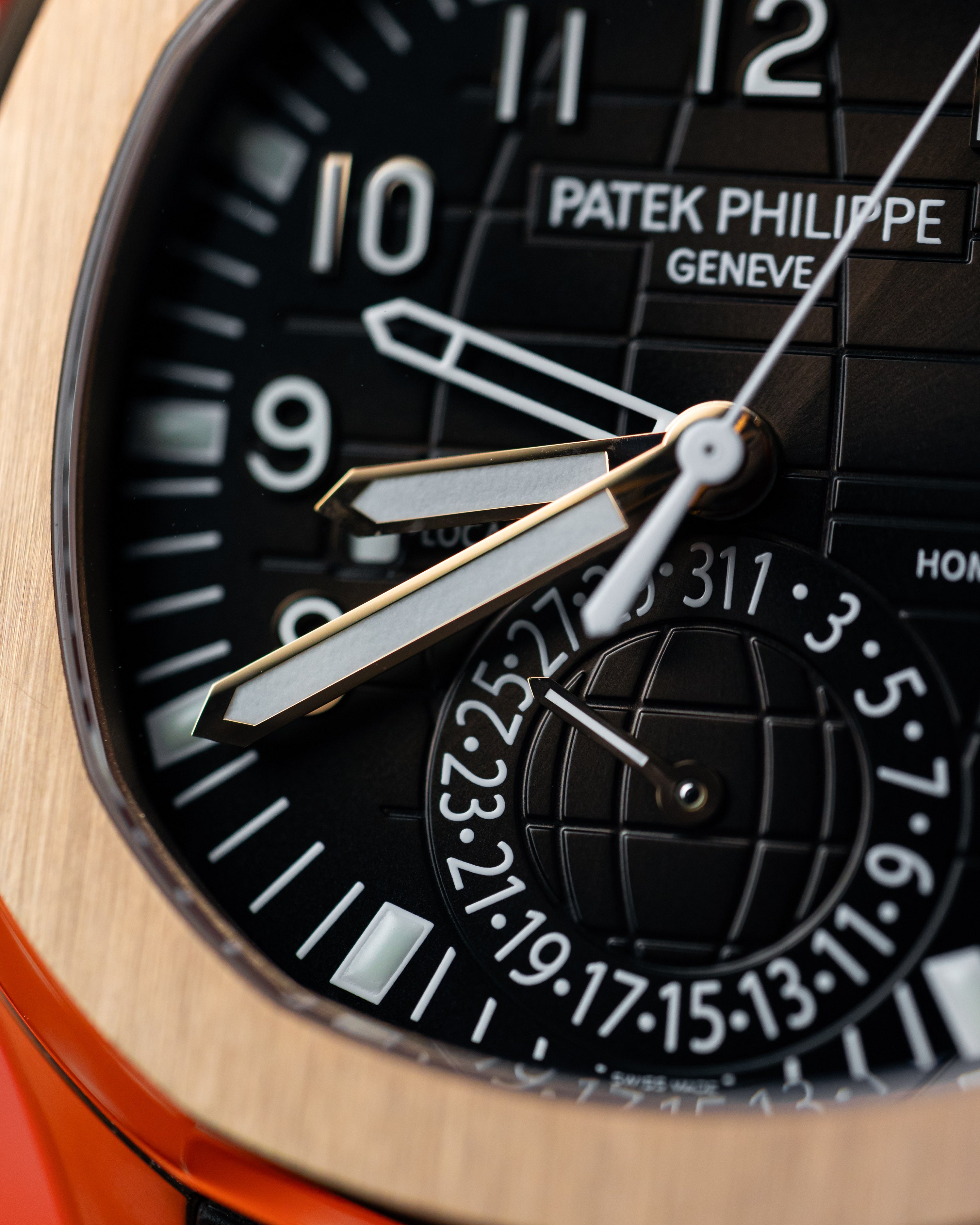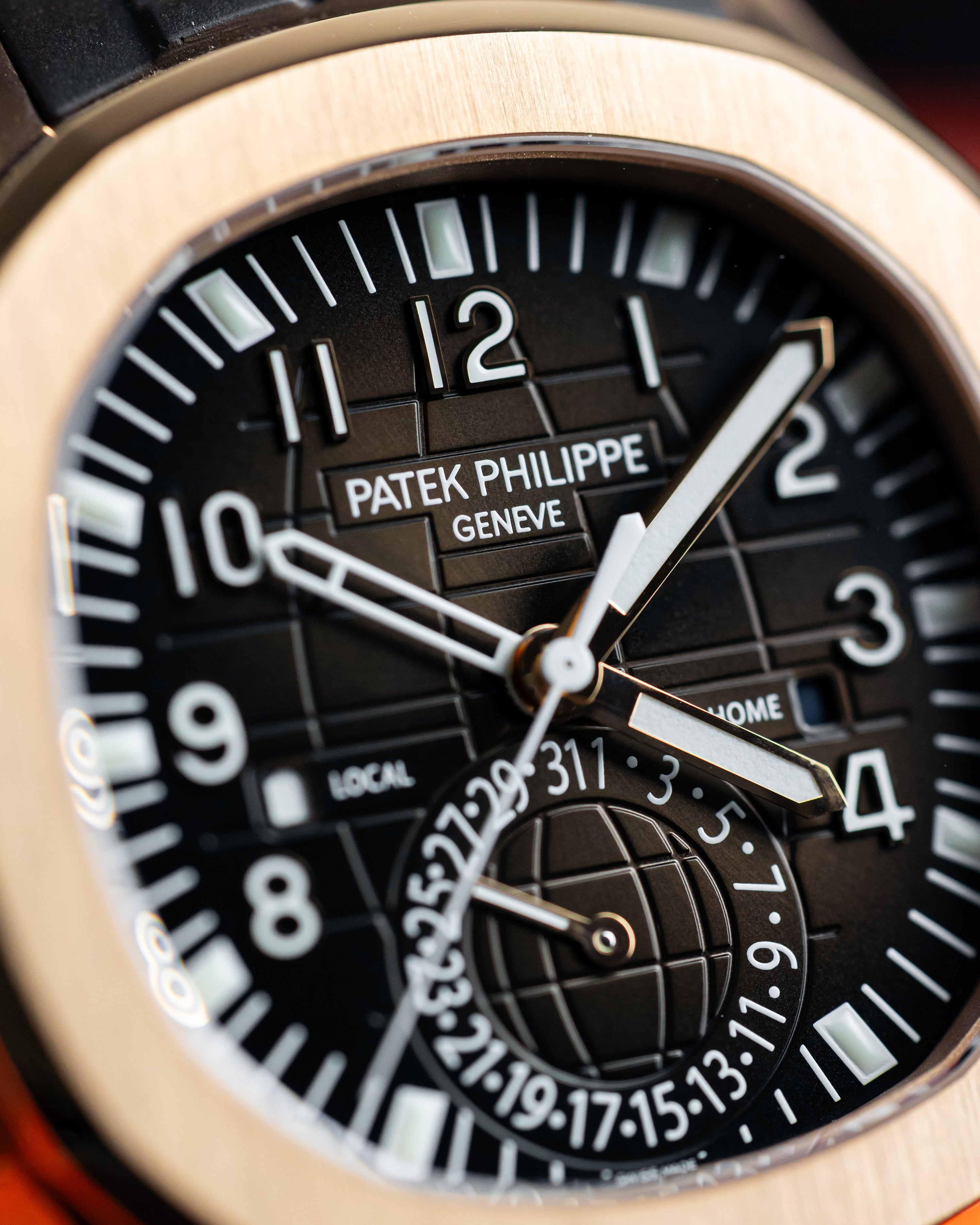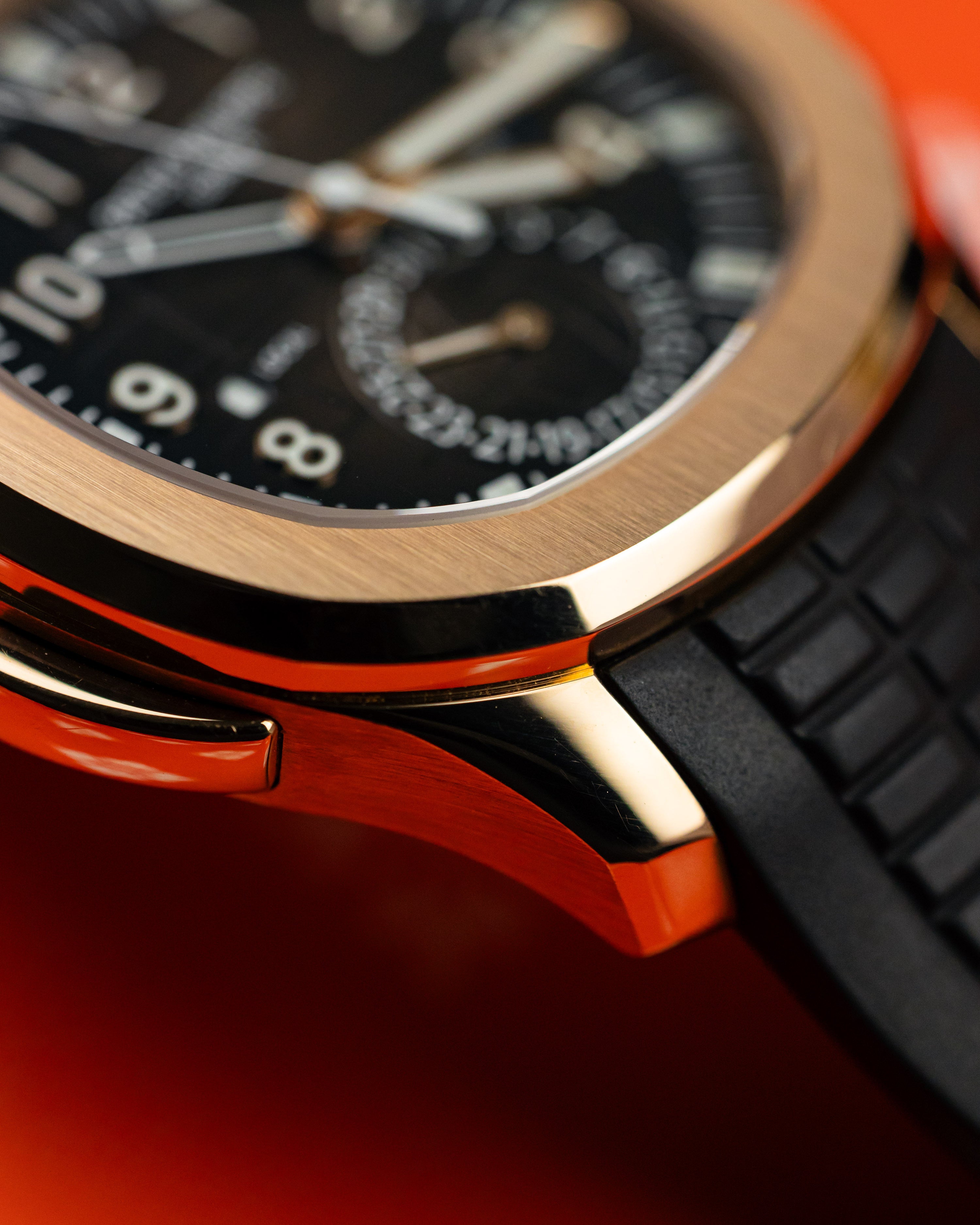 Perfect travel sports watch combining both style and functionality. Encased in 18k rose gold, warm brown dial with matching rubber strap.
