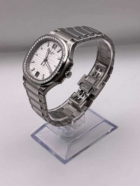 The Patek Philippe Ladies Nautilus wristwatch features a round octagonal shape diamond-set bezel and 35mm stainless steel construction. In the center, lays a silver embossed dial. It is finished with a stainless steel bracelet and fold-over clasp endowed with a new adjustment system, providing the wearer with between 2 and 4 mm of extra bracelet length for increased comfort.
