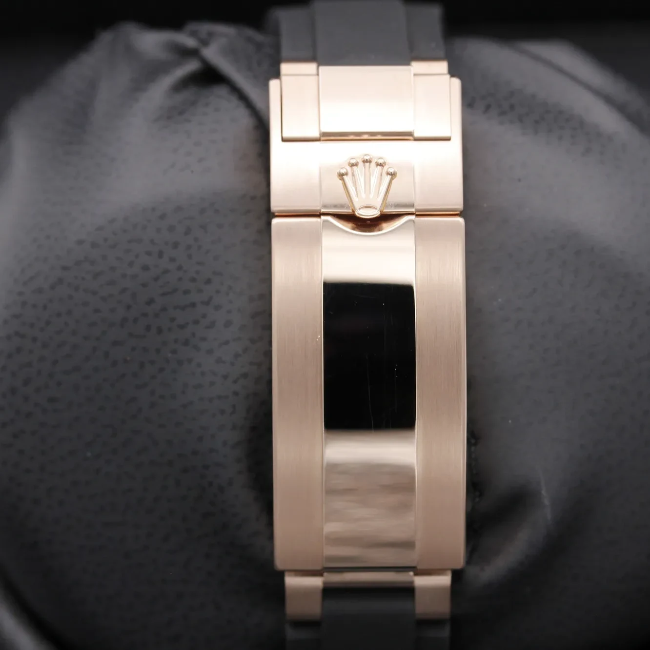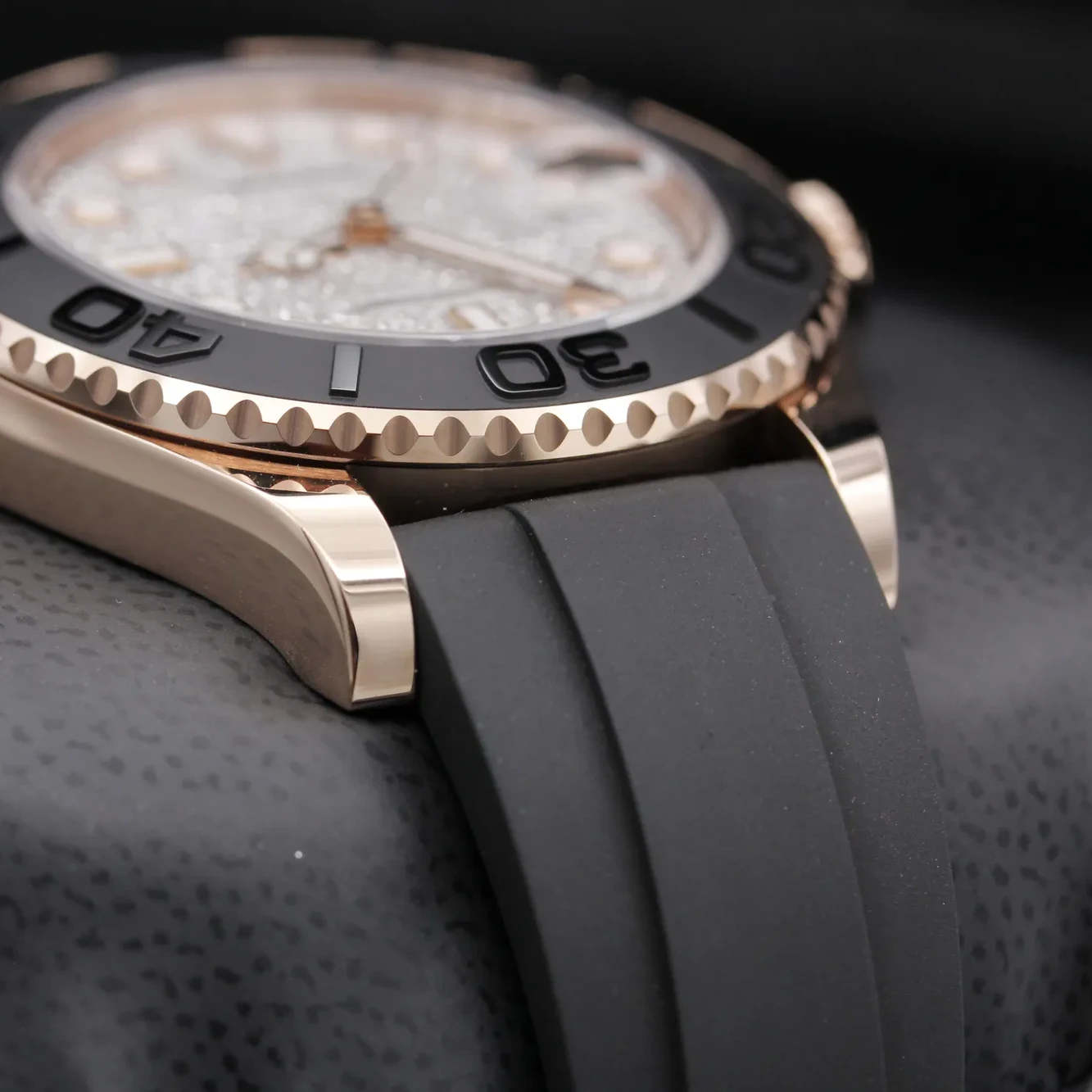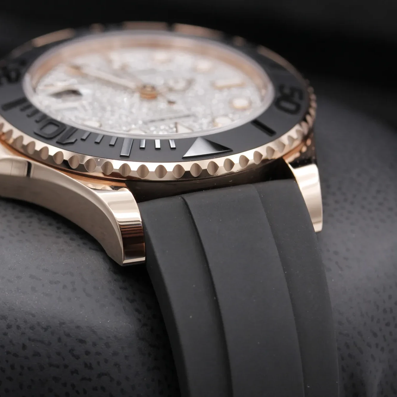 The Yacht-Master's new Oysterflex bracelet, developed by Rolex and patented, offers a sporty alternative to metal bracelets. The bracelet attaches to the watch case and the Oysterlock safety clasp by a flexible titanium and nickel alloy metal blade. The blade is overmoulded with high-performance black elastomer which is particularly resistant to environmental effects, very durable and perfectly inert for the wearer of the watch. For enhanced comfort, the inside of the Oysterflex bracelet is equipped with a patented longitudinal cushion system that stabilizes the watch on the wrist and fitted with an 18 ct Everose gold Oysterlock safety clasp. It also features the Rolex Glidelock extension system, designed by the brand and patented. This inventive toothed mechanism, integrated beneath the clasp, allows fine adjustment of the bracelet length by some 15 mm in increments of approximately 2.5 mm, without the use of tools.